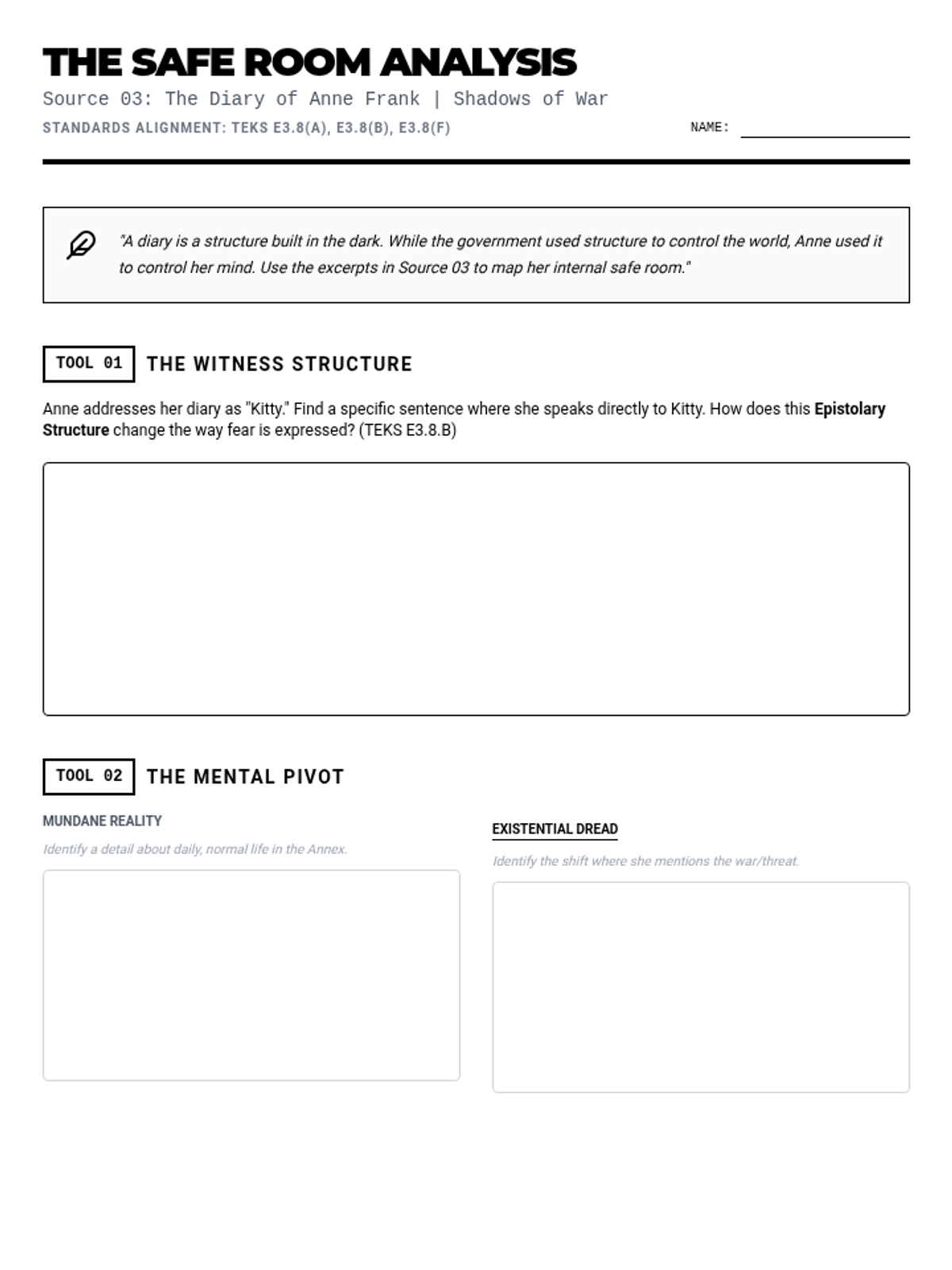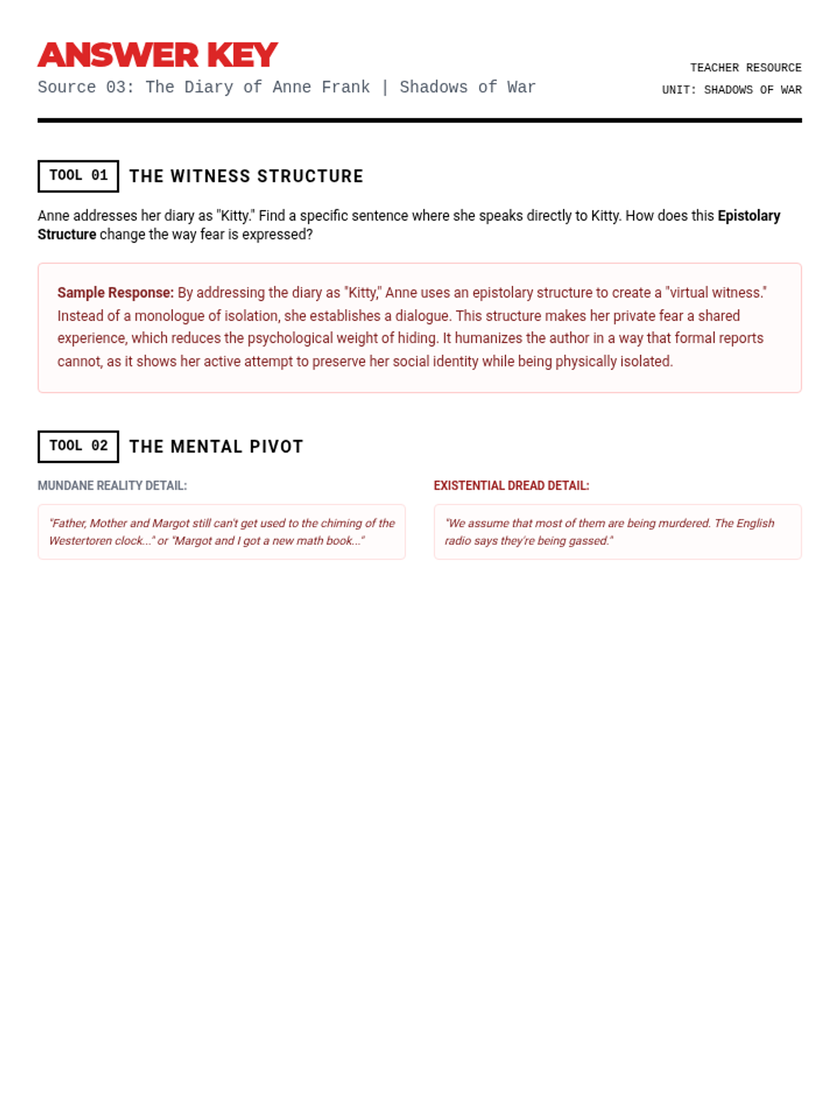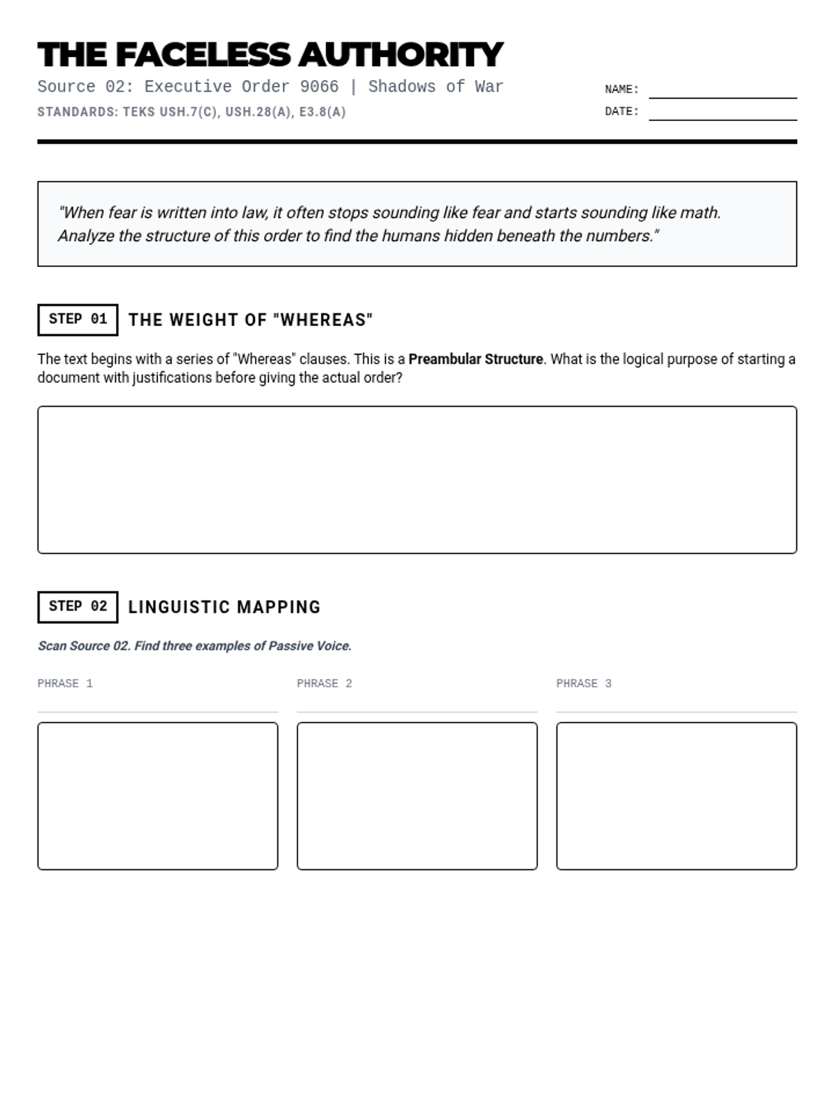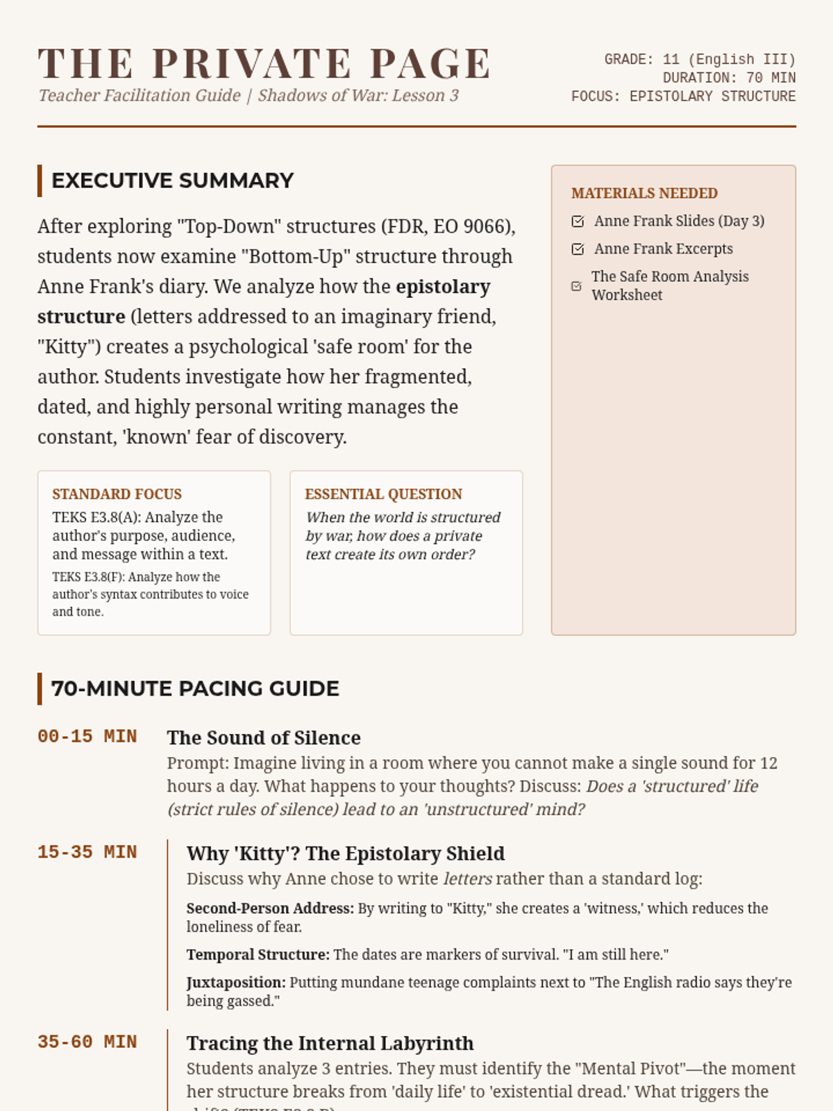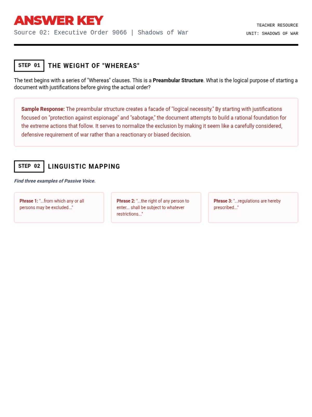 A 4-part unit for 11th-grade English/History analyzing text structure and author's purpose through the lens of fear and the unknown during WWII, examining political rhetoric, legal orders, personal diaries, and wartime superstition.