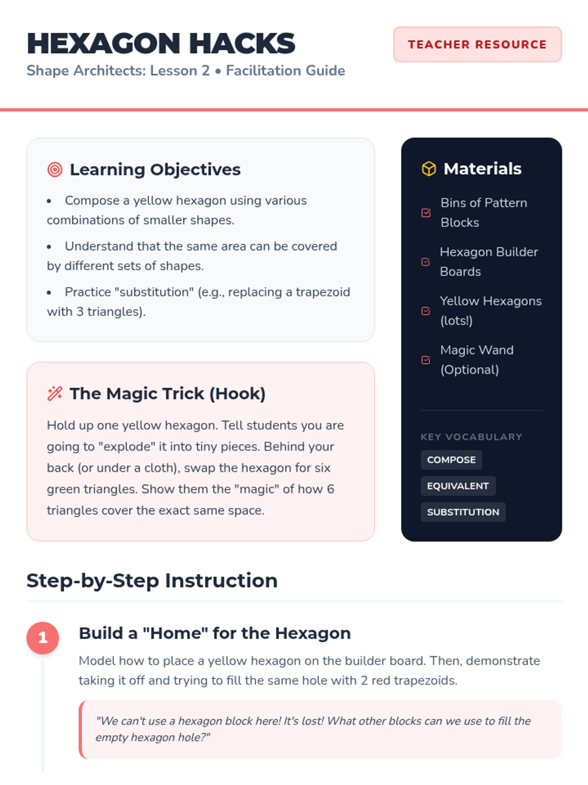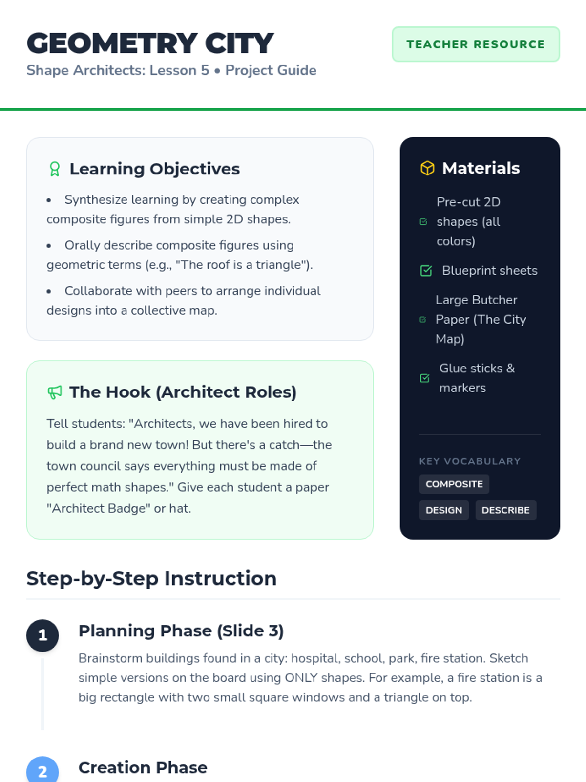 Students explore spatial reasoning through composing and decomposing 2D shapes using pattern blocks, tangrams, and paper cutting. They progress from simple puzzle filling to designing a geometric city, developing cognitive flexibility and geometric intuition.