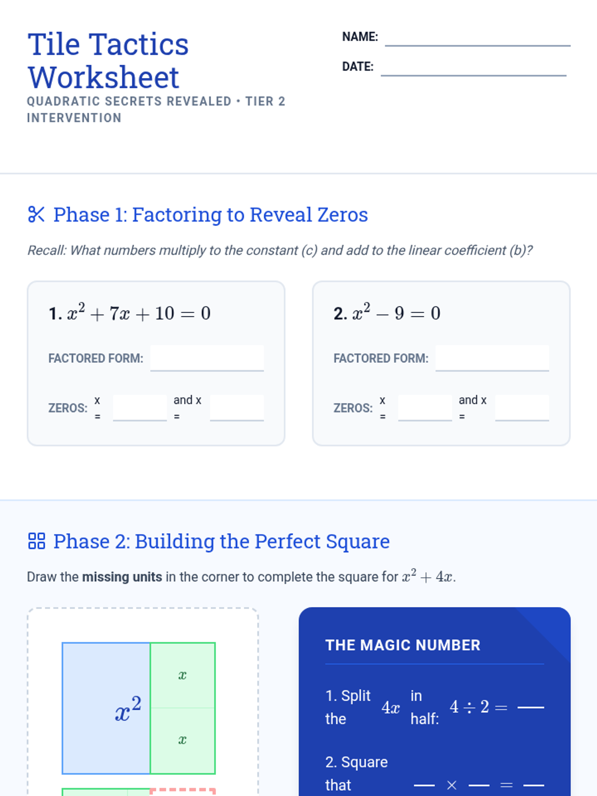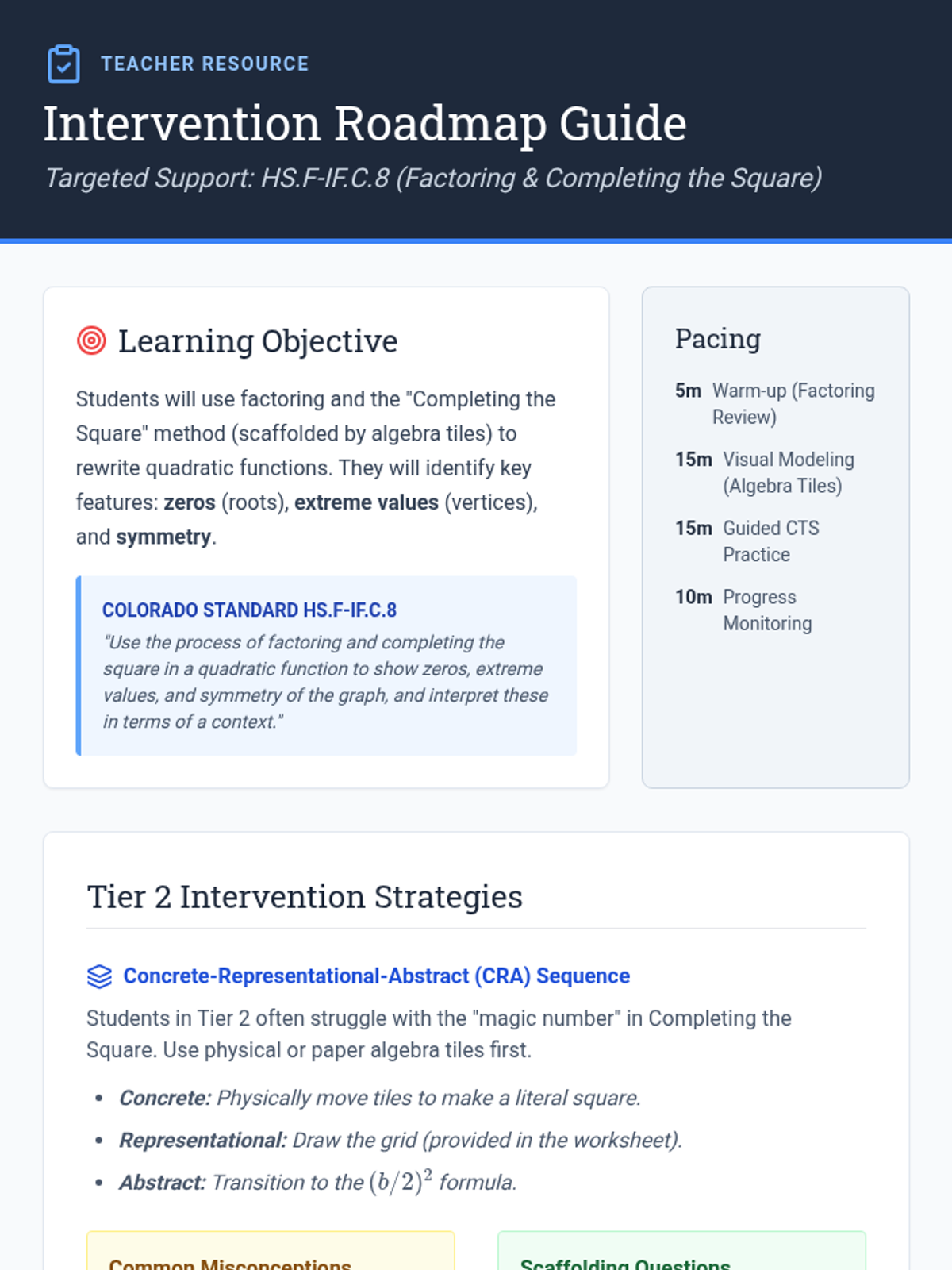 A targeted Tier 2 intervention sequence focused on helping high school students master quadratic transformations through factoring and completing the square using visual algebra tile models.