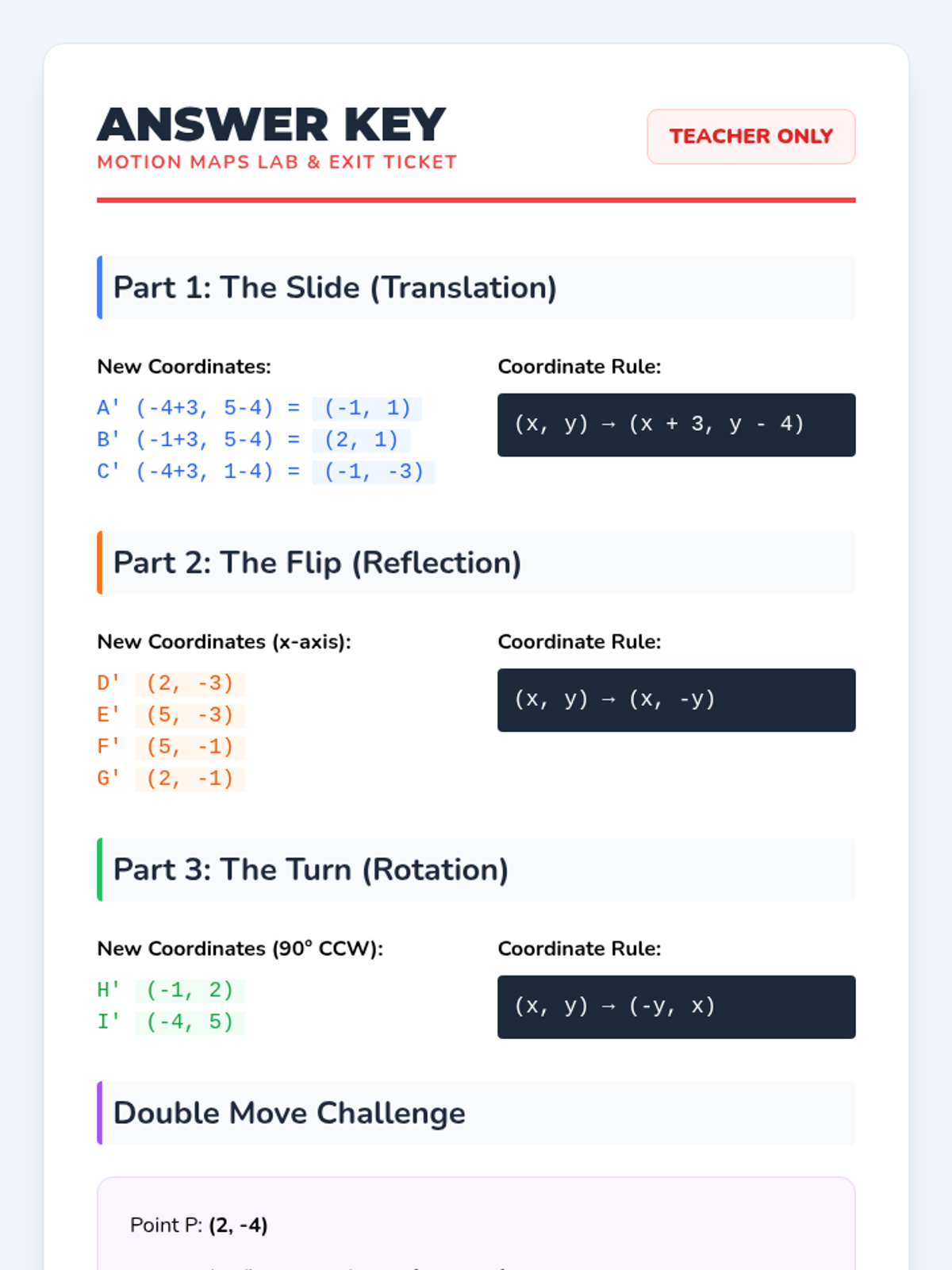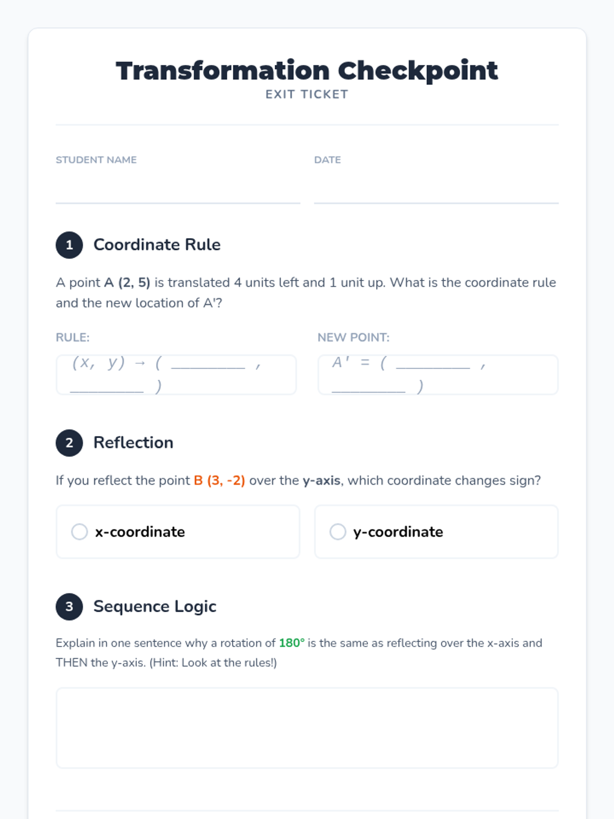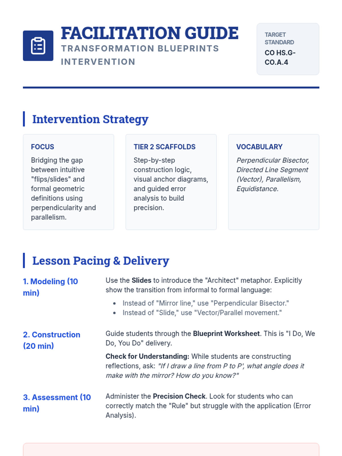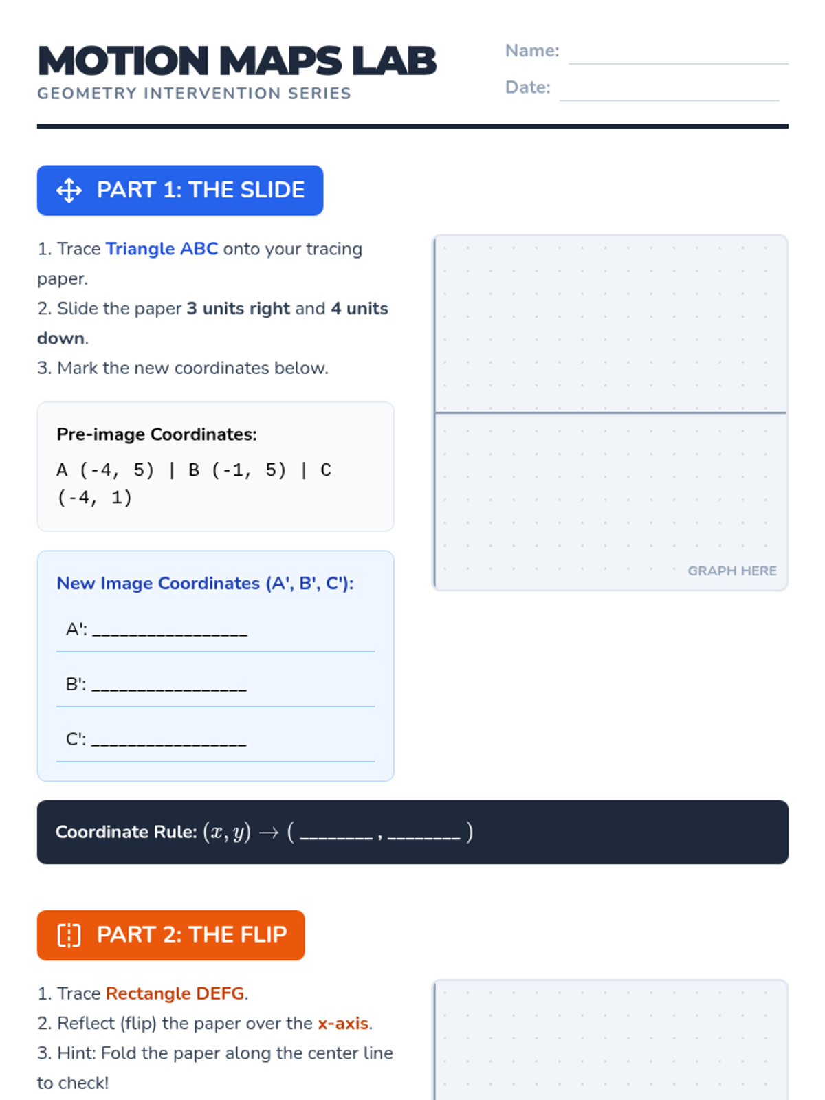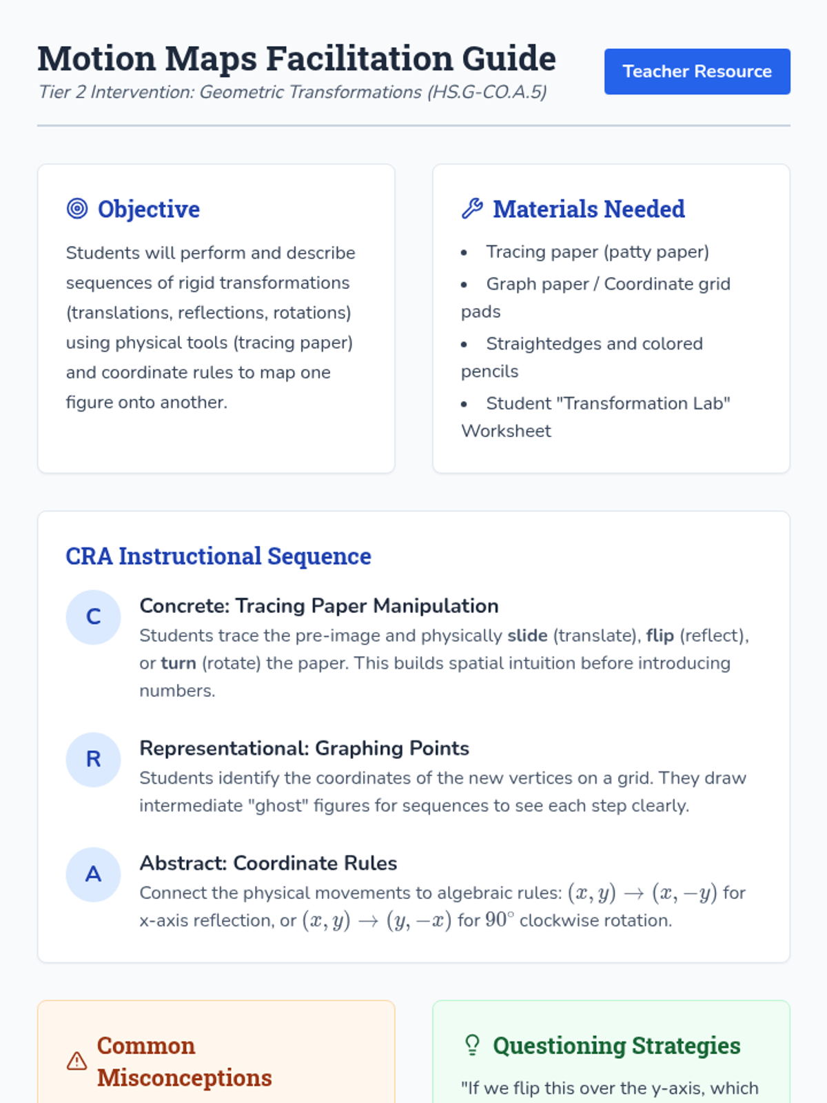 A targeted Tier 2 intervention sequence focused on geometric transformations. It utilizes a Concrete-Representational-Abstract (CRA) approach, guiding struggling learners from physical manipulation with tracing paper to coordinate-based abstract rules.