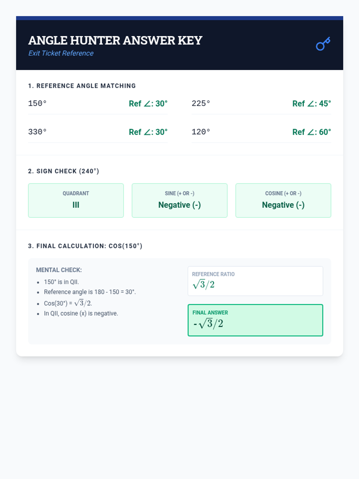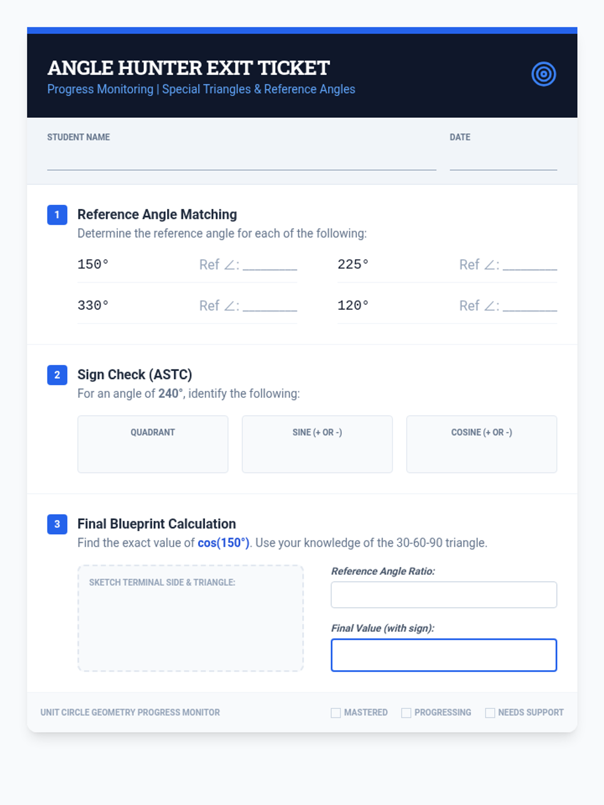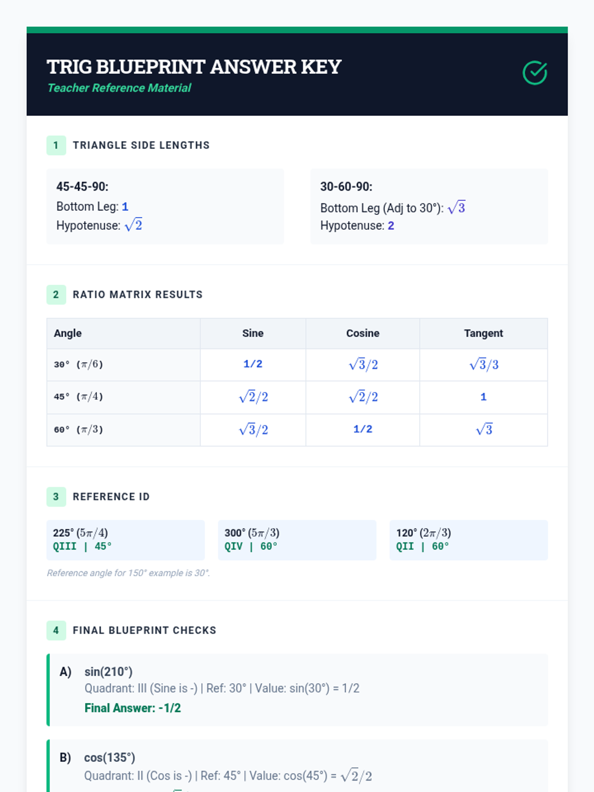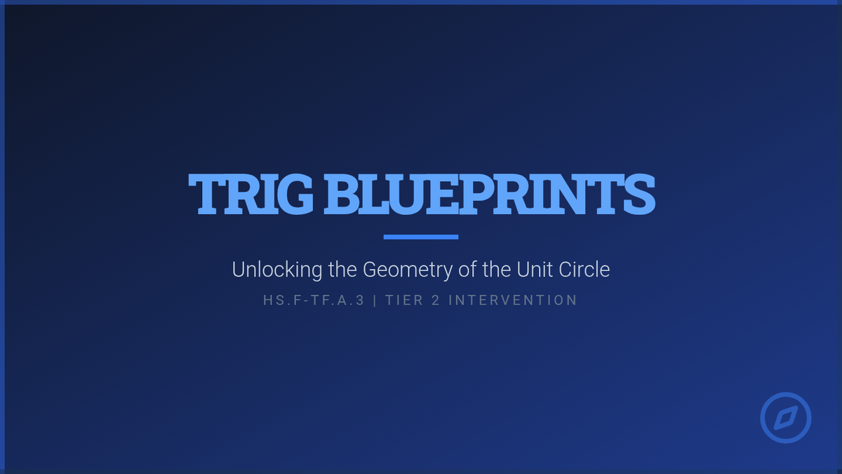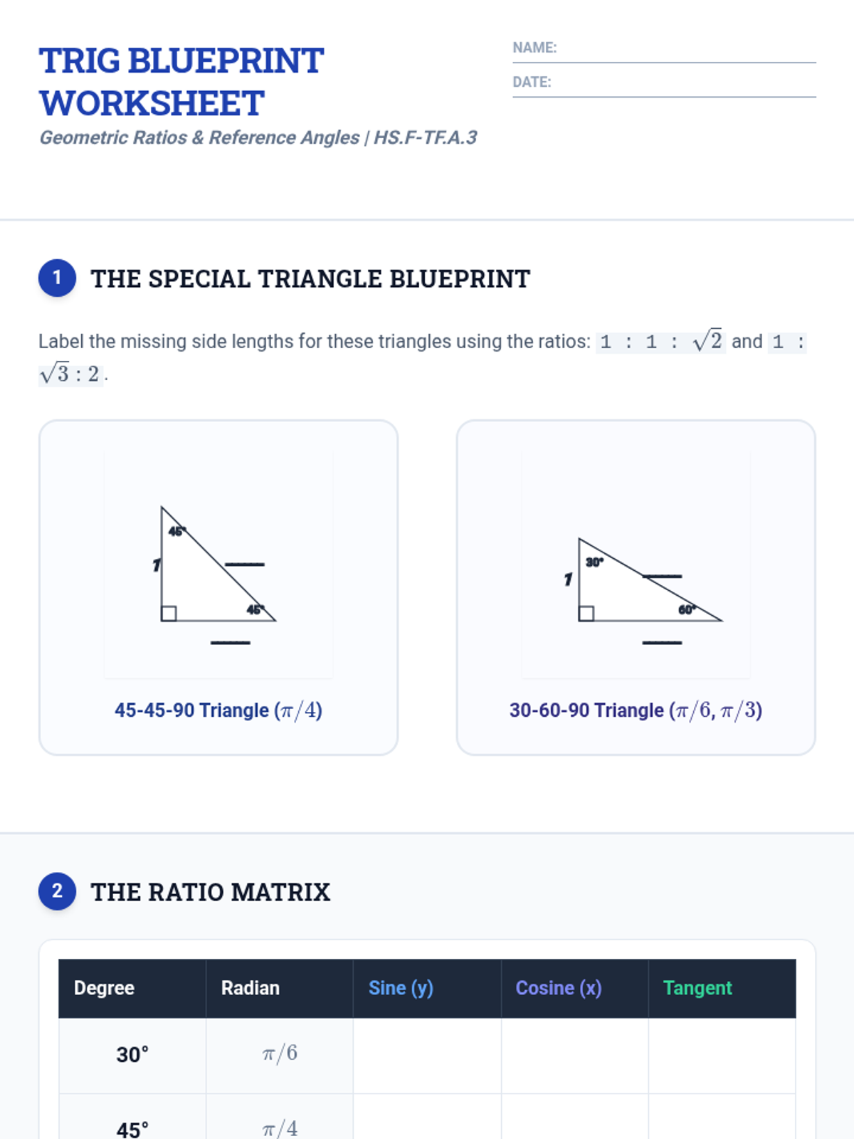 A Tier 2 intervention sequence focused on foundational trigonometry, moving from special right triangles to reference angles on the unit circle. This sequence provides scaffolded support for students struggling with geometric interpretations of sine, cosine, and tangent.