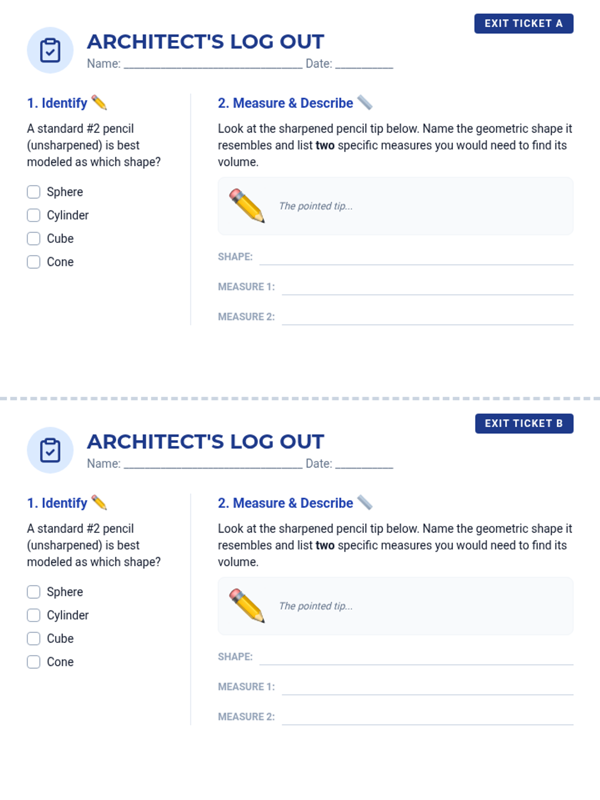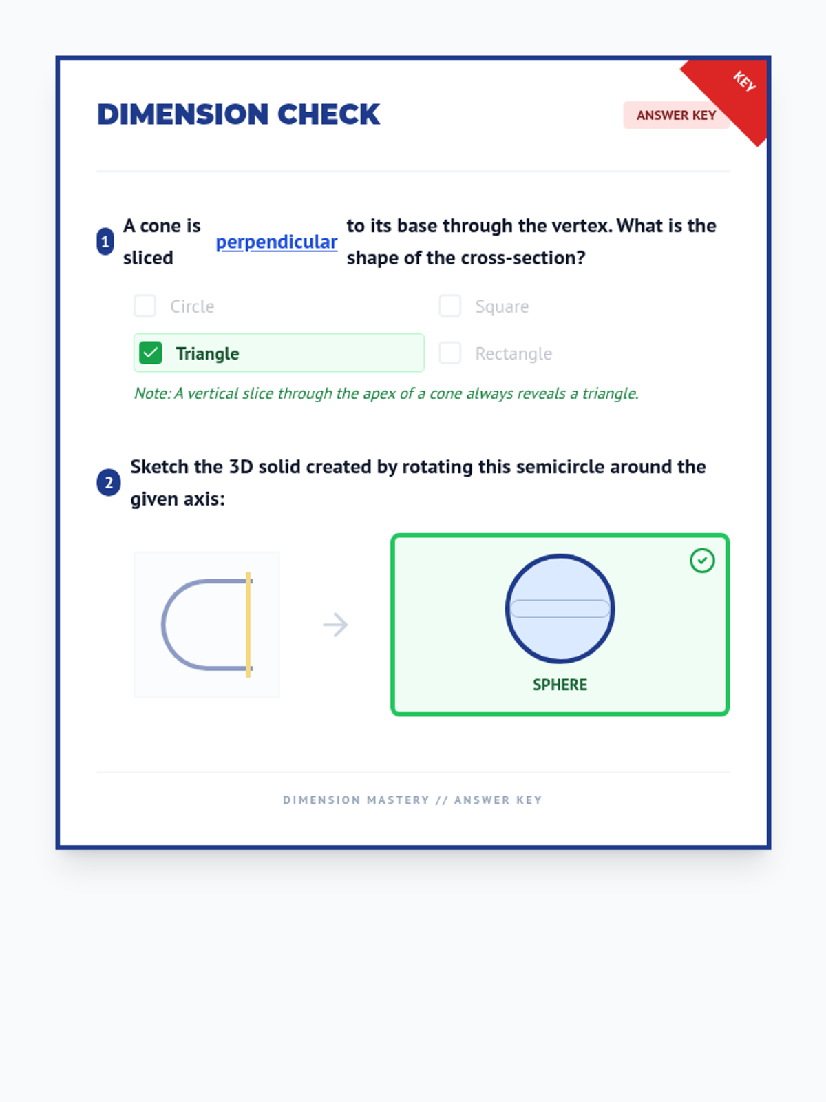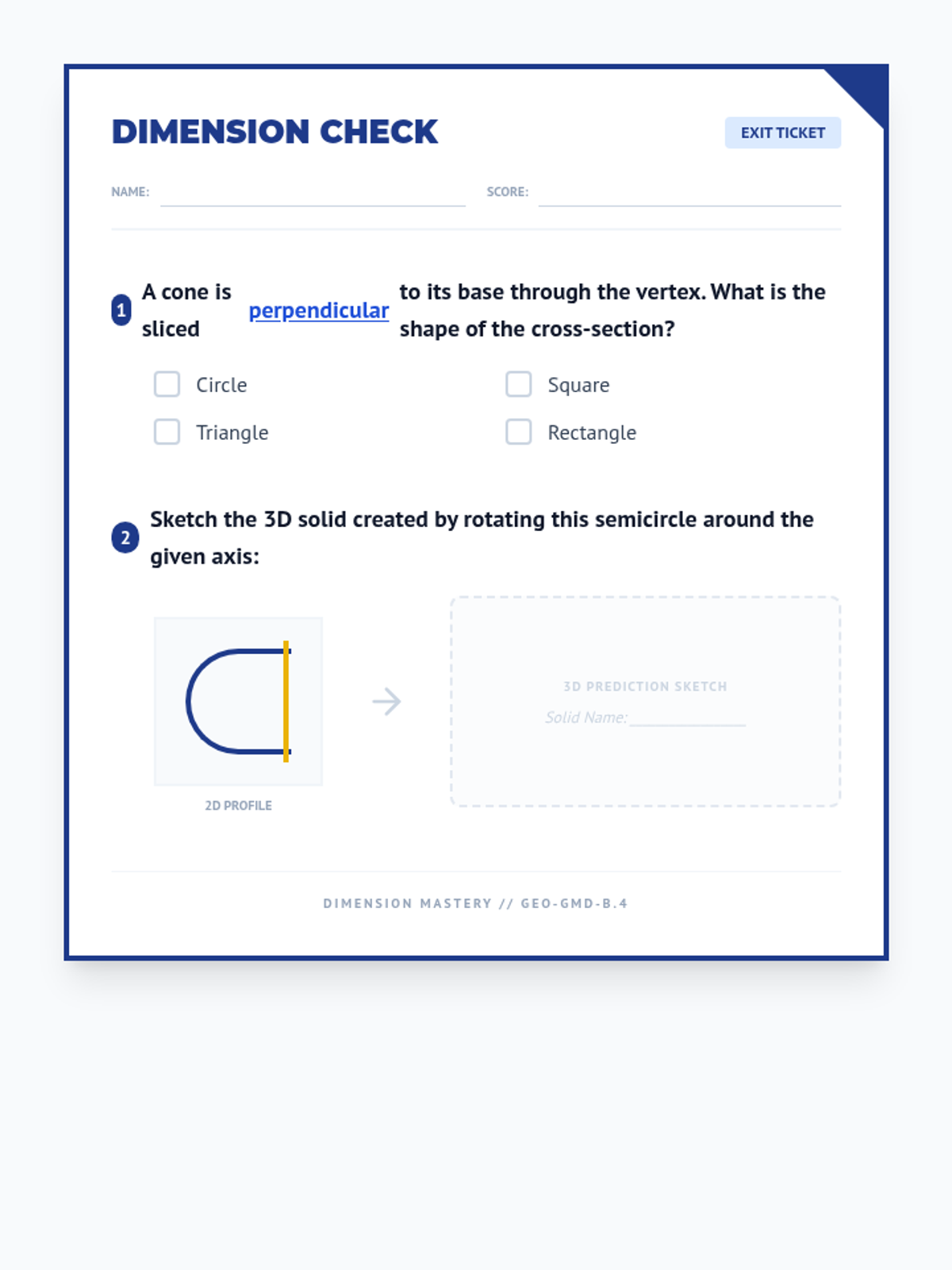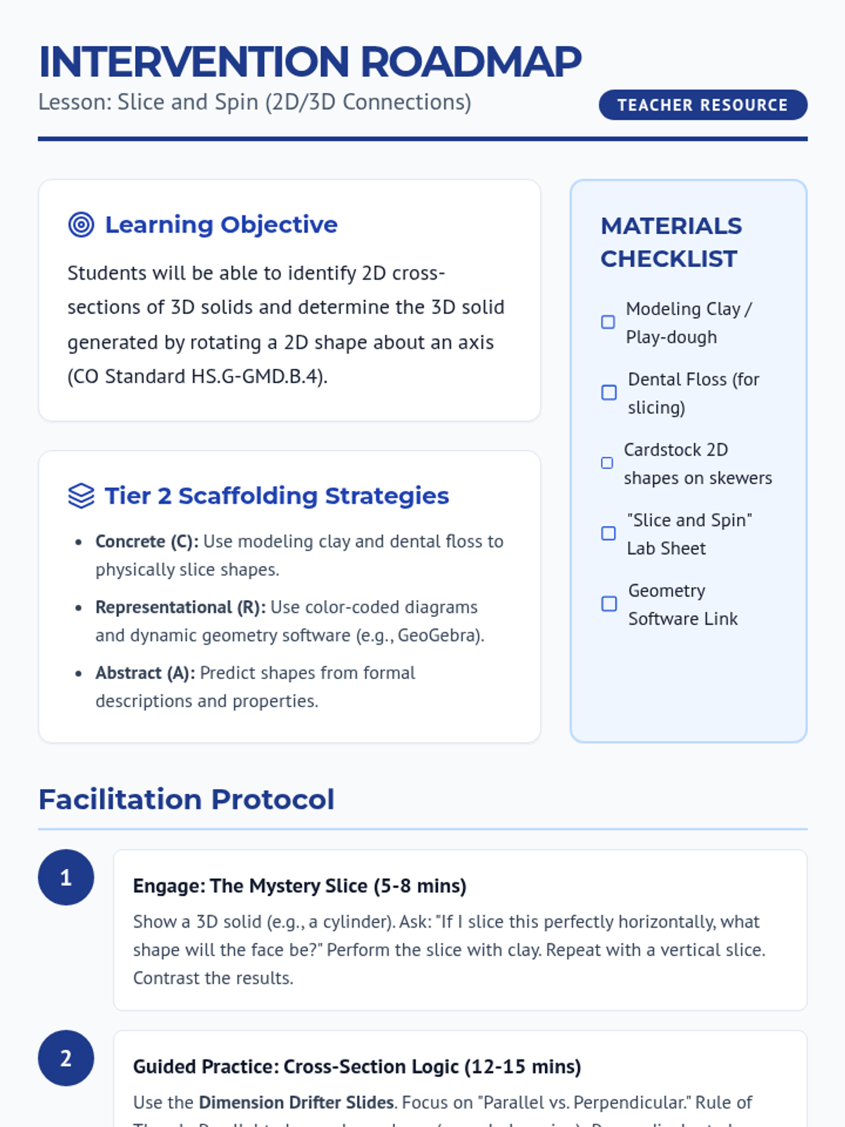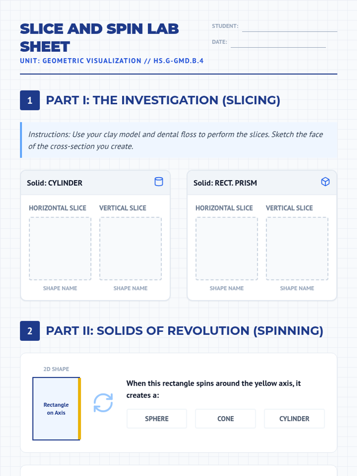 A focused intervention sequence designed to help students master the relationship between 2D shapes and 3D solids through cross-sections and rotations. This module uses a technical drafting aesthetic to engage students in high-school level geometric visualization.