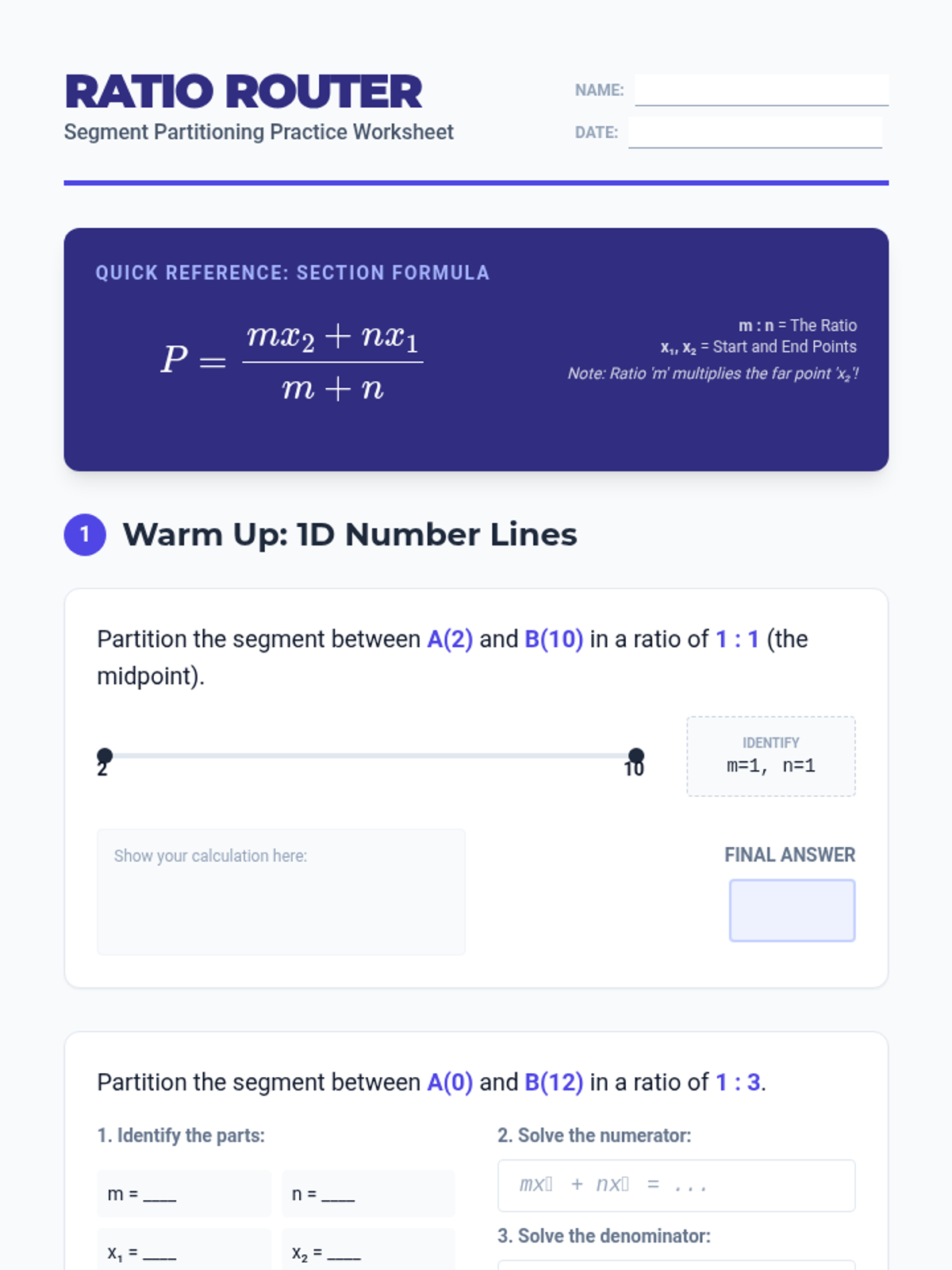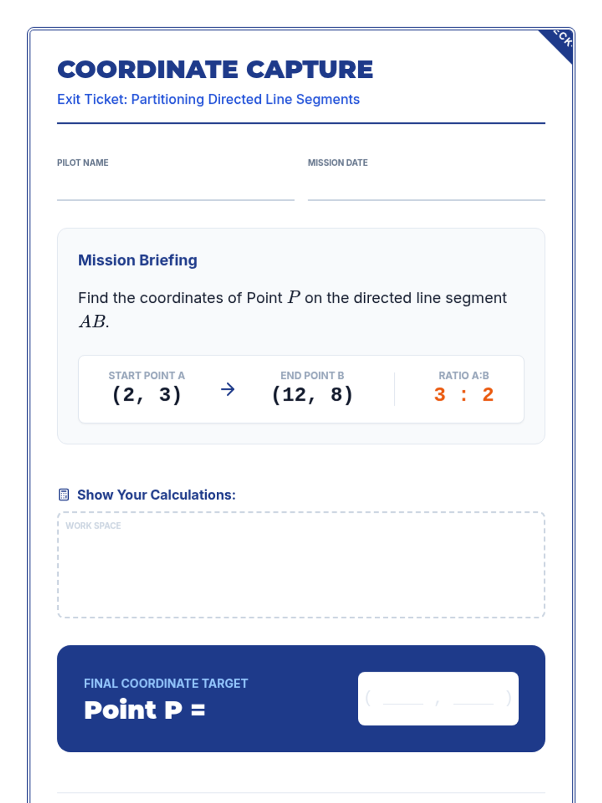 A targeted intervention sequence focused on helping students master the process of partitioning directed line segments in specific ratios. This sequence provides high-scaffold support, visual aids, and step-by-step procedures to ensure student success.