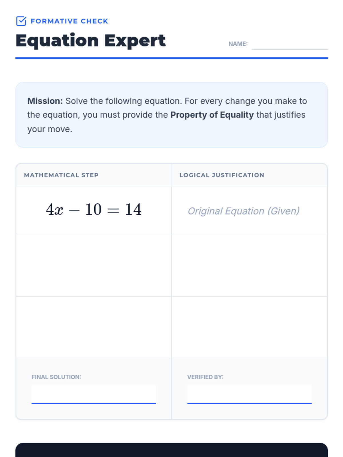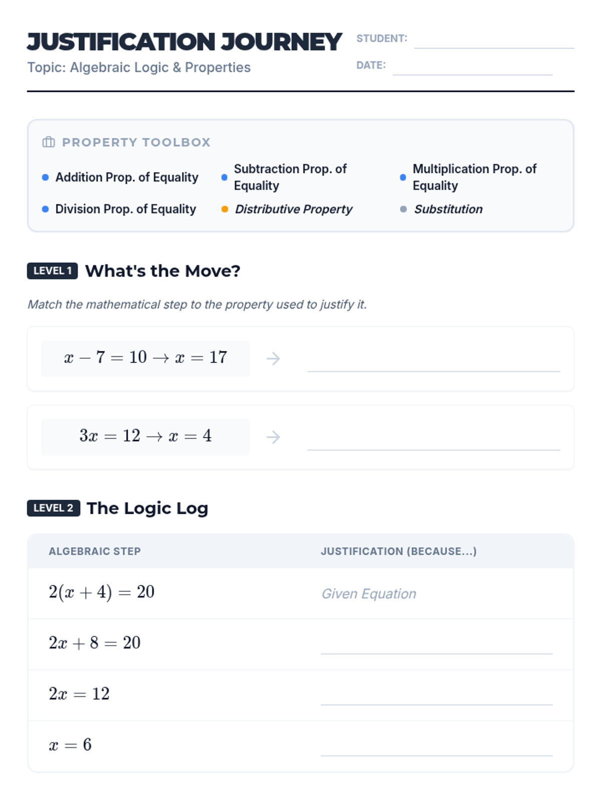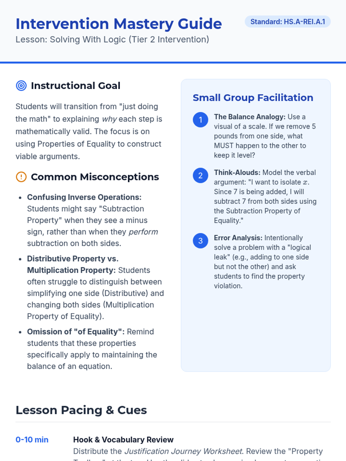 A Tier 2 intervention sequence focused on the logical justification of algebraic steps using properties of equality, aligned with Colorado standard HS.A-REI.A.1.