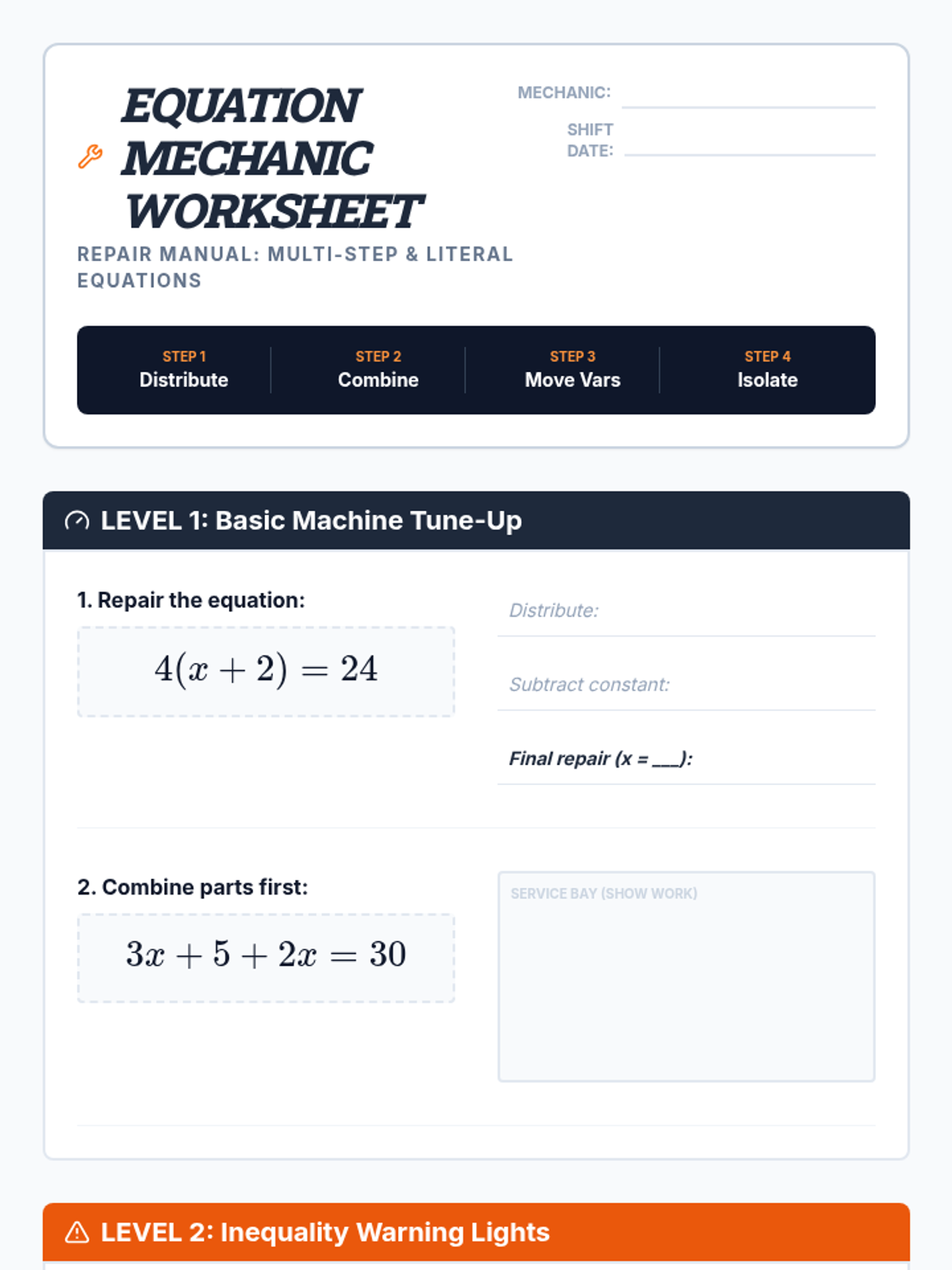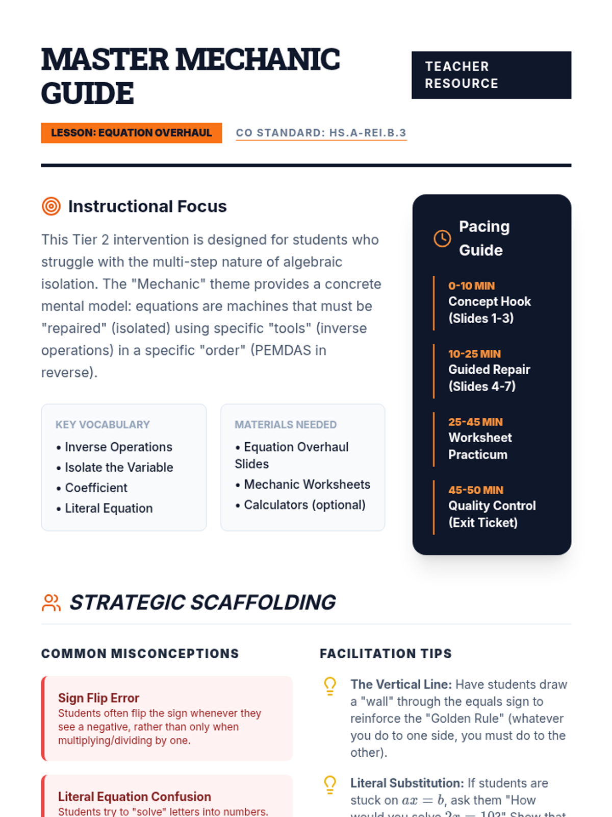 An intensive Tier 2 intervention sequence focused on mastering multi-step linear equations, inequalities, and literal equations. The sequence uses a 'mechanic' theme to help students visualize 'repairing' equations by isolating variables.