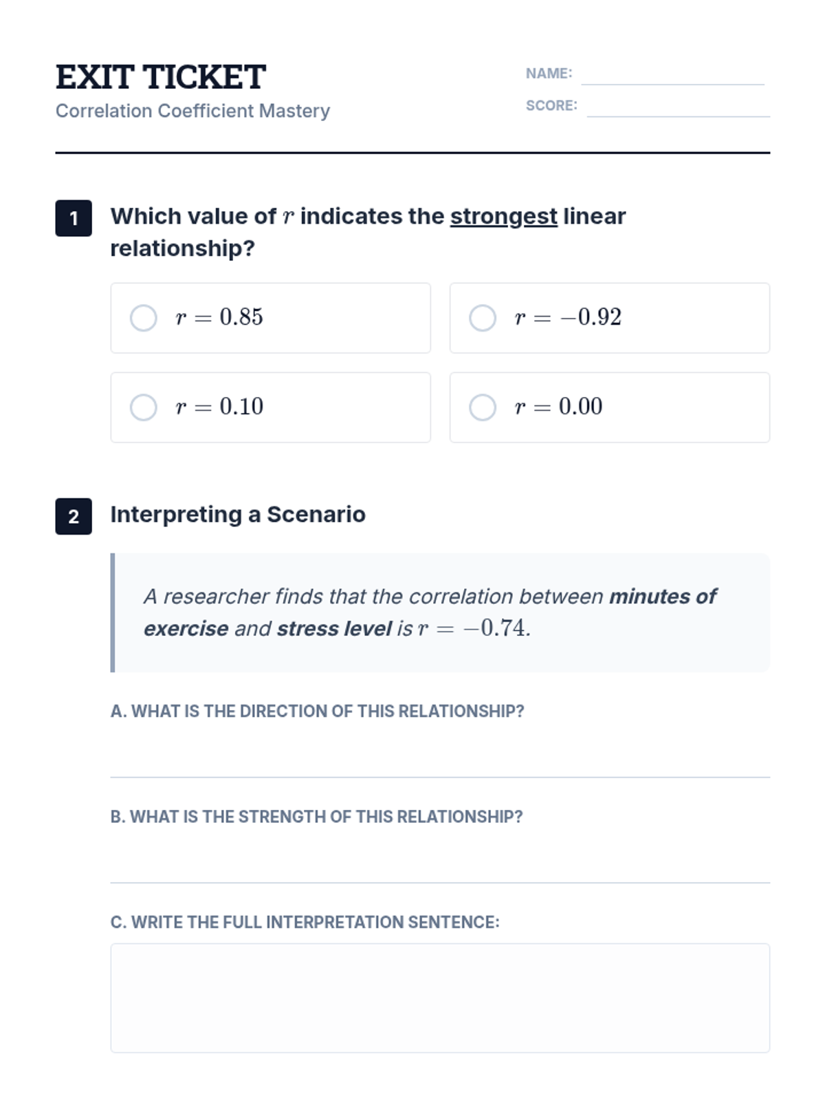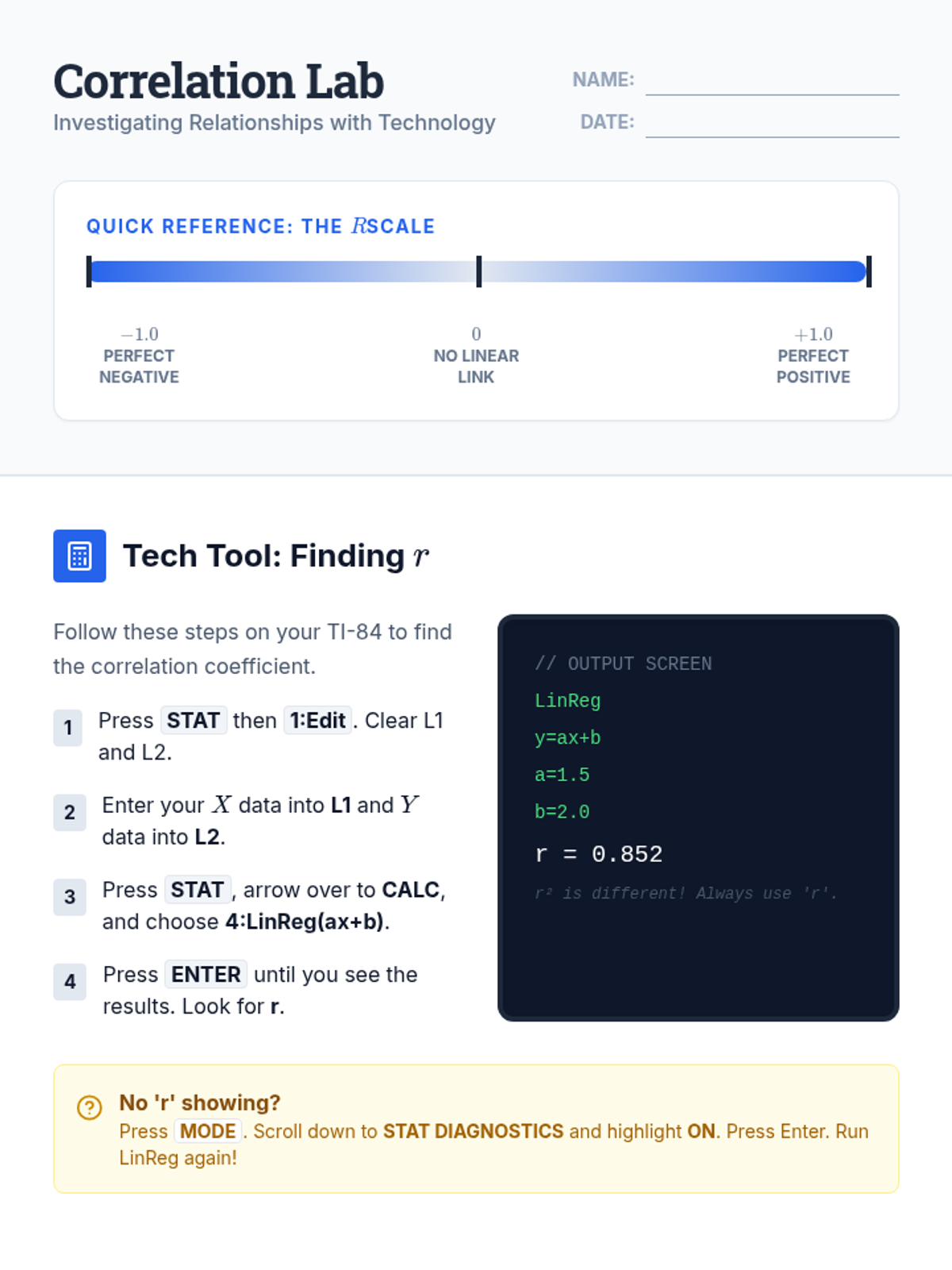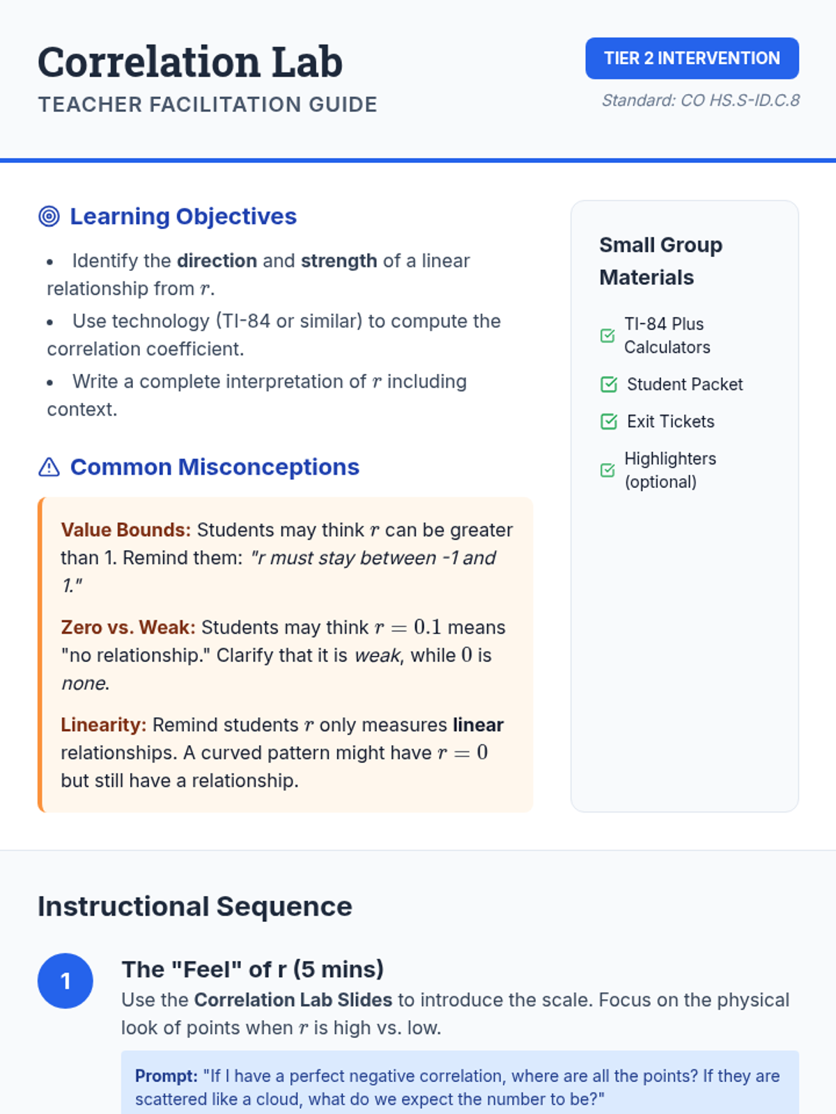 A Tier 2 intervention sequence focused on computing and interpreting the correlation coefficient (r) using technology, designed for high school statistics students needing targeted support.