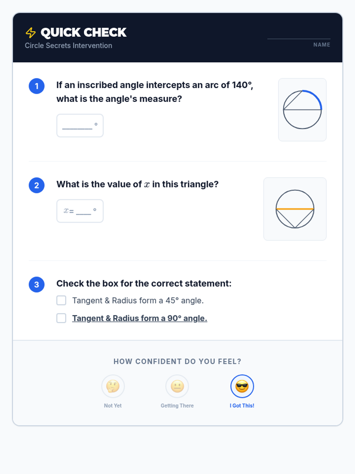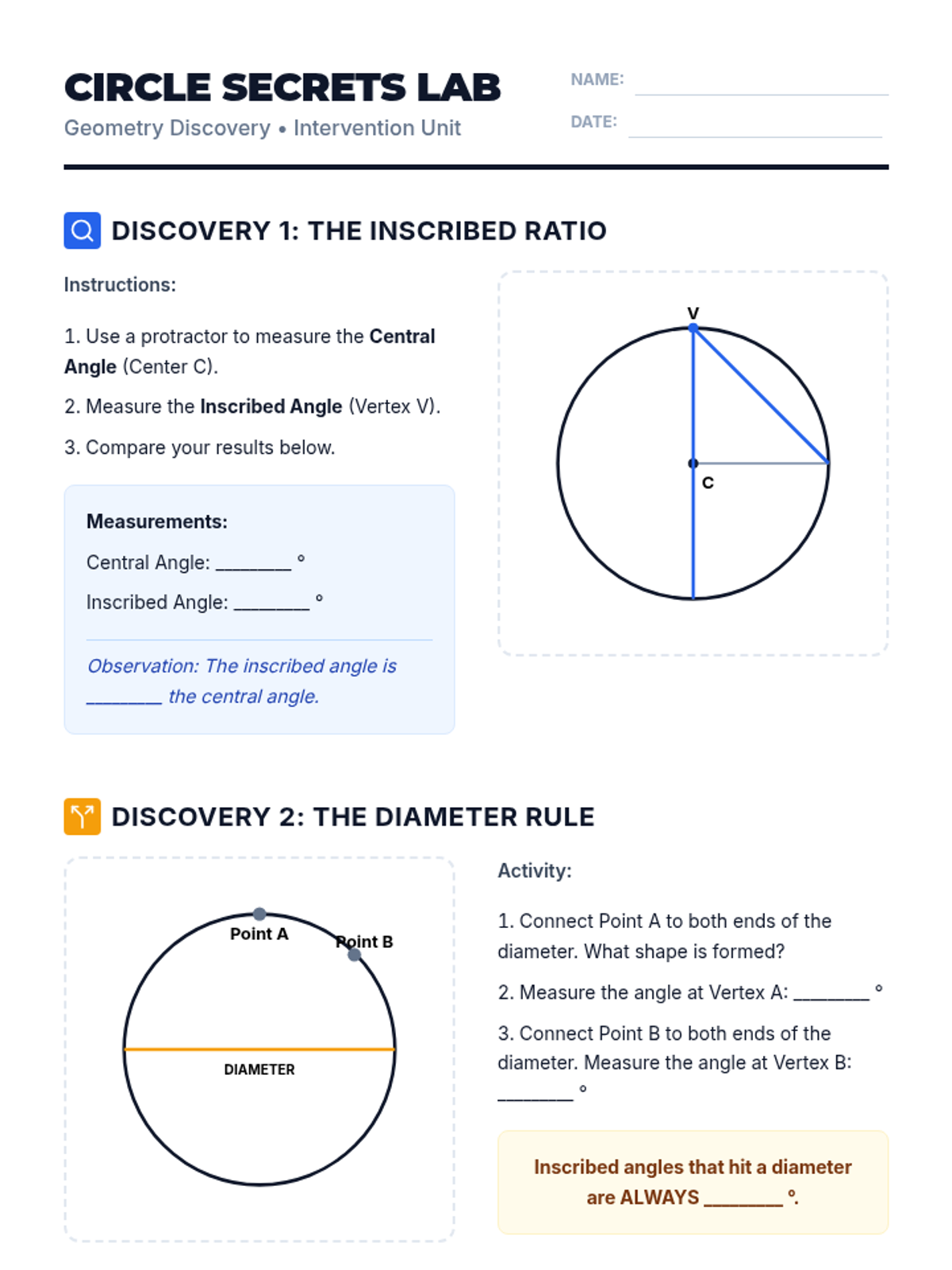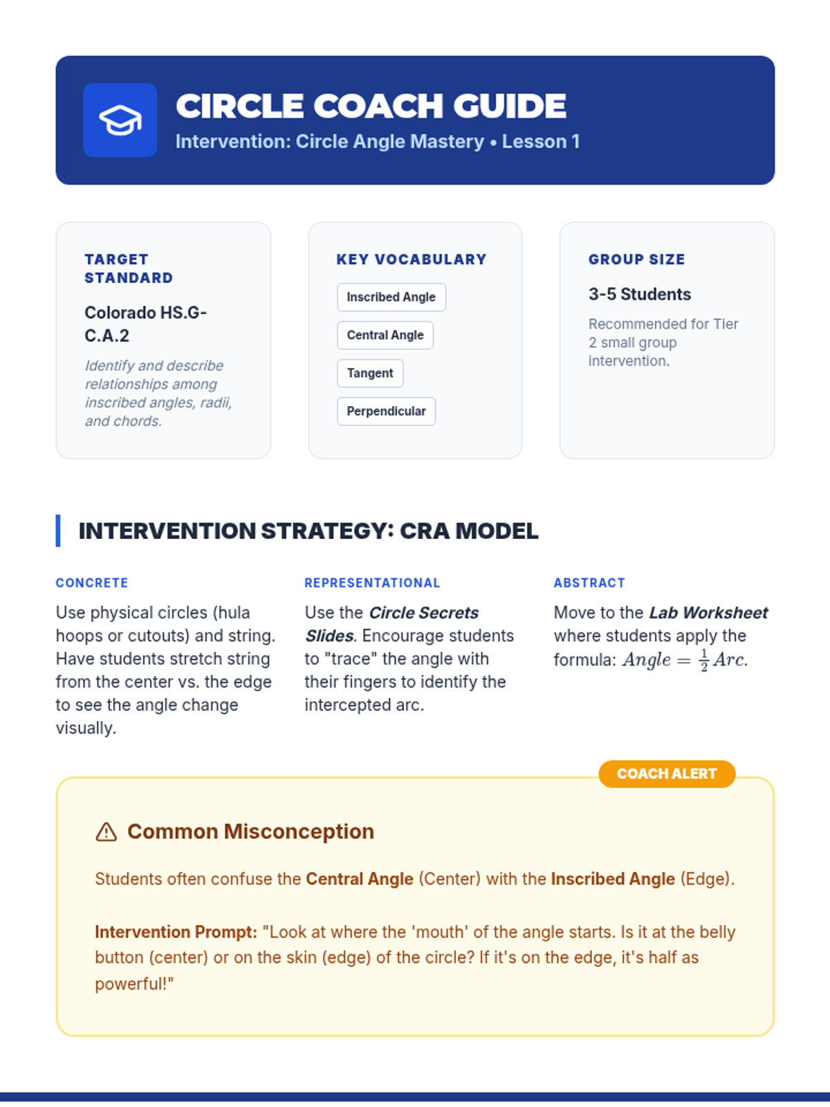 A targeted intervention sequence for high school geometry students focusing on circle theorems. The sequence emphasizes visual discovery and scaffolded practice to help Tier 2 learners master inscribed angles and tangent properties.
