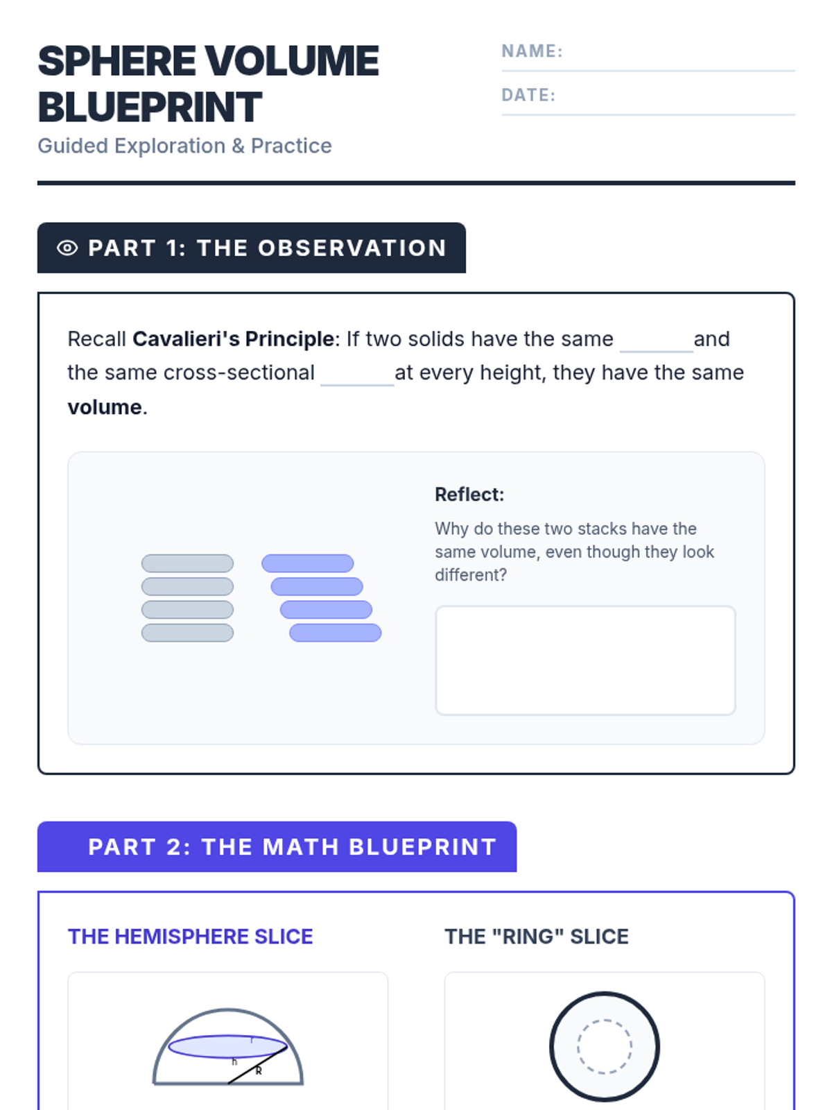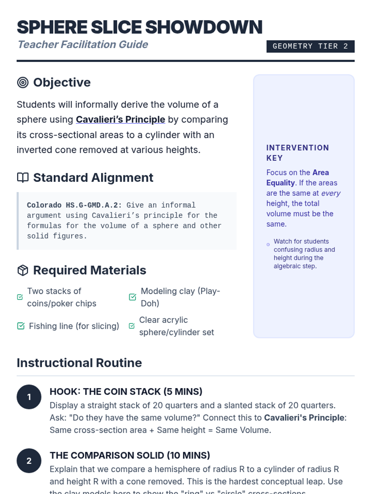 A targeted intervention sequence for high school geometry students to master the volume of spheres using Cavalieri's Principle through hands-on comparisons and visual proofs.