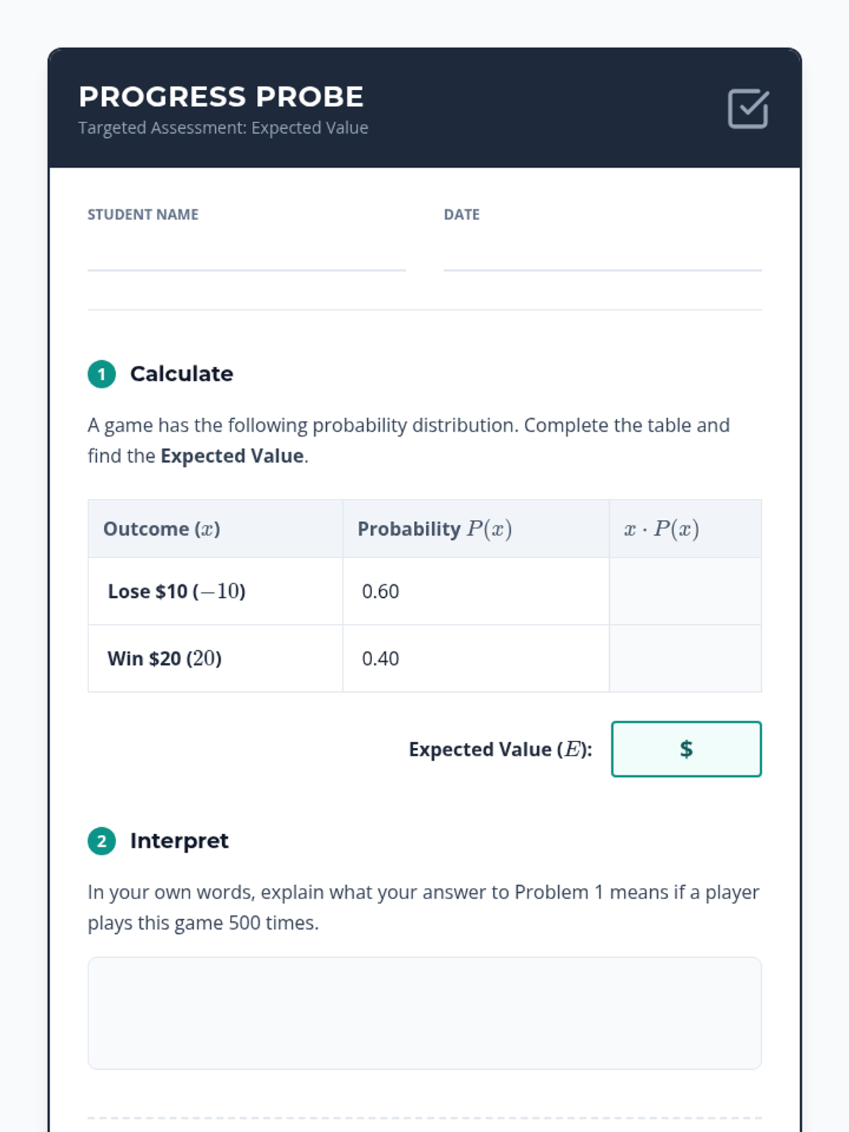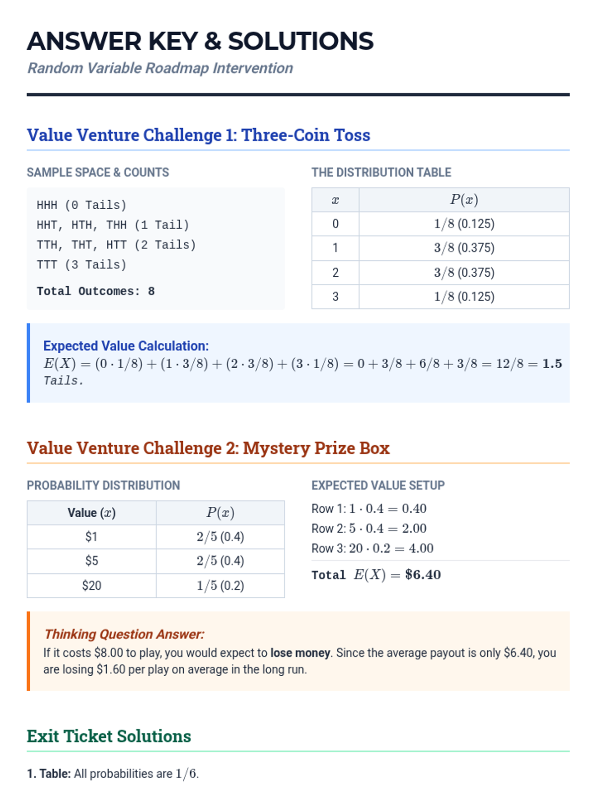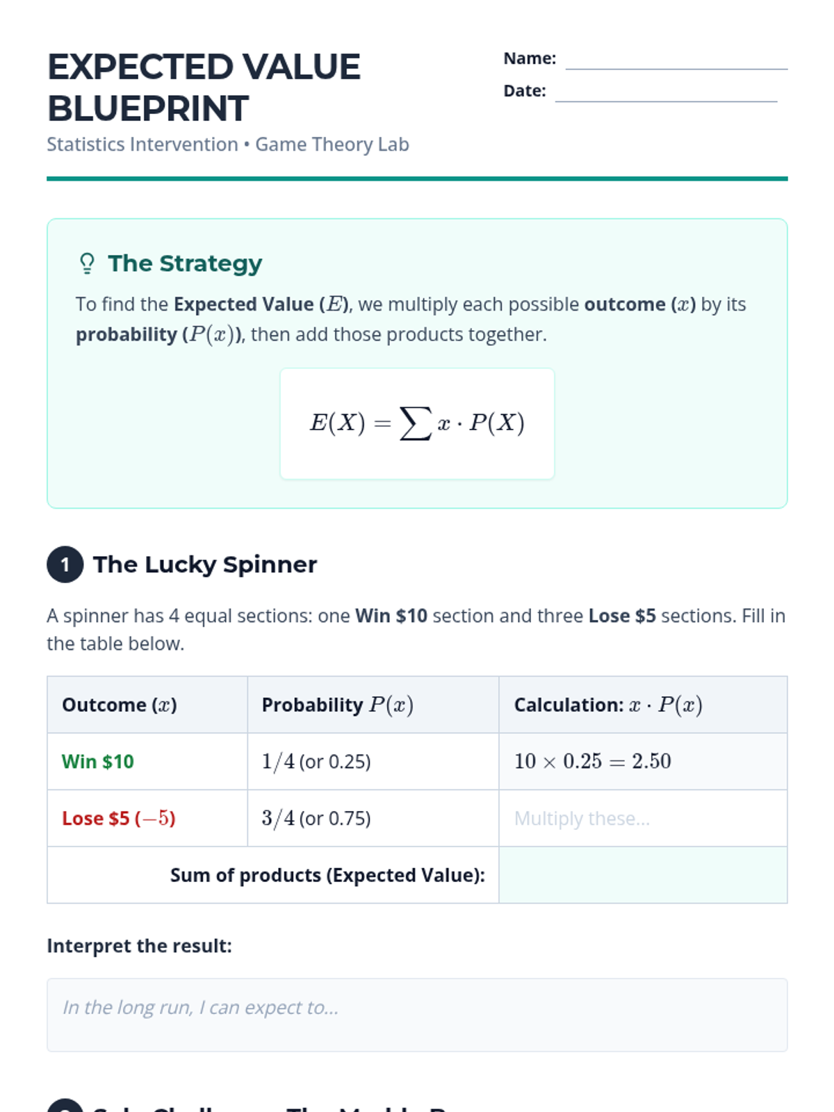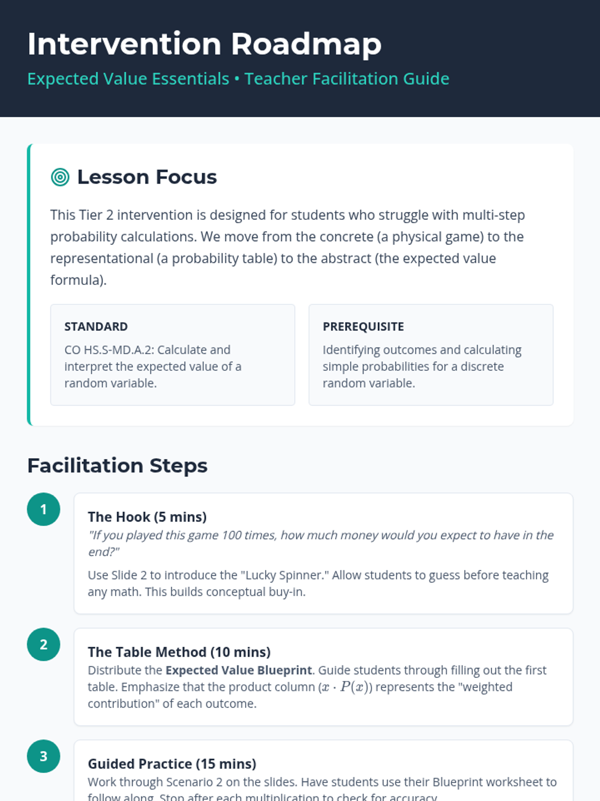 A targeted intervention sequence focused on helping High School students master the calculation and interpretation of expected value using concrete game scenarios and scaffolded table methods.