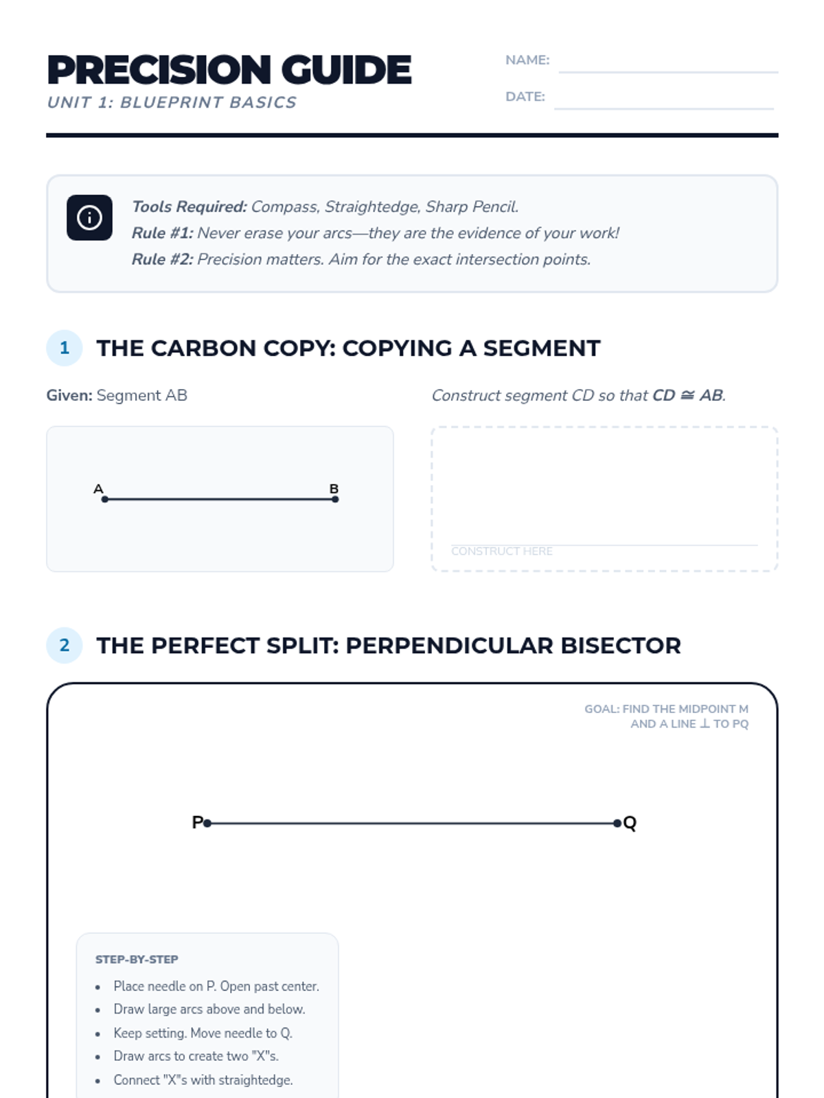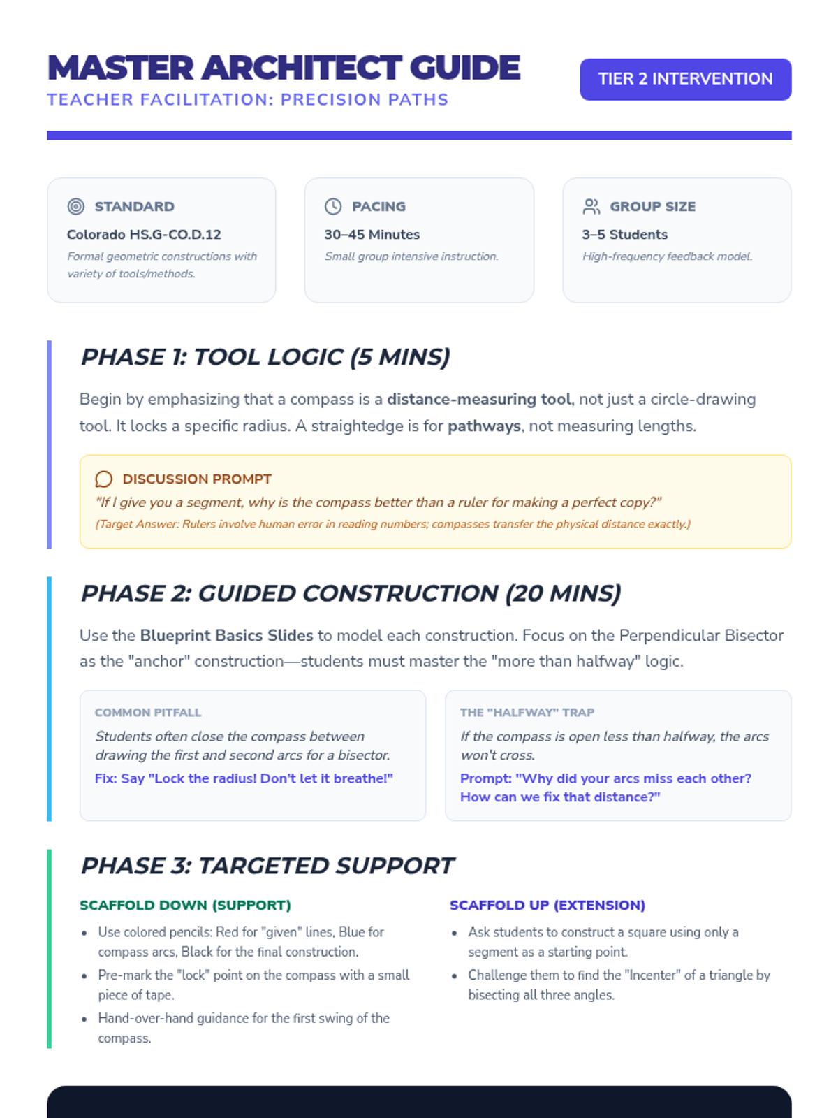 A specialized intervention sequence for High School Geometry focusing on the logic and execution of formal geometric constructions using compass and straightedge. Designed for Tier 2 small group support with scaffolded steps and targeted practice.