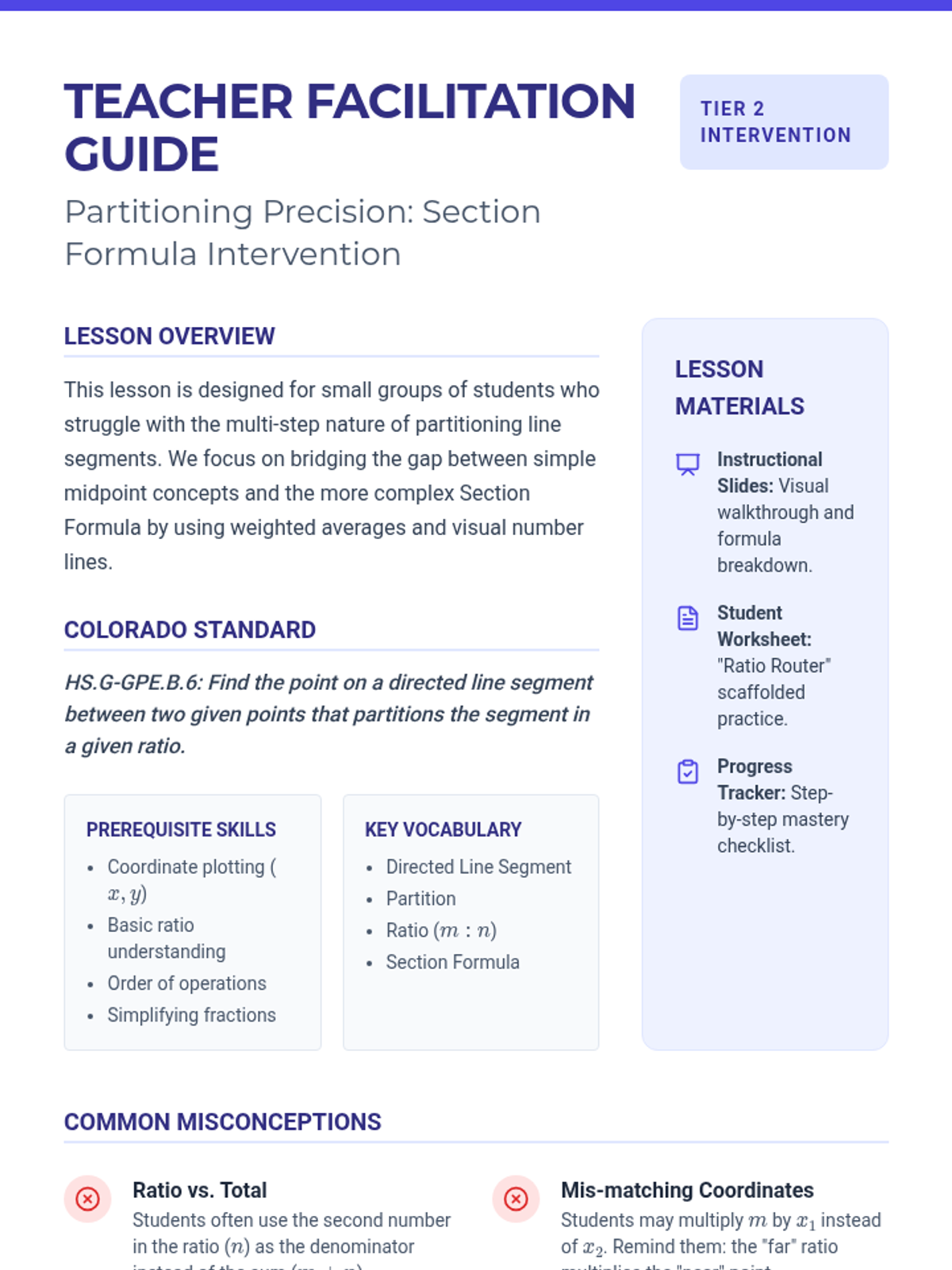 A targeted intervention sequence for high school geometry students focusing on partitioning line segments in given ratios. This unit breaks down the section formula through visual supports, number line bridging, and scaffolded coordinate plane practice.