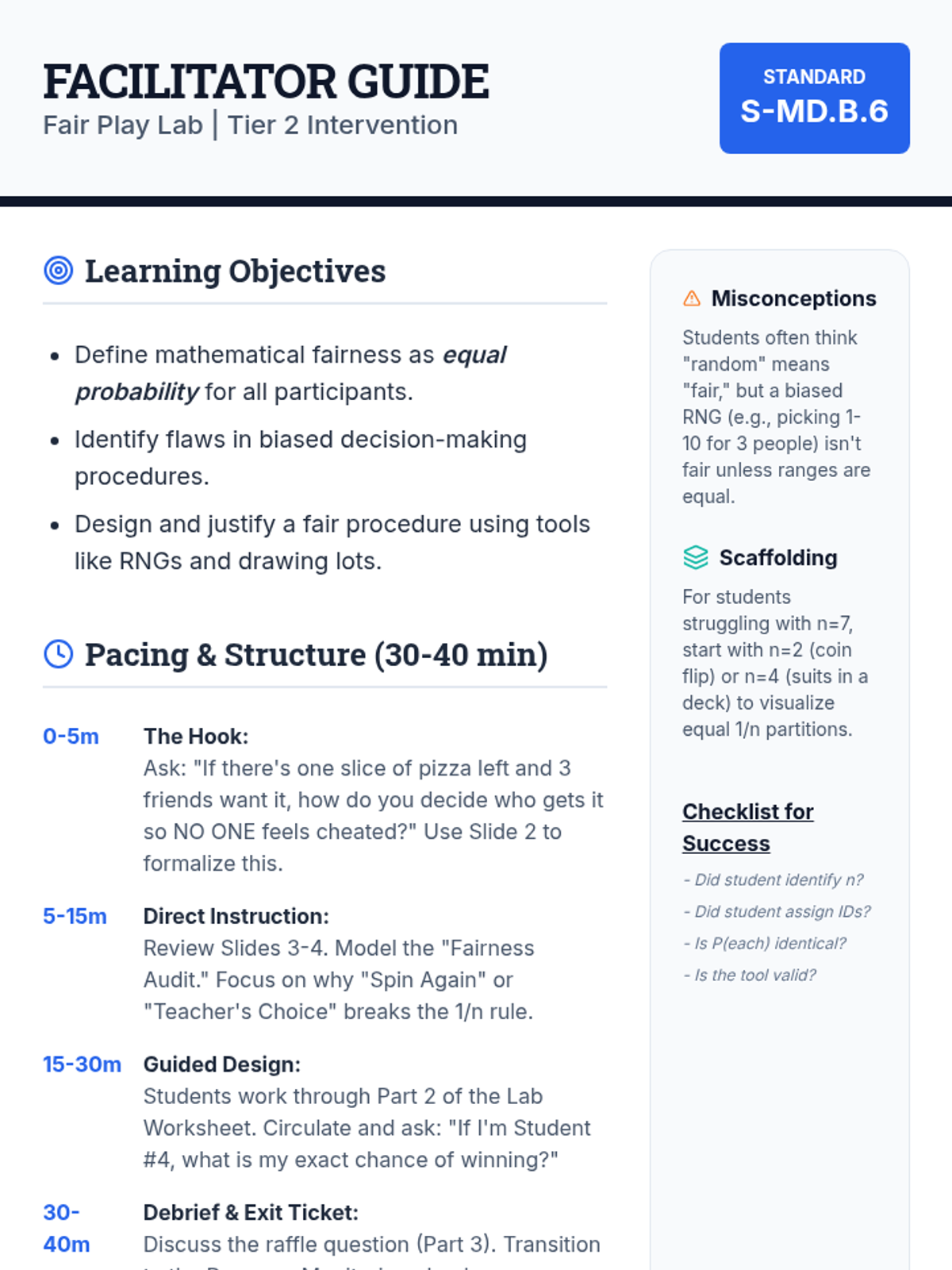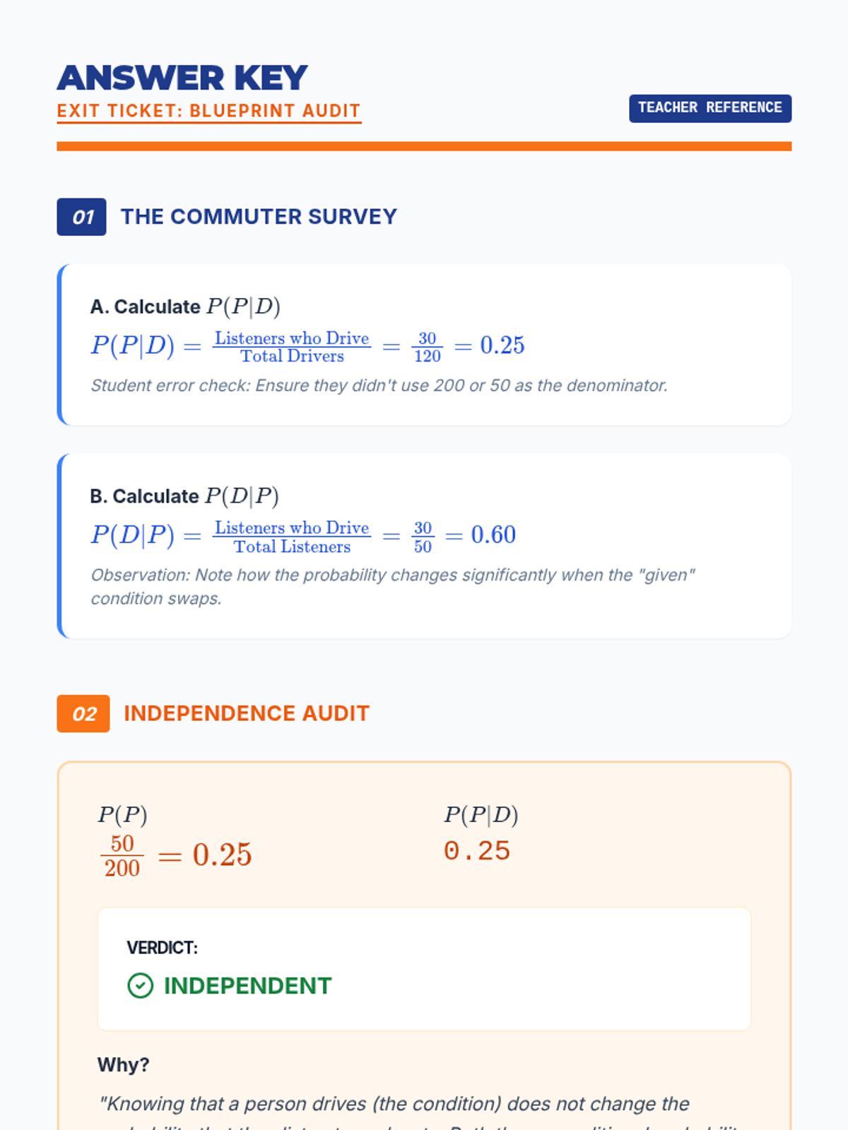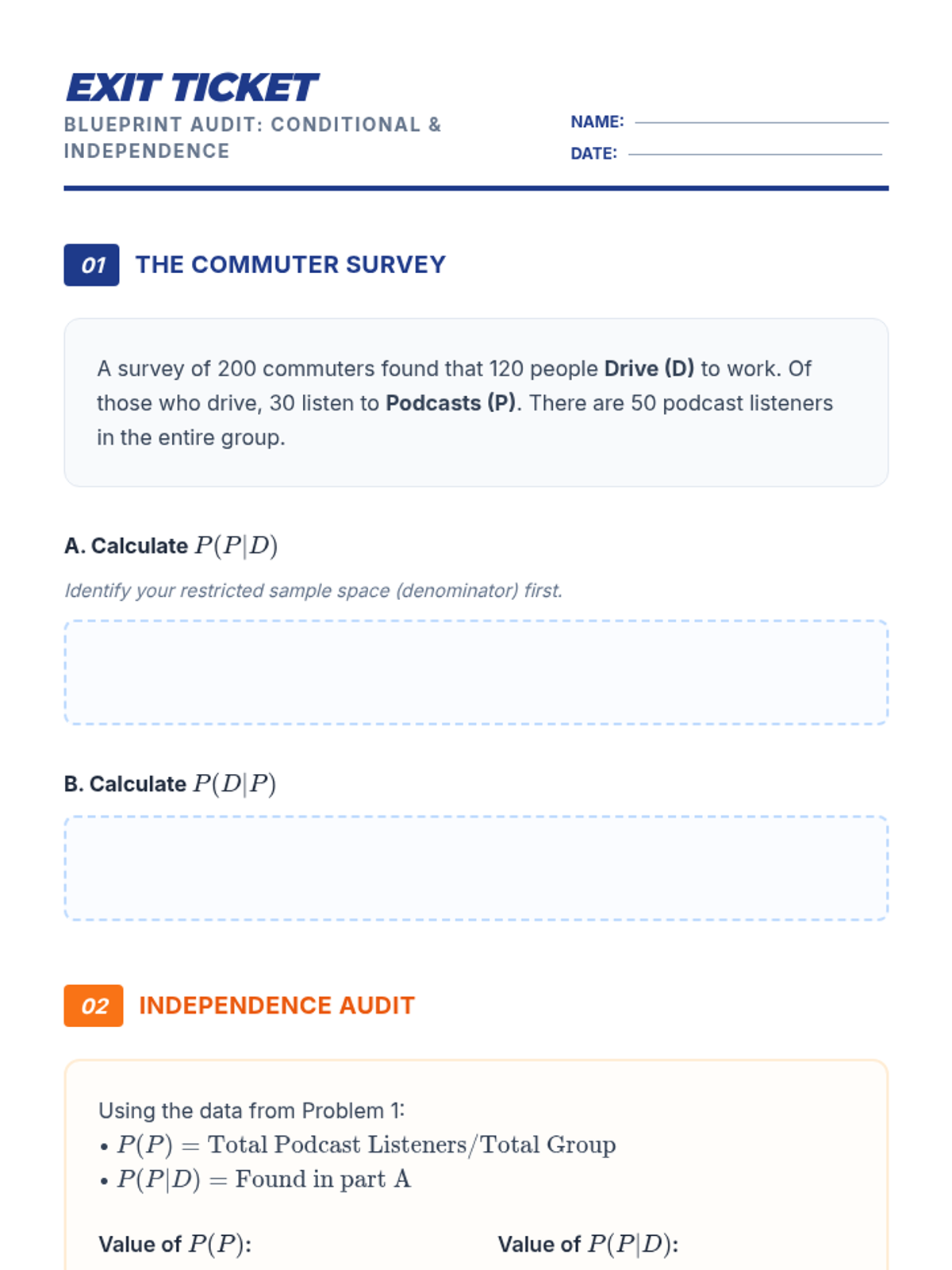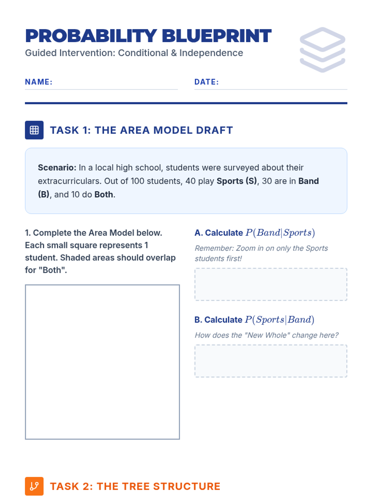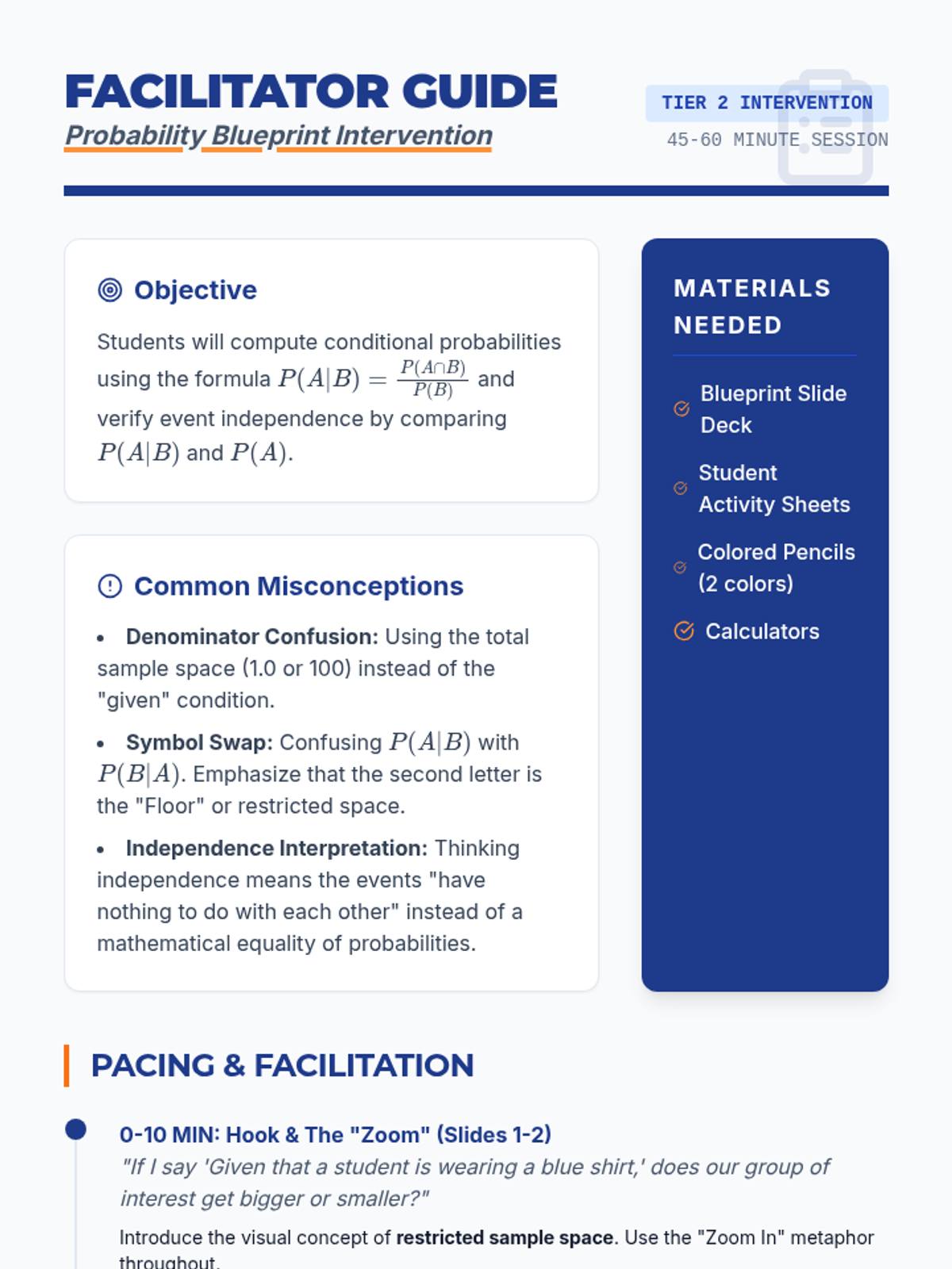 A targeted Tier 2 intervention sequence focused on conditional probability and independence for high school students. This sequence emphasizes visual models like tree diagrams and area models to bridge conceptual understanding to formal notation.