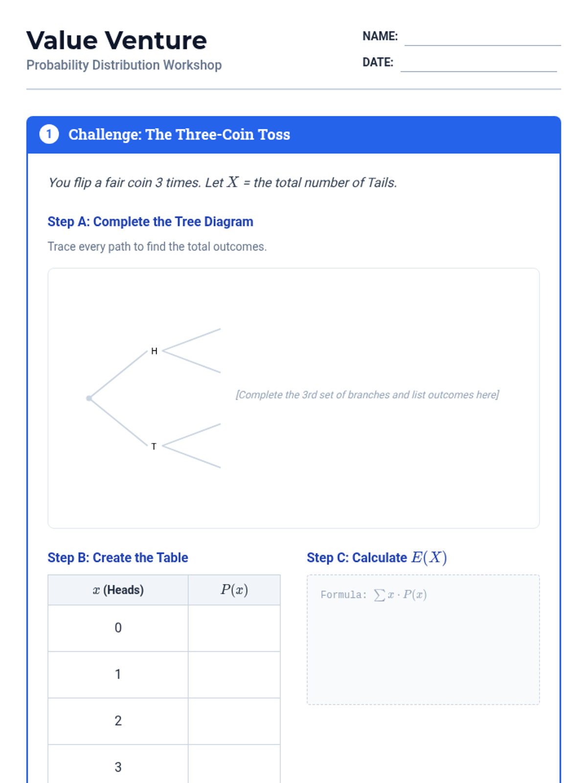 A targeted intervention sequence focused on foundational probability concepts, specifically developing discrete probability distributions and calculating expected values through visual scaffolds like tree diagrams and organized counting.