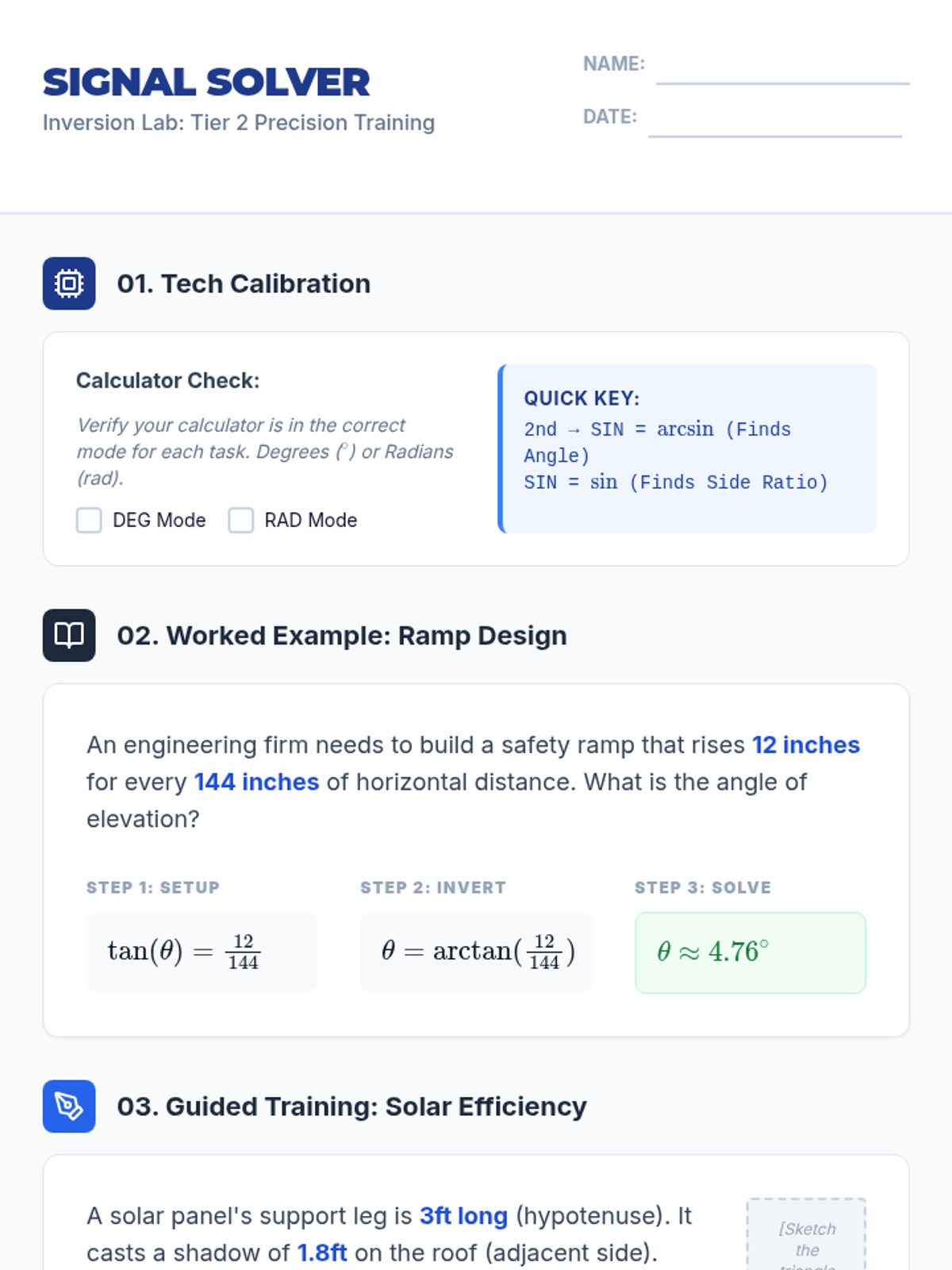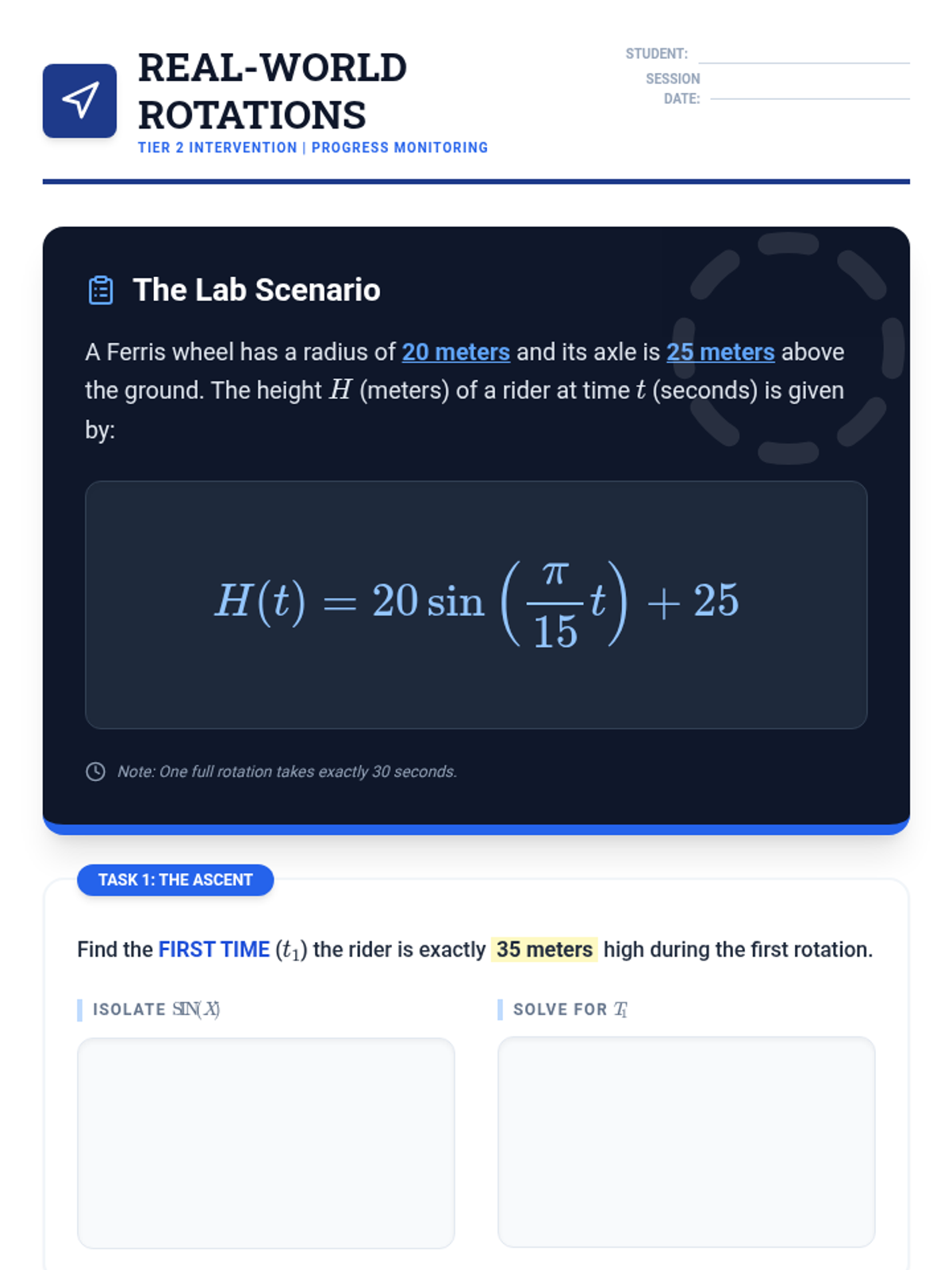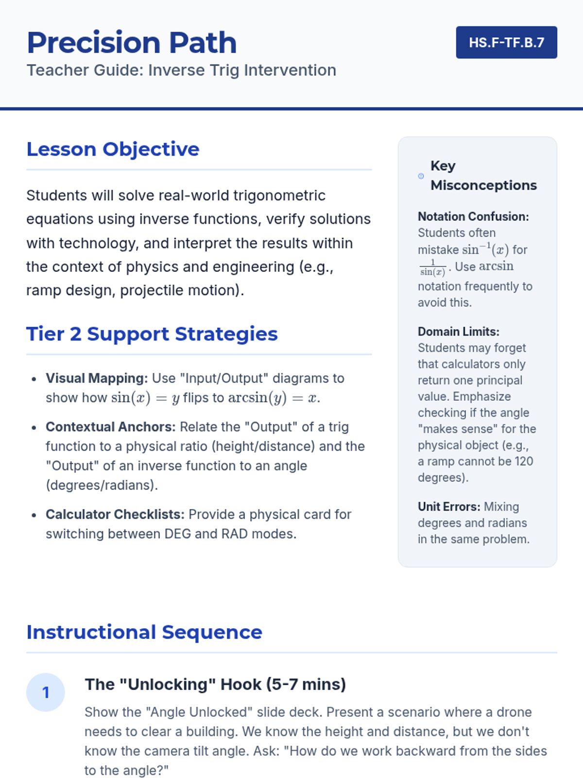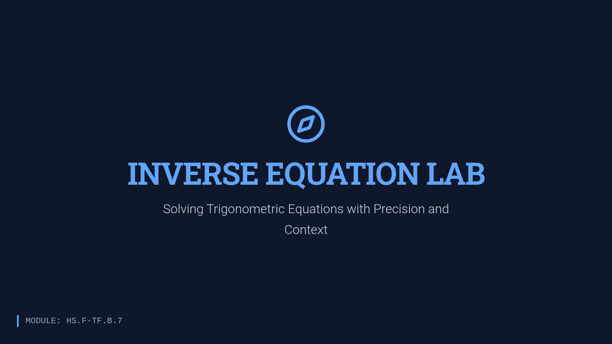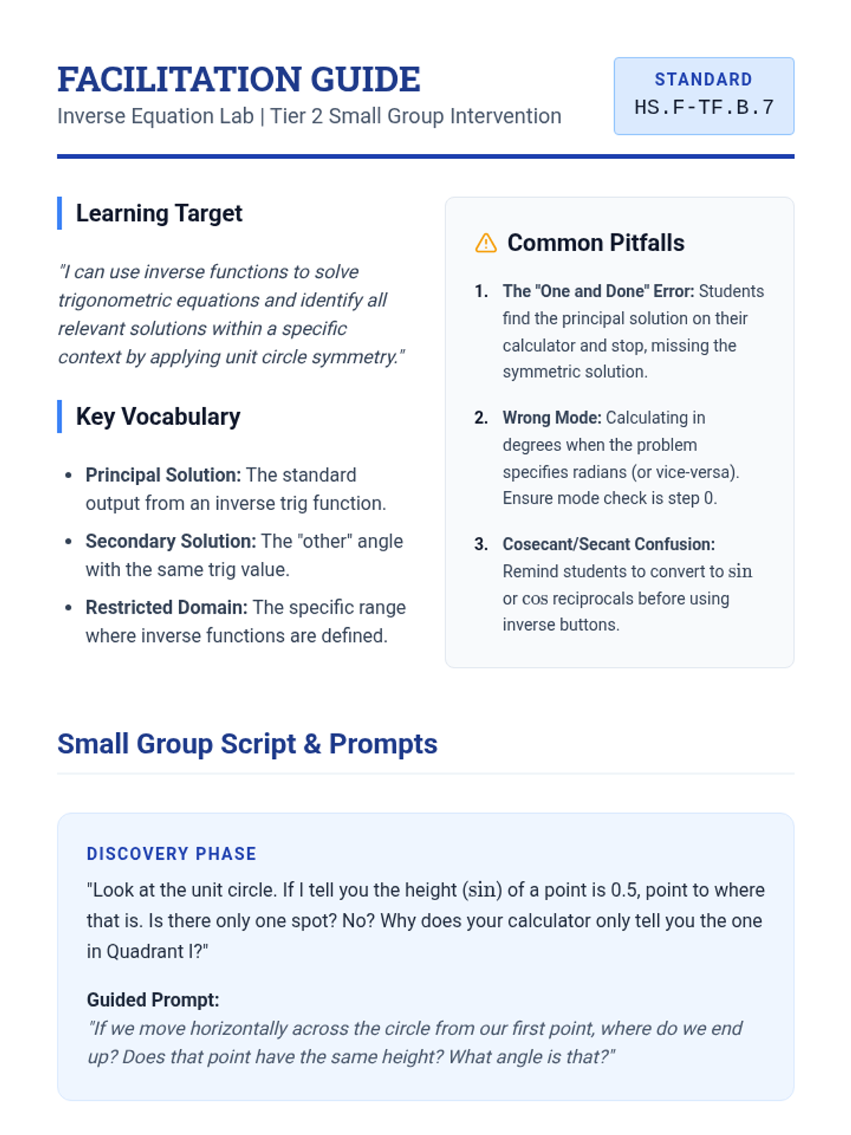 A targeted intervention sequence focused on mastering trigonometric equations through inverse functions, visual symmetry, and contextual application. This sequence provides Tier 2 support for students needing scaffolded paths to find both principal and secondary solutions.