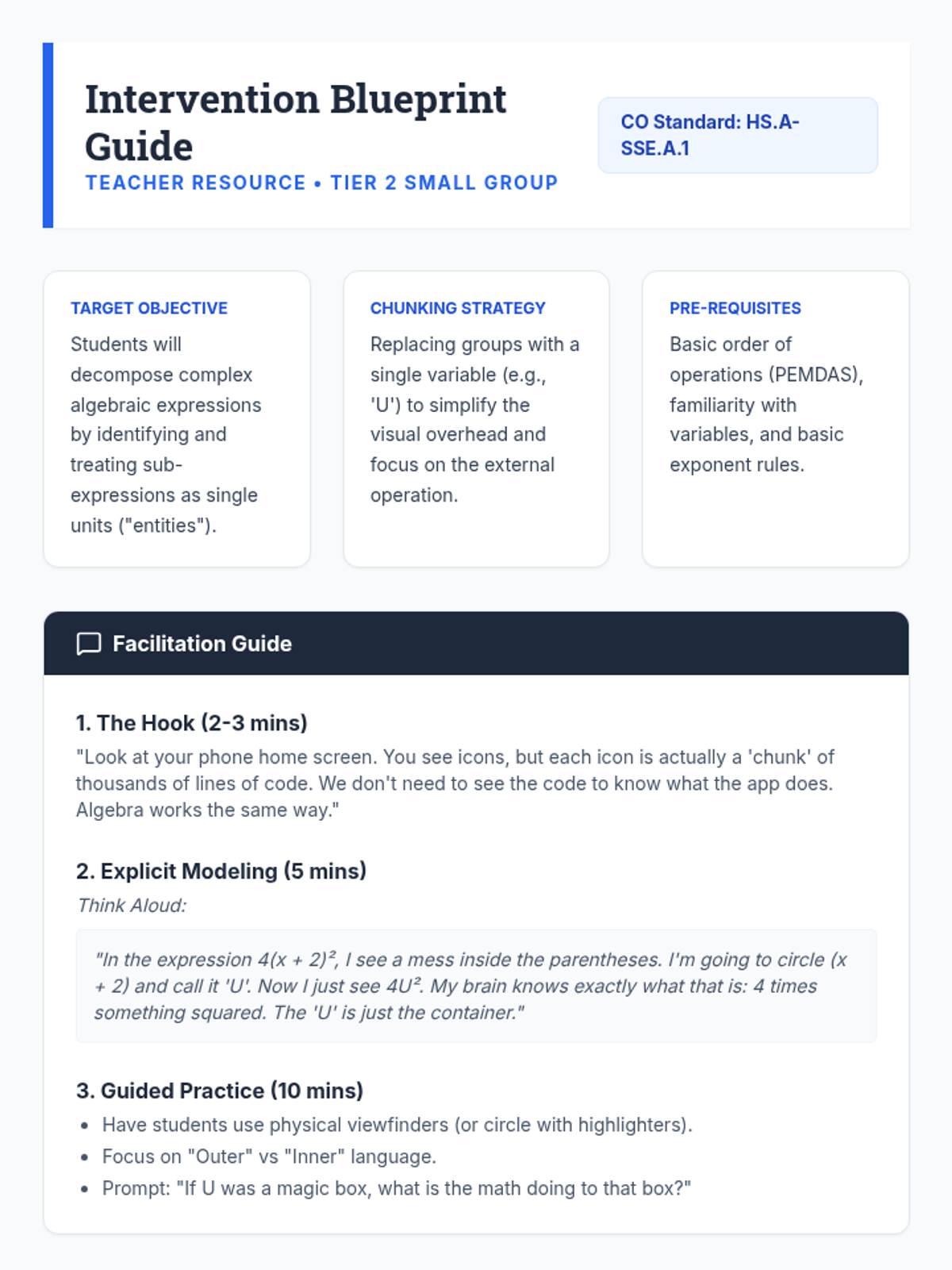 A targeted intervention sequence focused on structural analysis of algebraic expressions, helping students in Tier 2 small groups interpret complicated expressions by viewing parts as single entities.