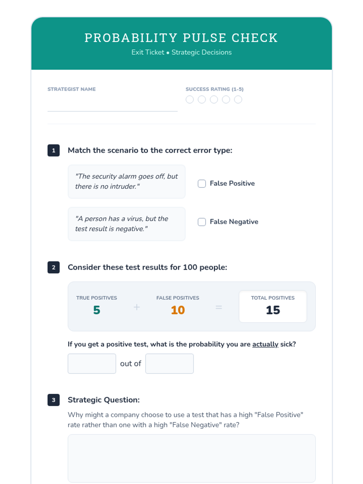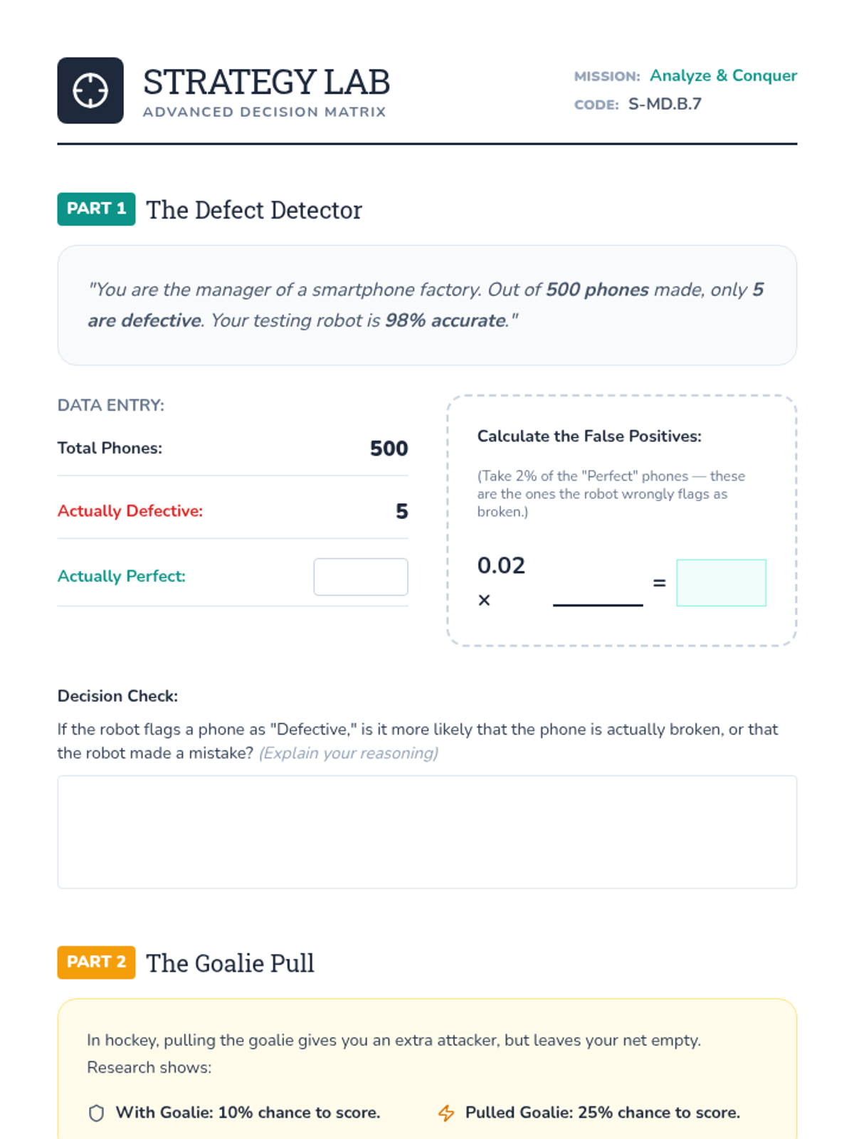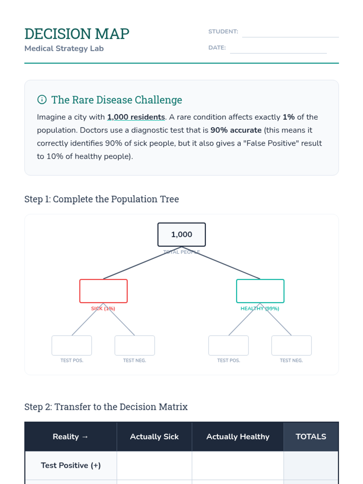 A Tier 2 intervention sequence focused on using probability to analyze decisions, specifically targeting medical testing (false positives/negatives) and game-time strategies. Students learn to use tree diagrams and contingency tables to navigate complex conditional probability scenarios.