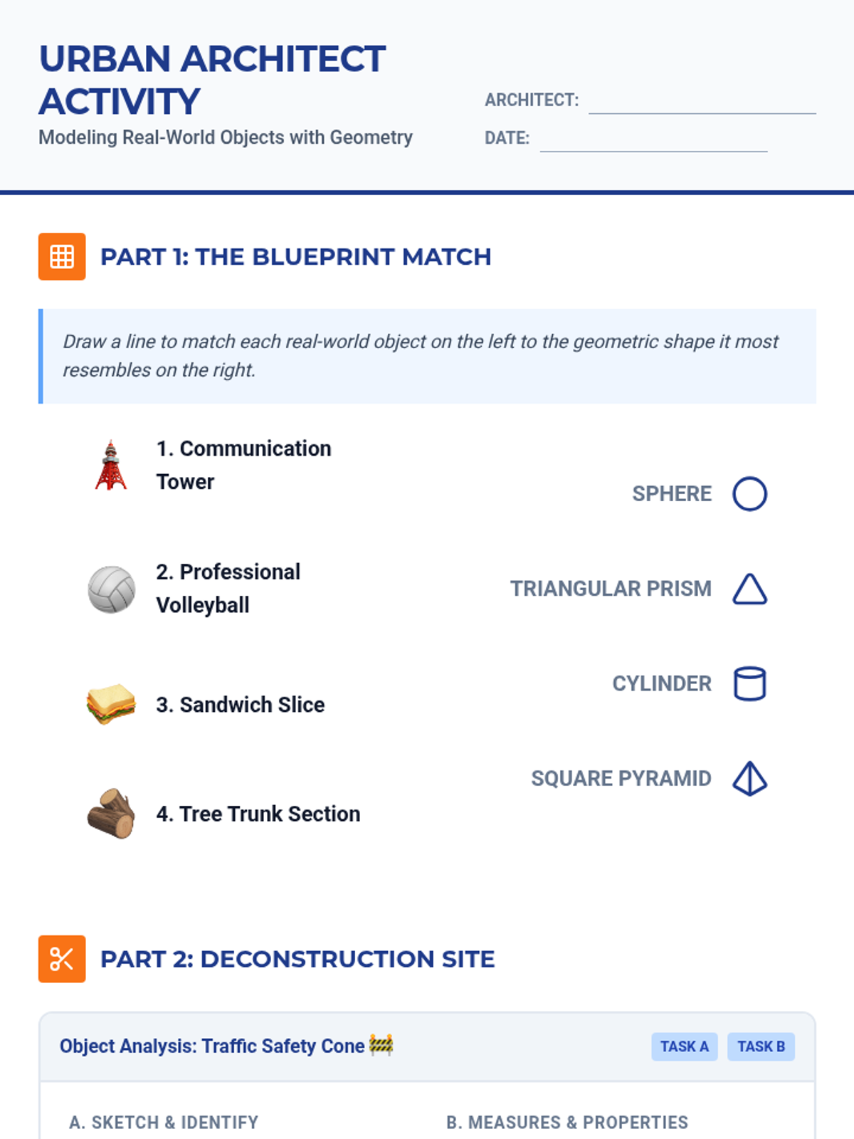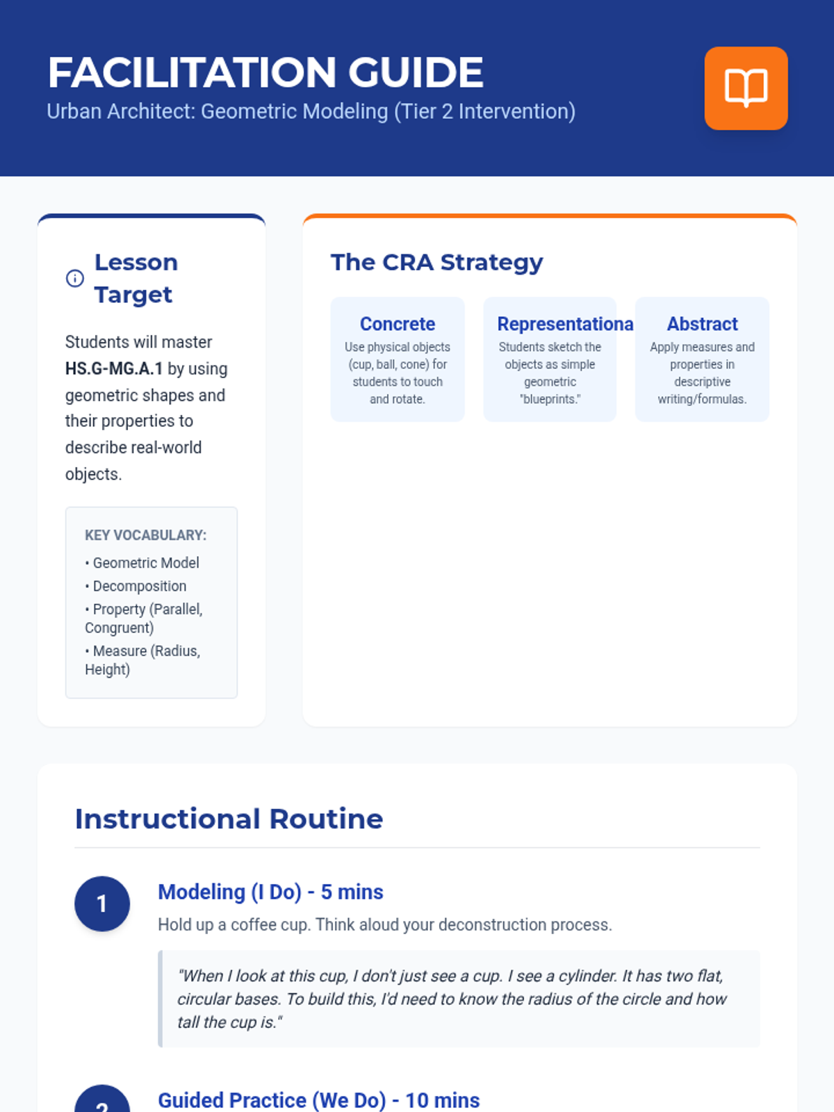 A Tier 2 intervention sequence focused on modeling real-world objects using geometric shapes, measures, and properties. Designed for small group instruction to support students in mastering Colorado High School Geometry standard HS.G-MG.A.1.