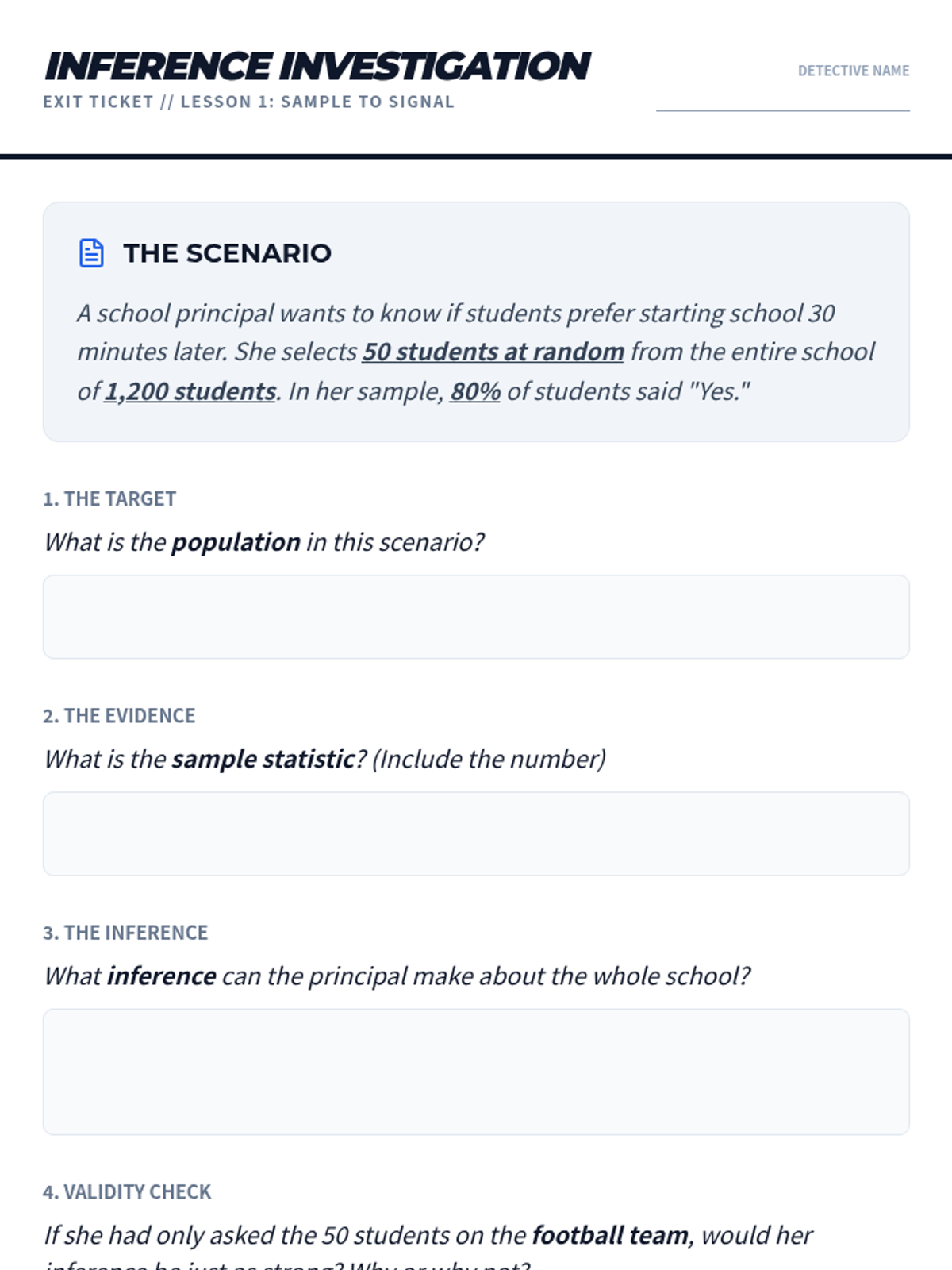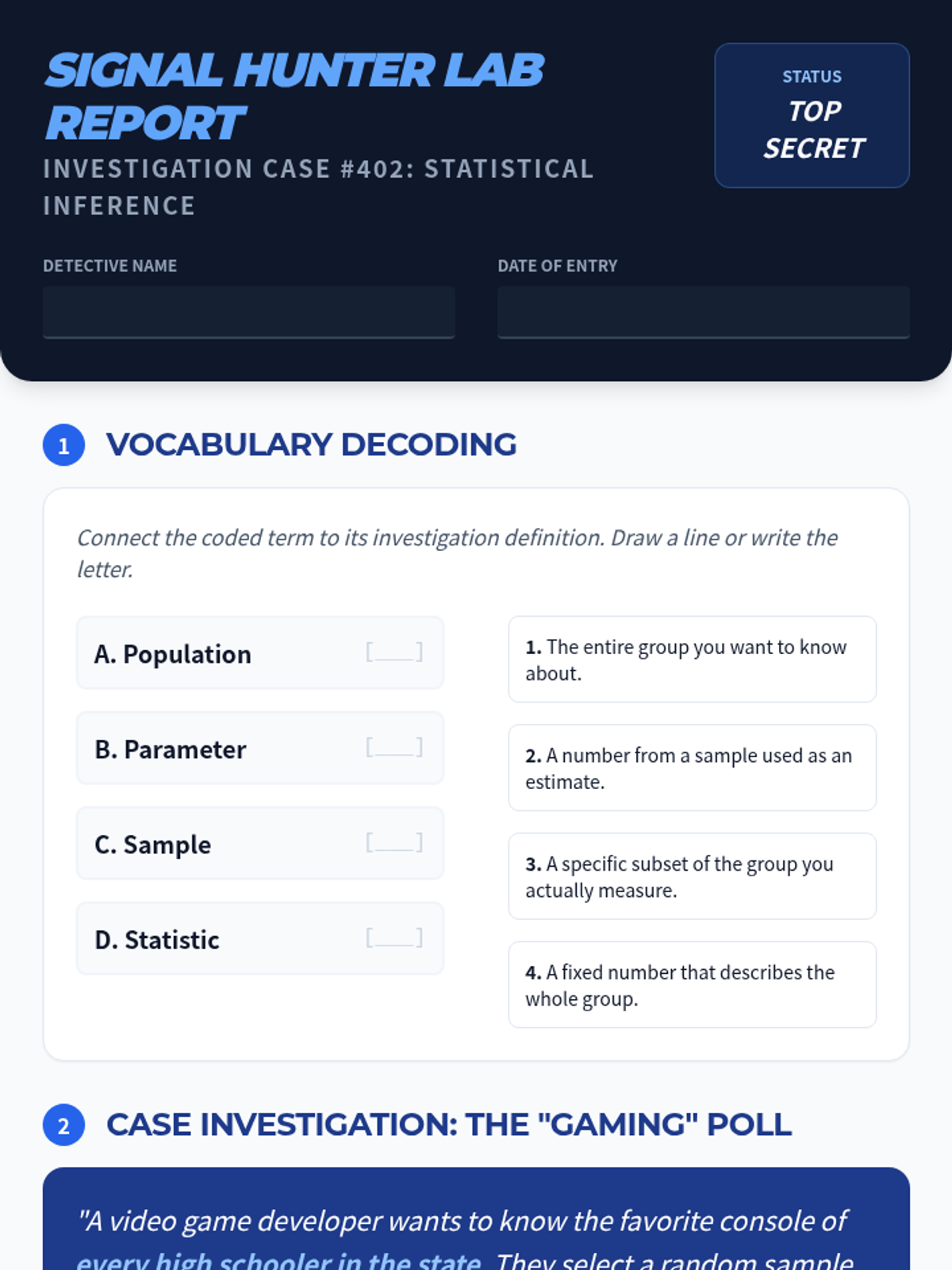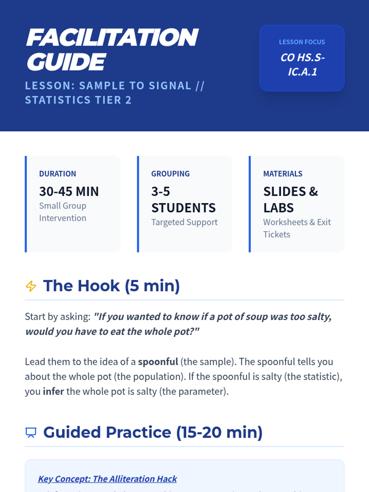 A targeted Tier 2 intervention sequence designed to help high school students master the fundamental concepts of statistical inference, moving from population parameters to sample statistics and back again through real-world applications.