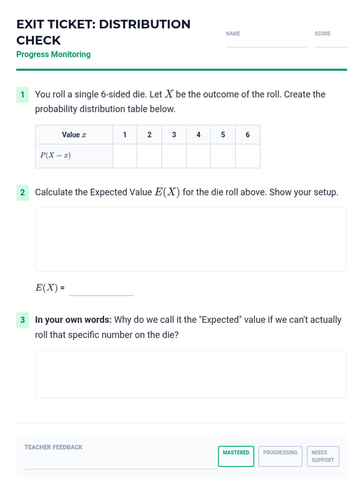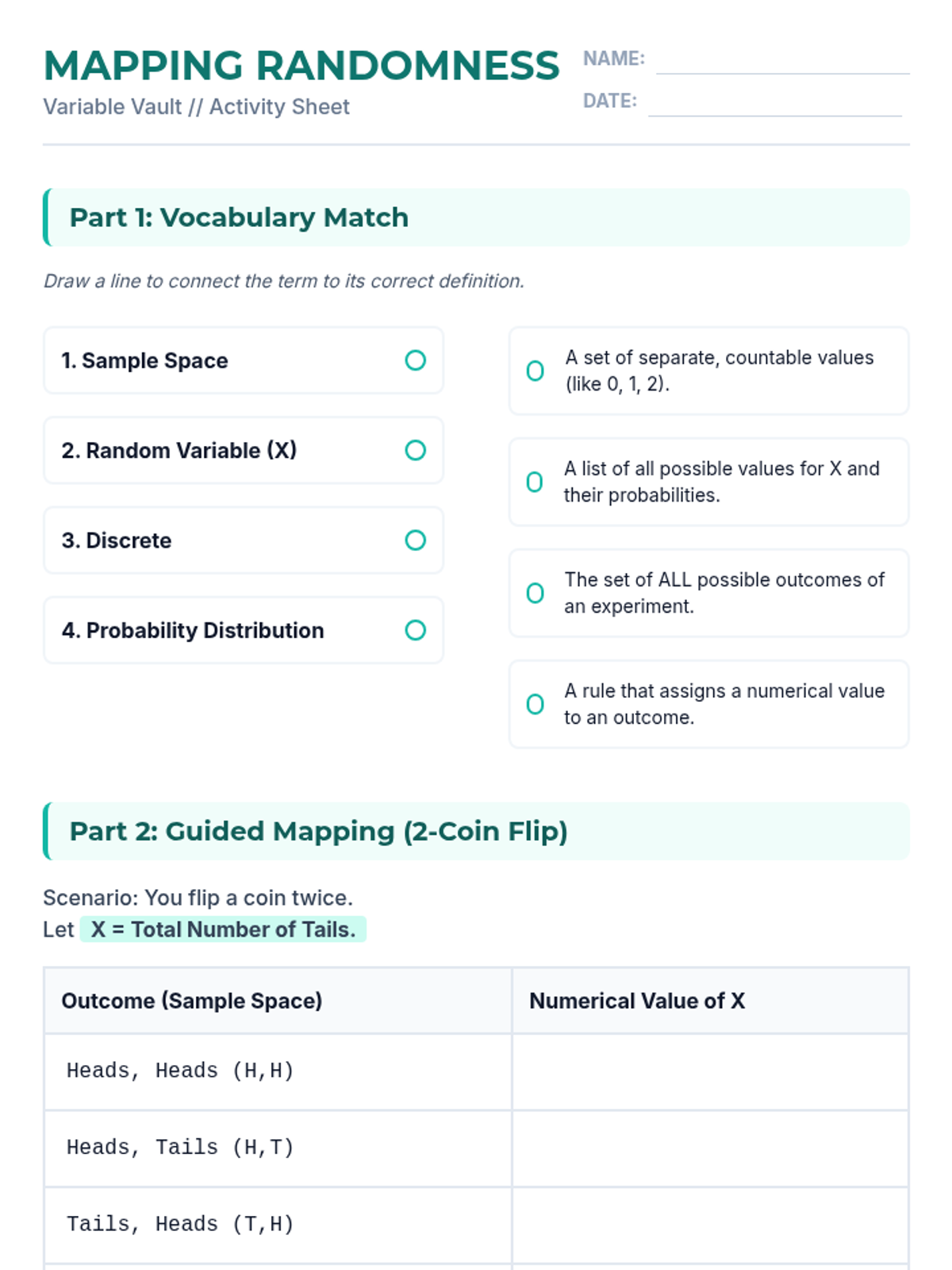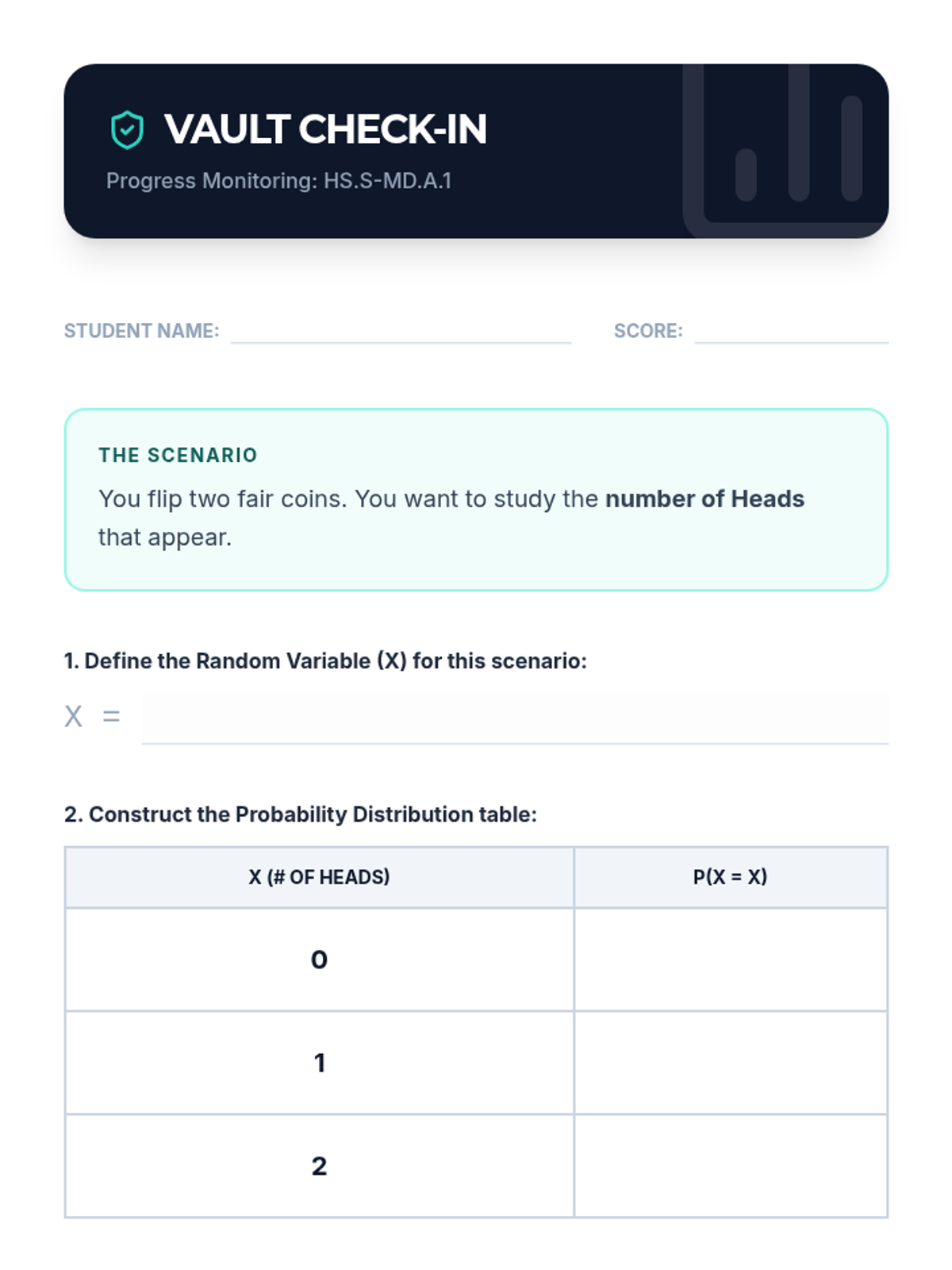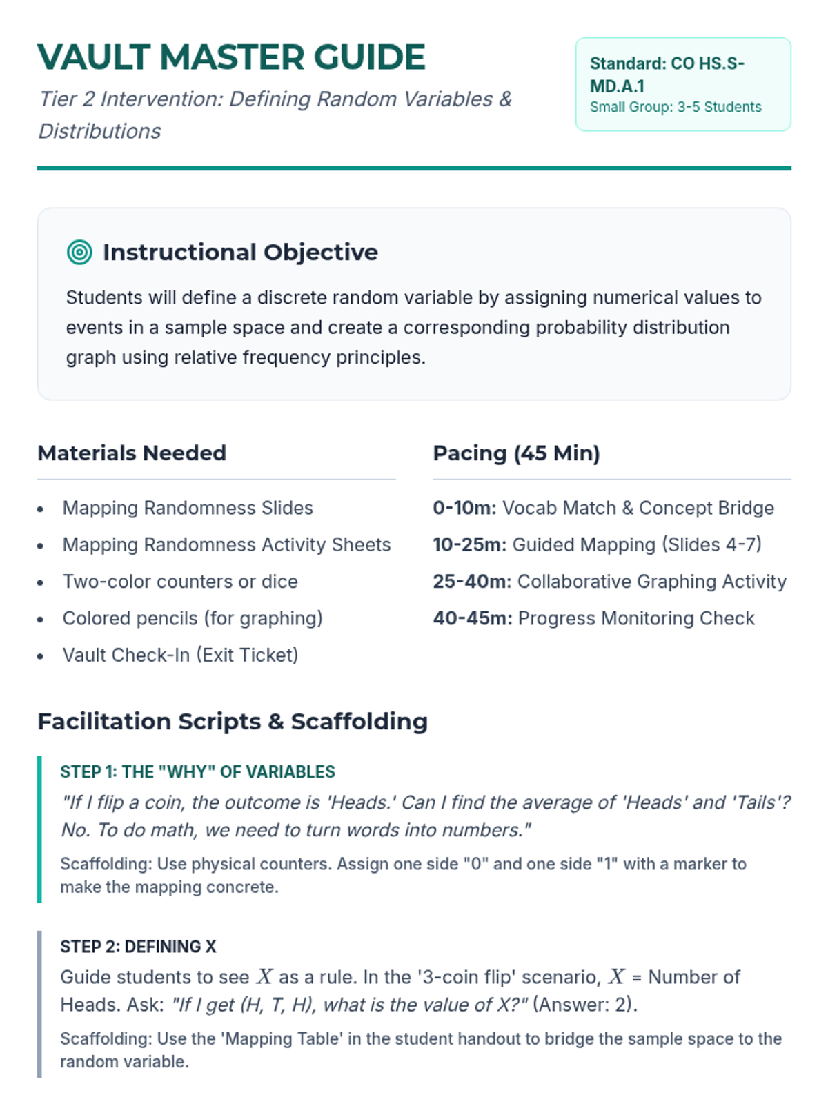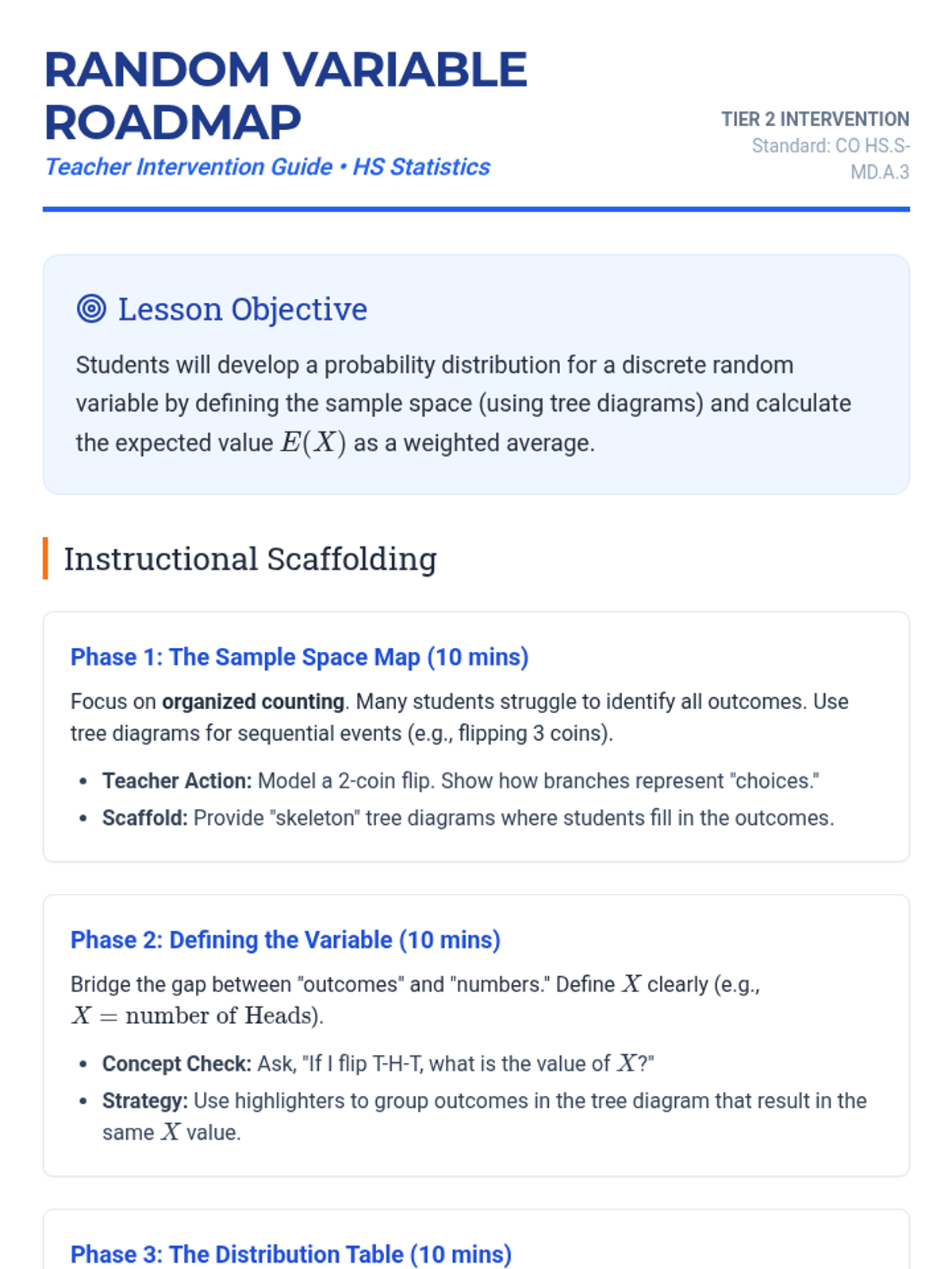 A targeted intervention sequence focused on foundational probability concepts, specifically defining random variables and constructing probability distributions for high school statistics students.