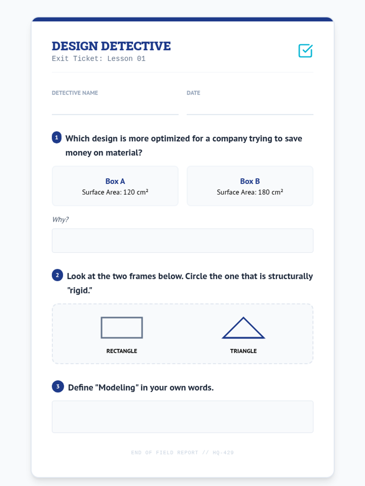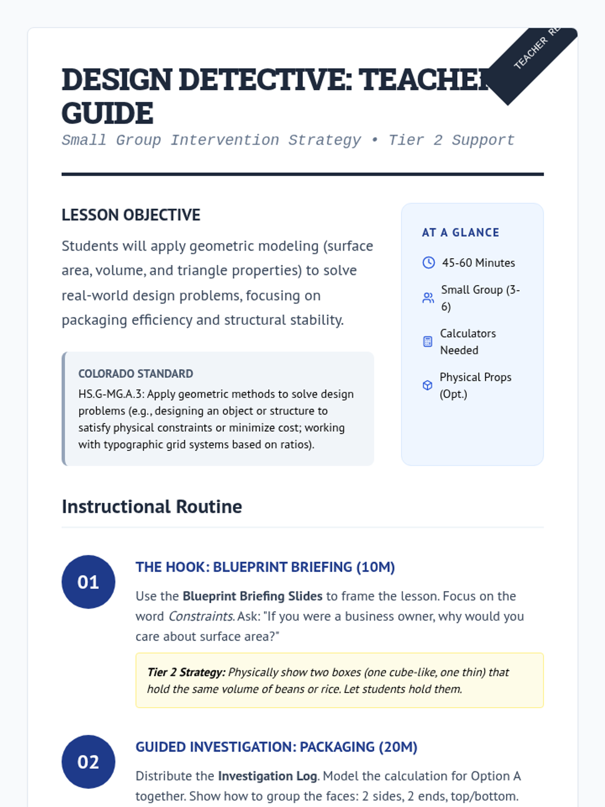 A specialized geometry intervention sequence focused on applying geometric principles to real-world design challenges, specifically tailored for Tier 2 high school learners. The sequence emphasizes modeling, optimization, and structural integrity through hands-on design tasks.