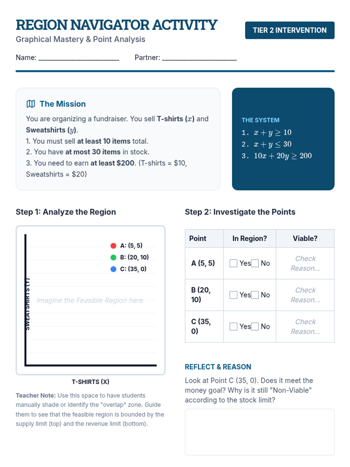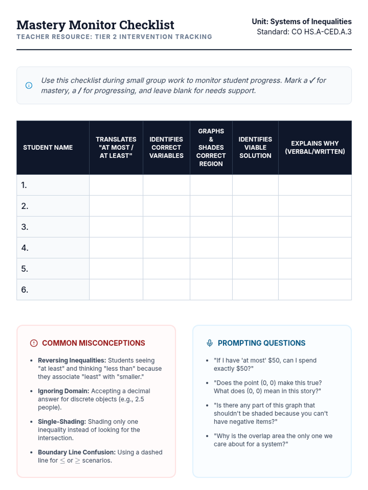 A targeted intervention sequence focused on translating verbal constraints into mathematical inequalities, graphing systems to find feasible regions, and interpreting solutions in real-world contexts. Designed for Tier 2 small group support.