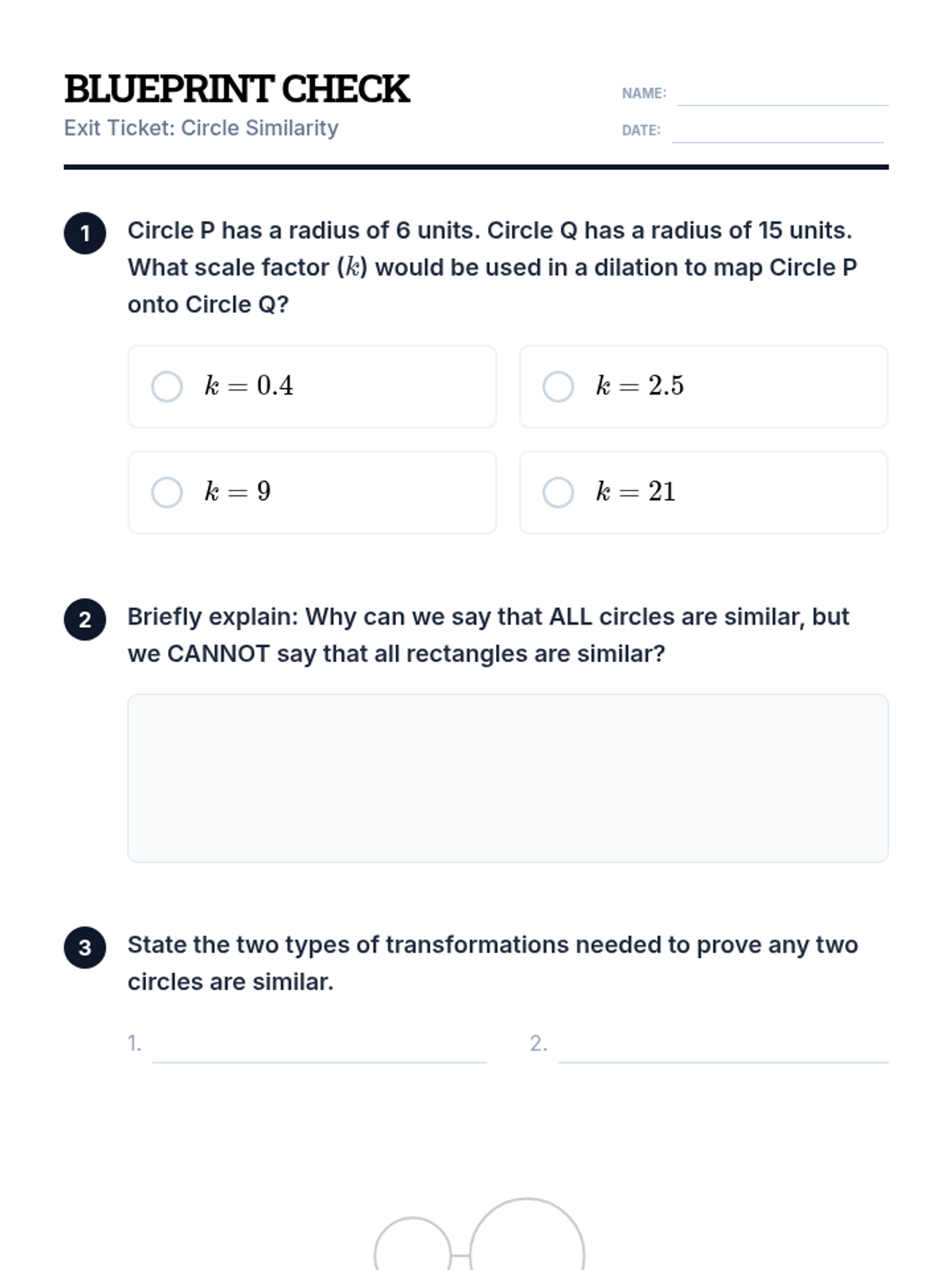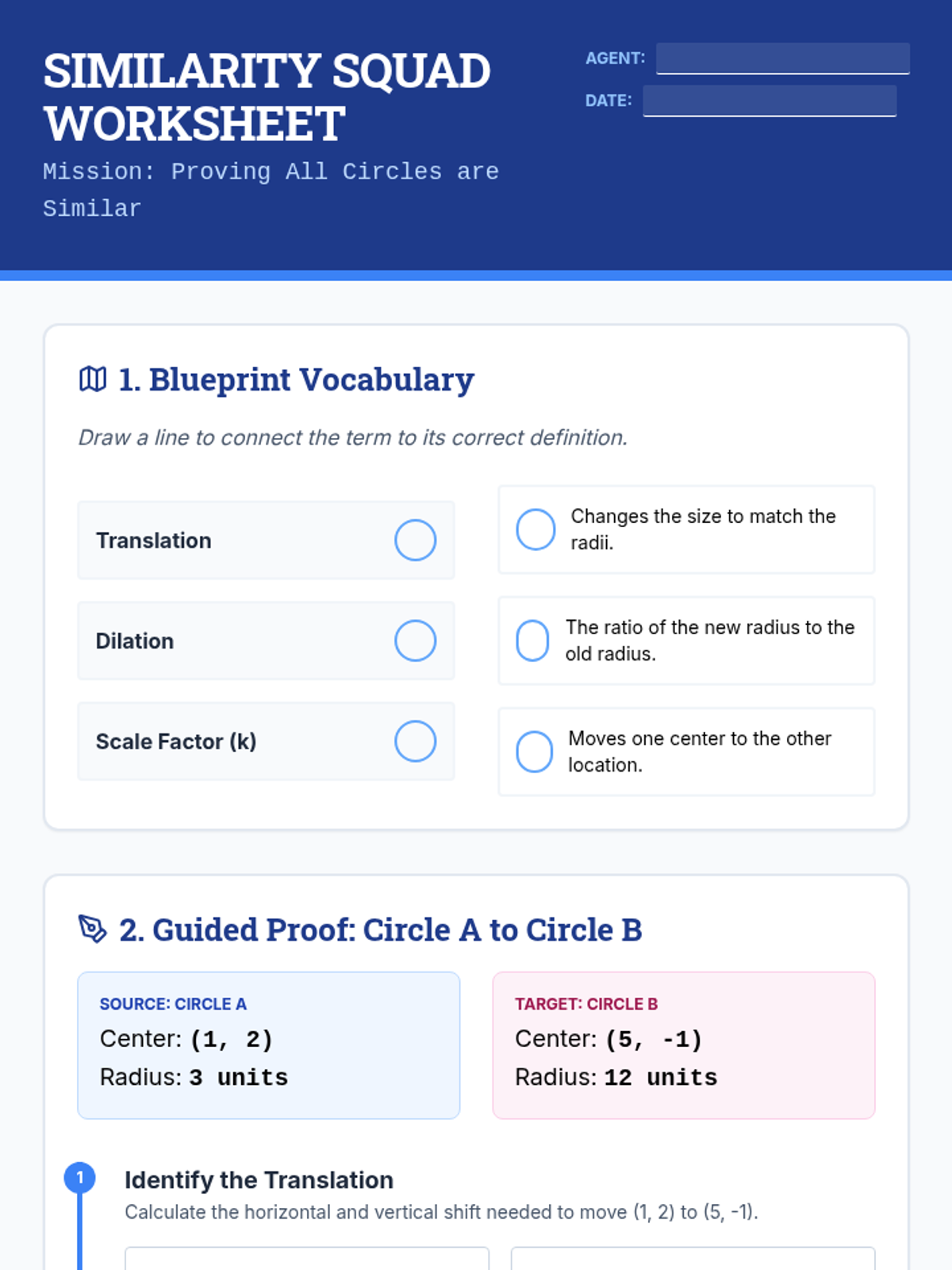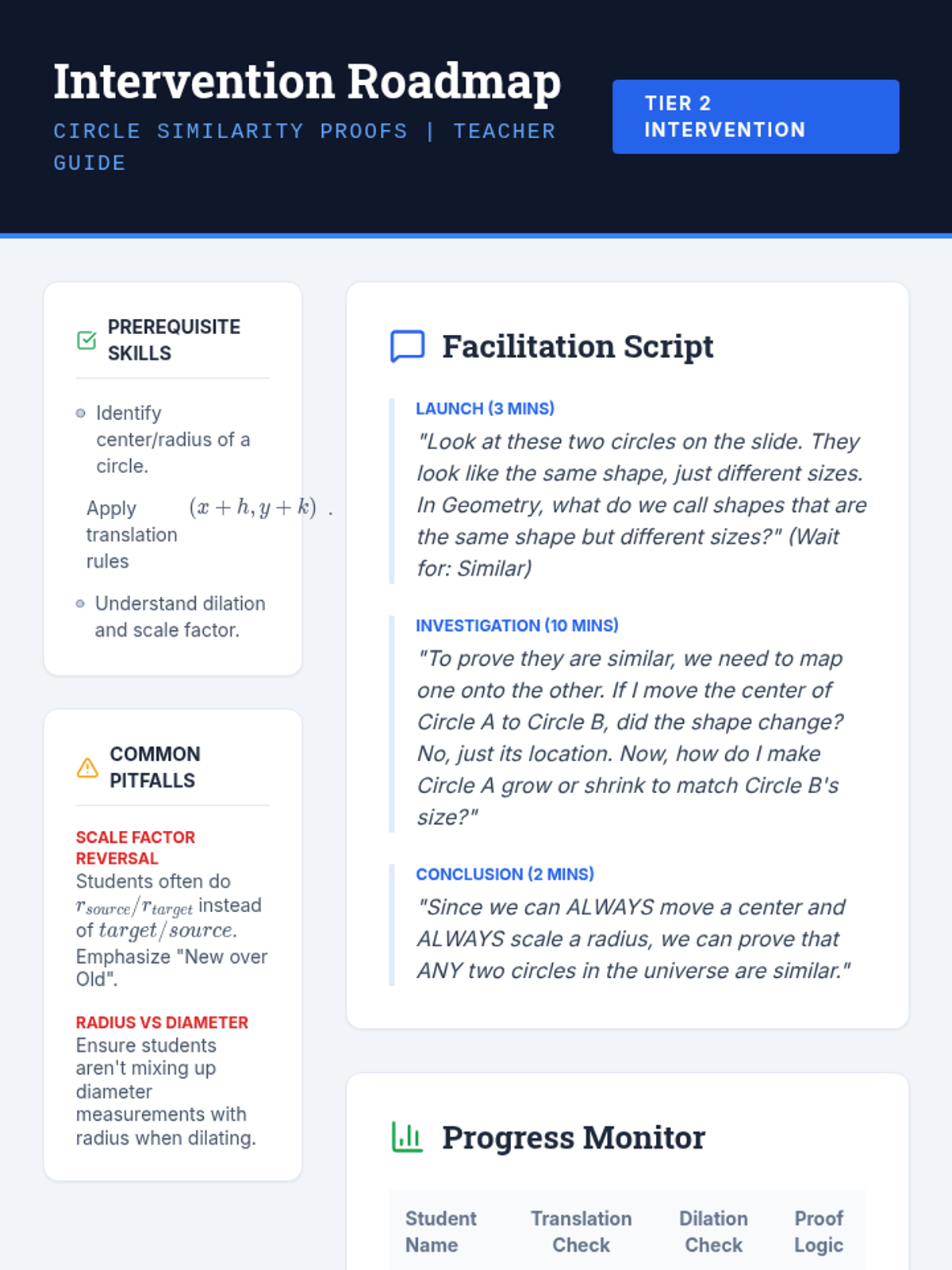 A targeted intervention sequence for high school geometry students to master circle similarity through transformations and coordinate proofs.