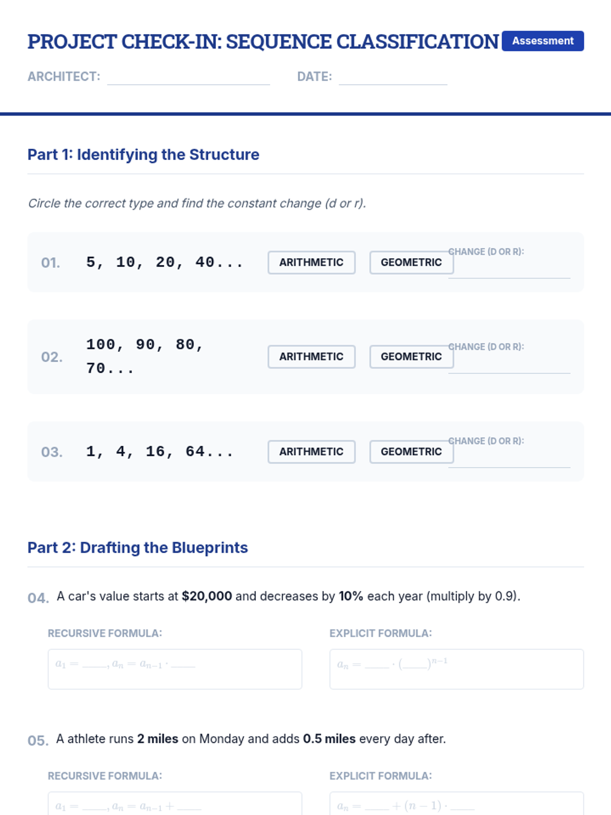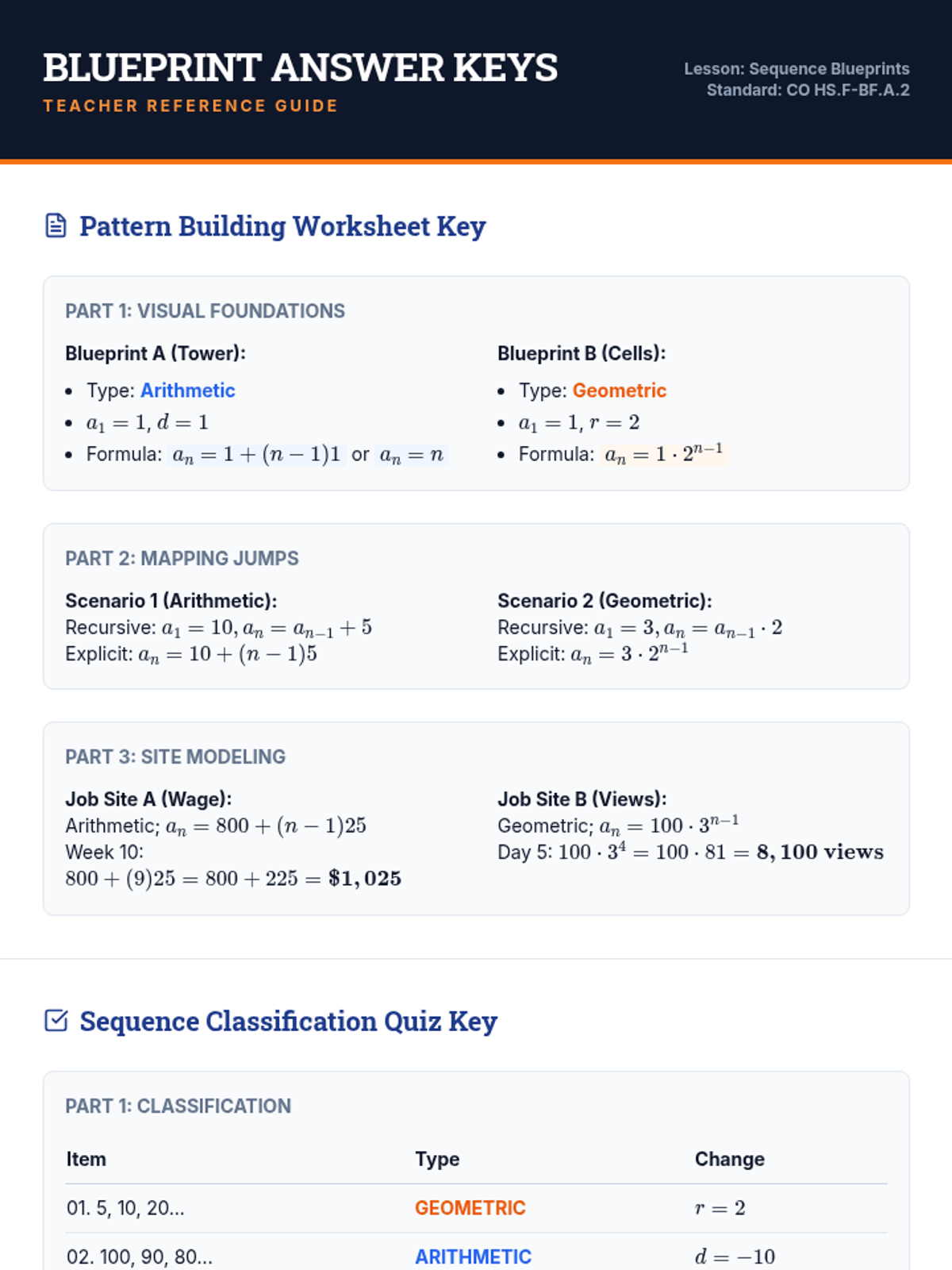A targeted intervention sequence focused on helping high school students master arithmetic and geometric sequences through visual patterns, number lines, and real-world modeling. This sequence aligns with Colorado standard HS.F-BF.A.2.
