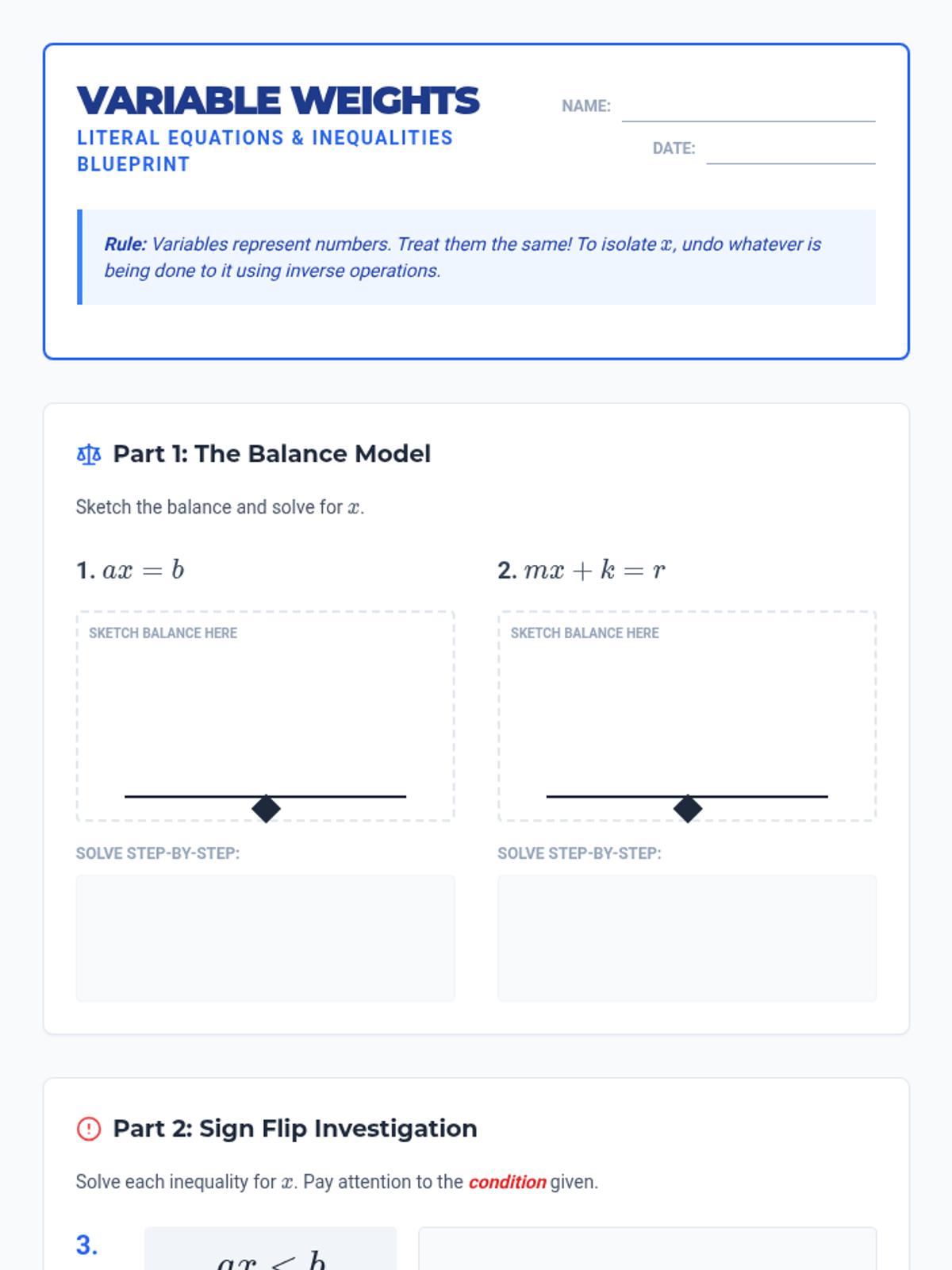 A targeted intervention sequence focusing on solving linear equations and inequalities with variable coefficients, specifically designed for high school students needing Tier 2 support.