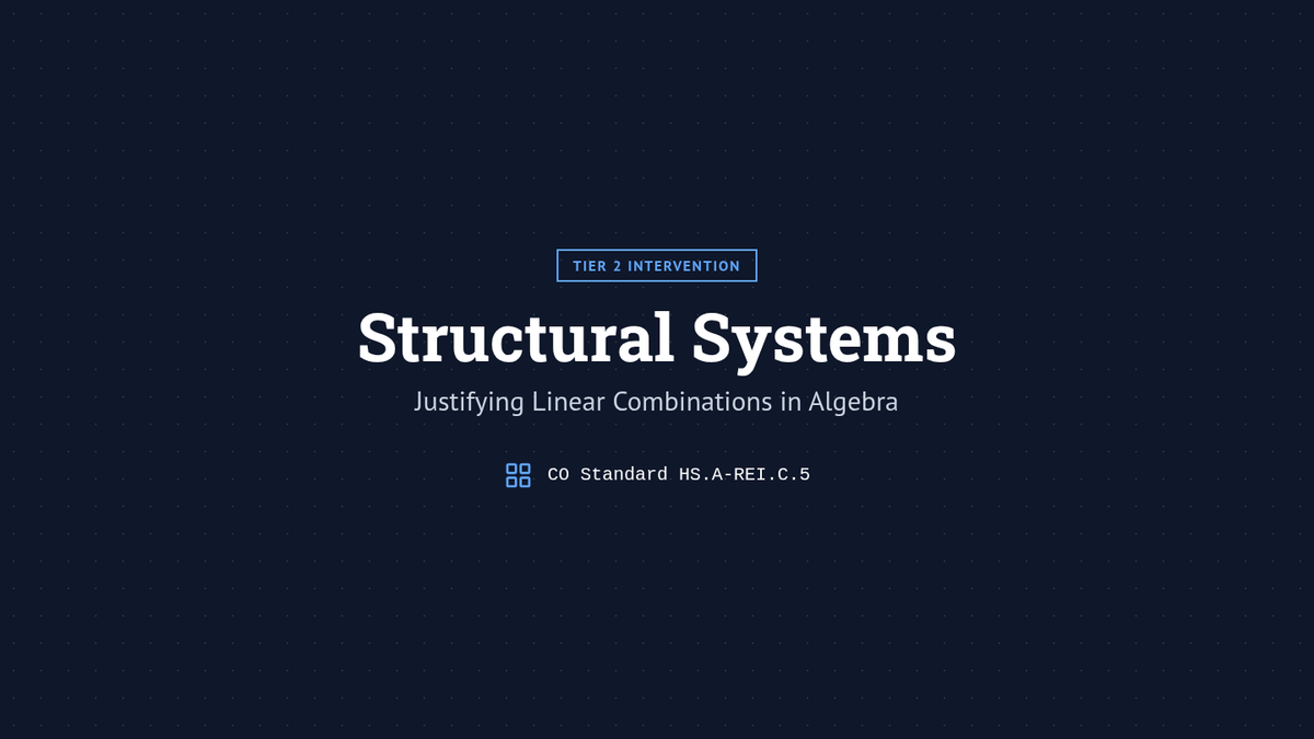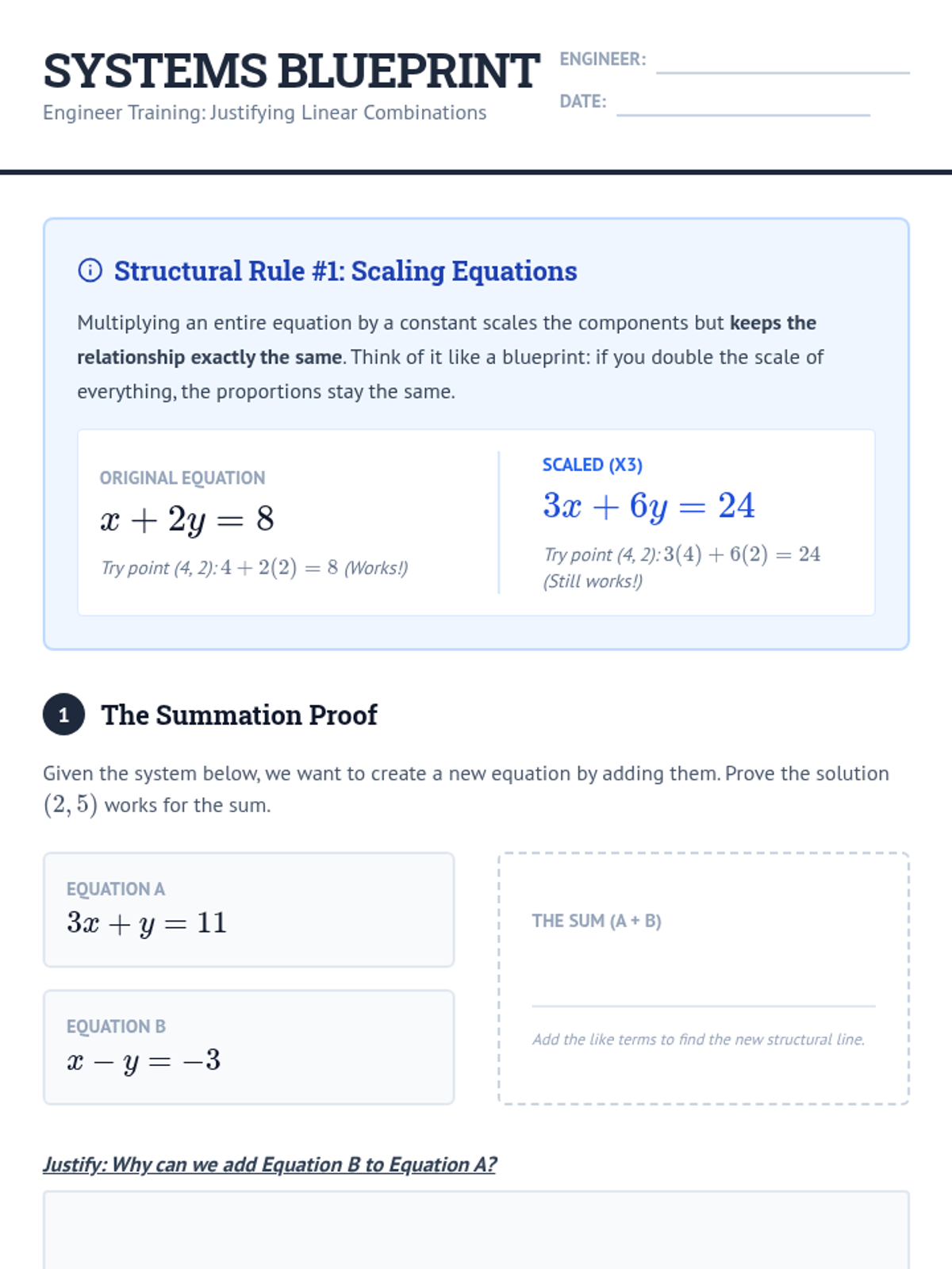 A targeted intervention sequence focused on the logic and justification behind solving systems of equations through linear combinations, ensuring students understand why the methods work.