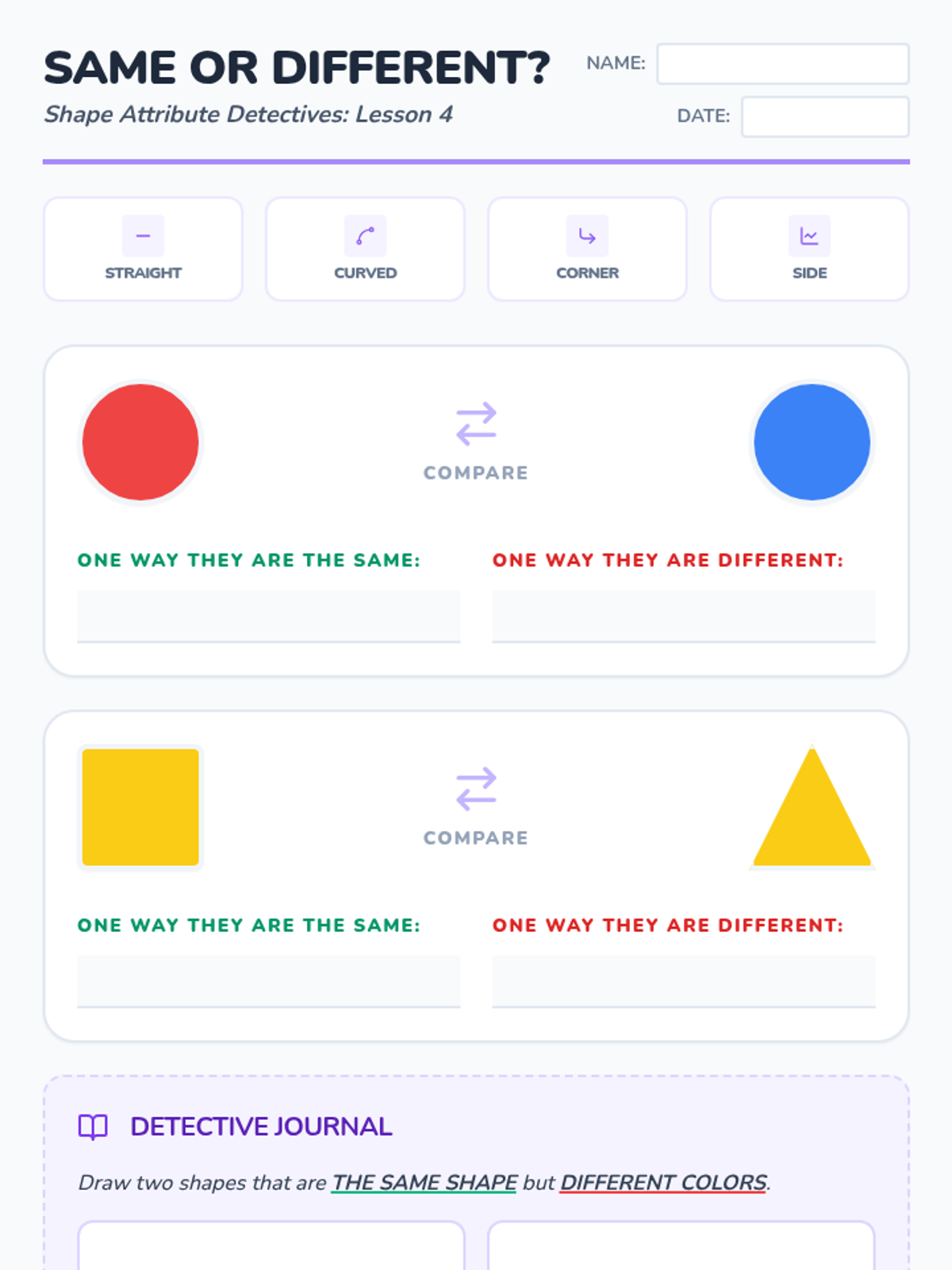 A Pre-K geometry sequence focused on classifying shapes by color, size, orientation, and numerical attributes like sides and corners. Students develop critical thinking by articulating sorting rules and identifying similarities and differences between geometric figures.