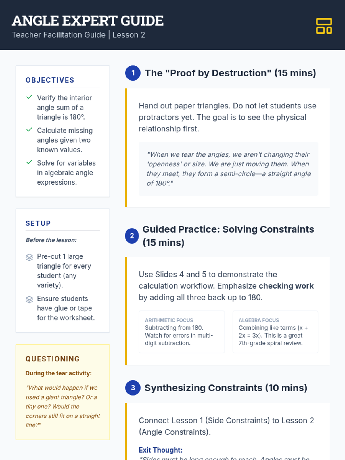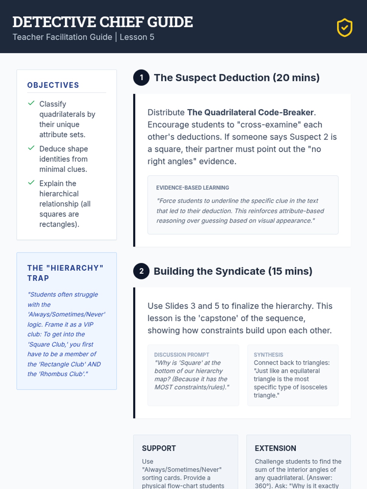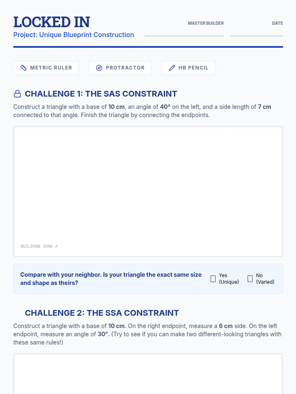 A comprehensive geometry sequence for 7th grade focusing on the mathematical rules of shape existence, including the Triangle Inequality Theorem, angle sums, unique vs. ambiguous constructions, and quadrilateral hierarchies. Students act as geometric architects, analyzing constraints to determine if shapes can exist and if they are unique.