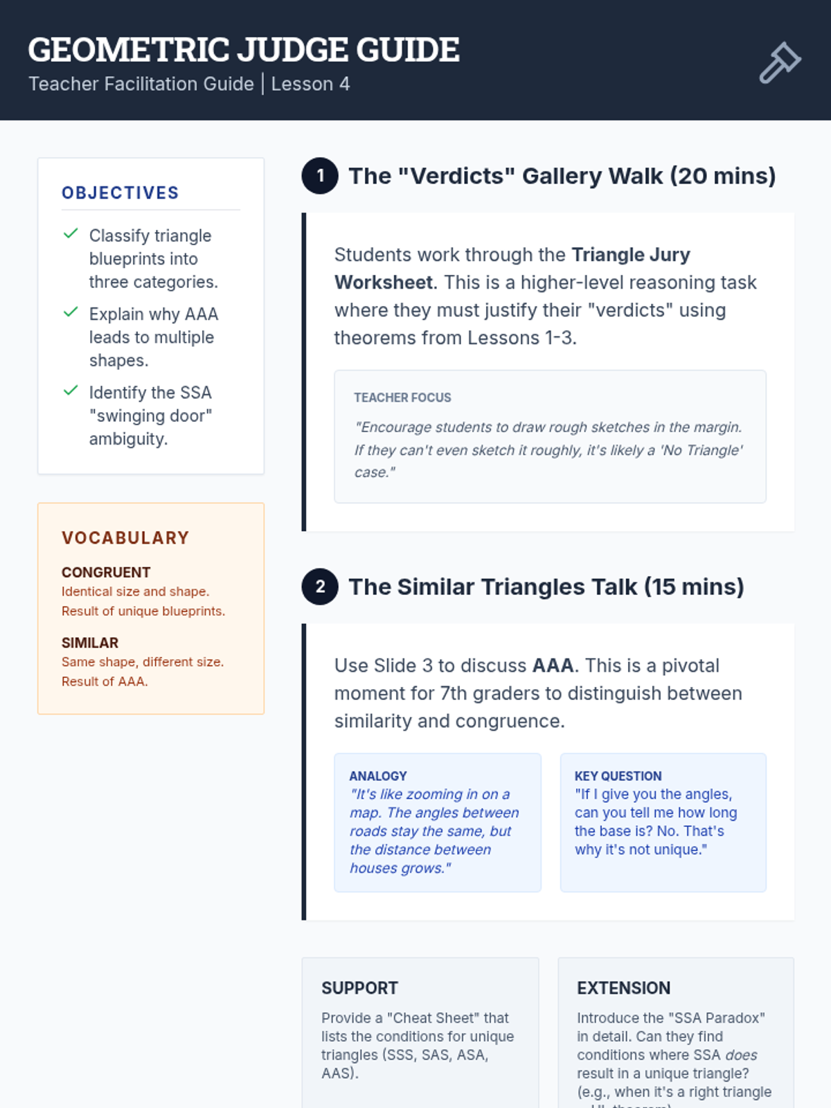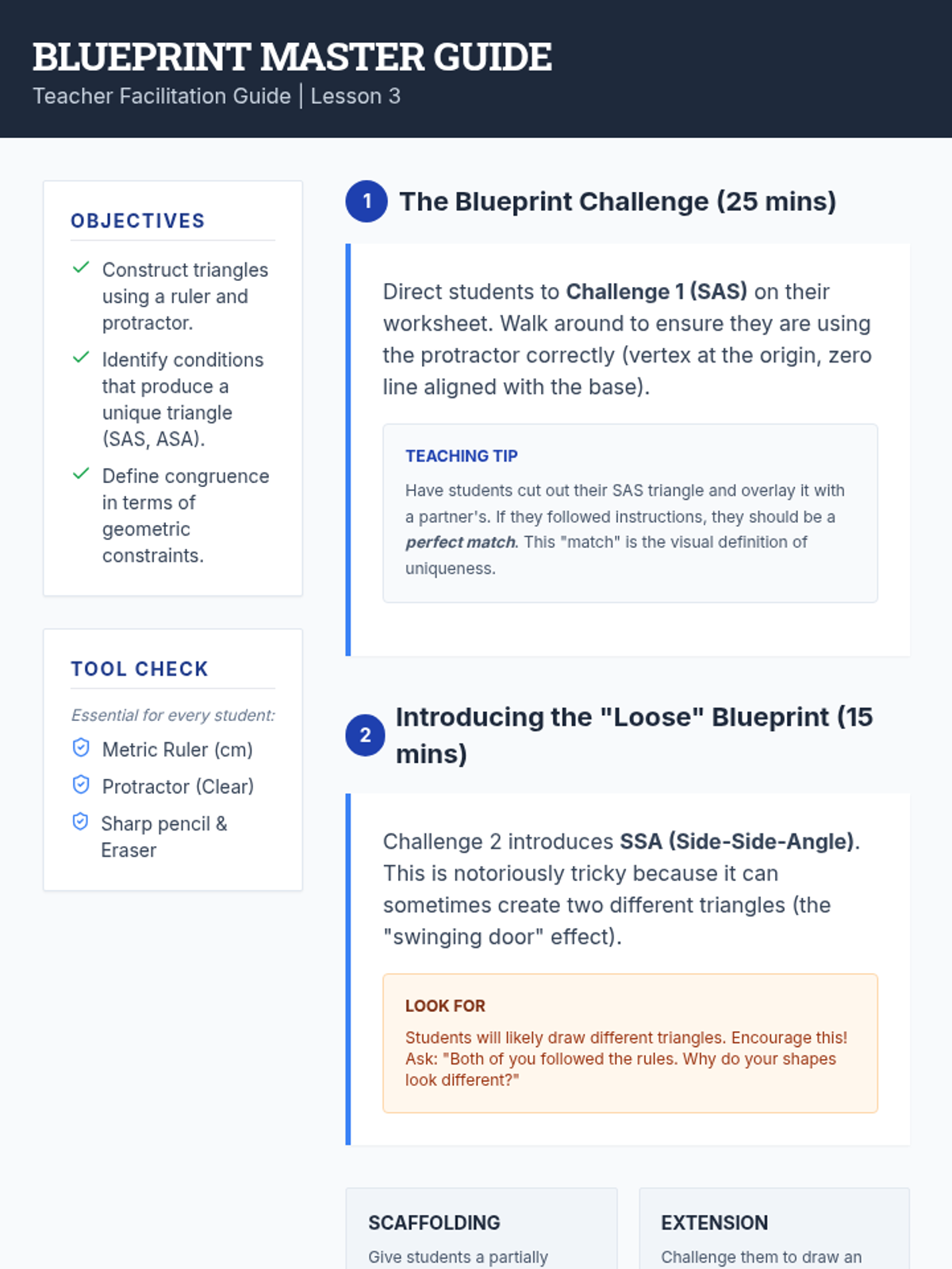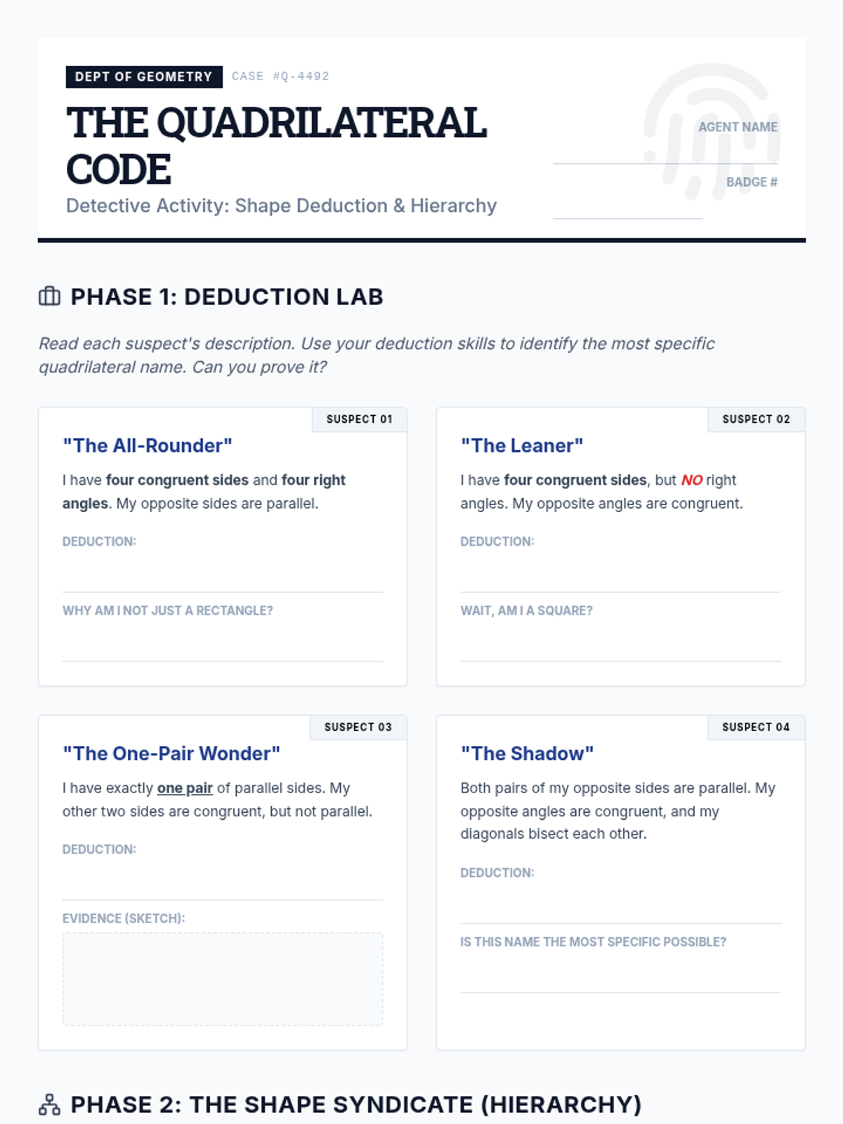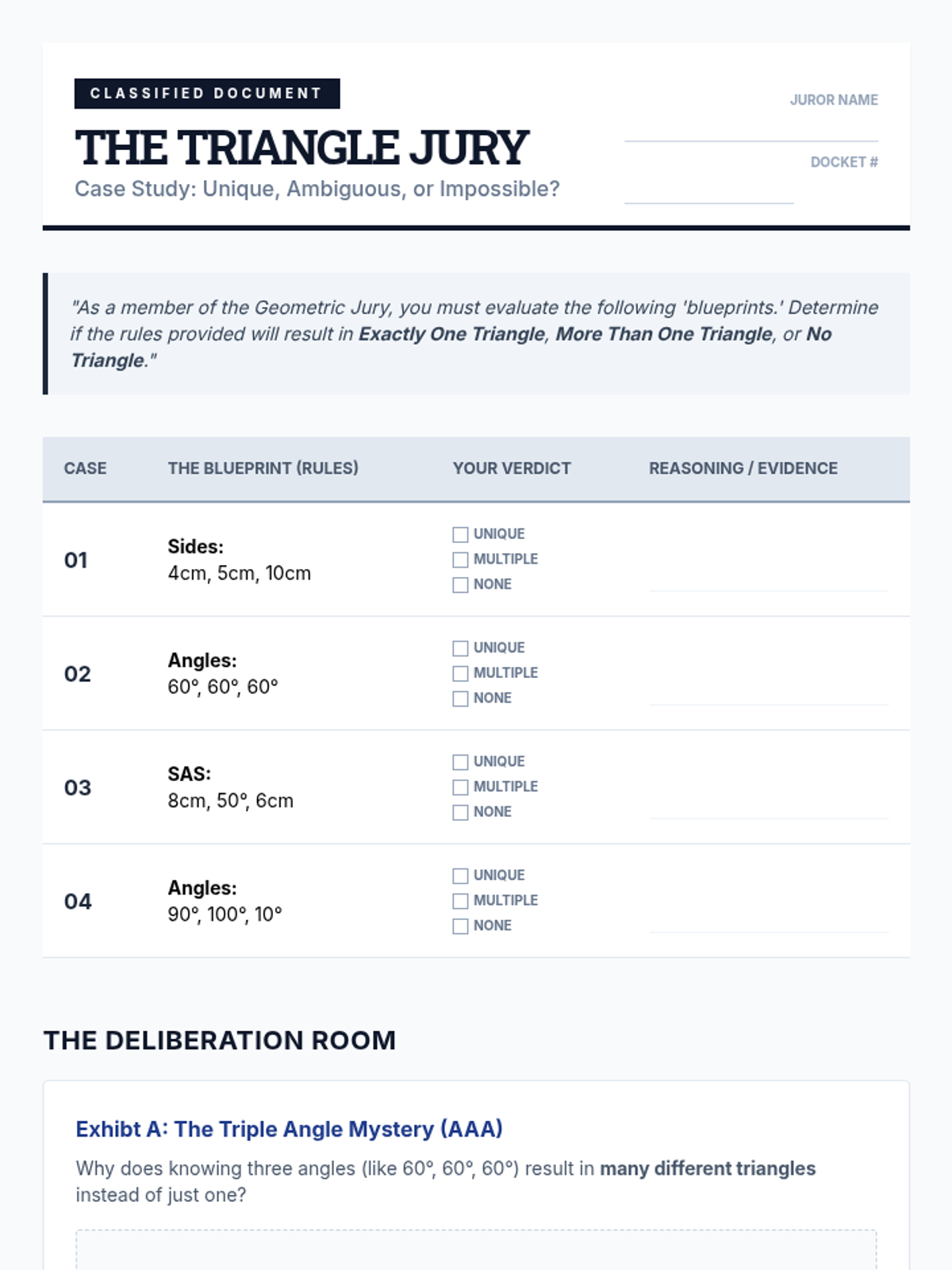 A comprehensive geometry sequence for 7th grade focusing on the mathematical rules of shape existence, including the Triangle Inequality Theorem, angle sums, unique vs. ambiguous constructions, and quadrilateral hierarchies. Students act as geometric architects, analyzing constraints to determine if shapes can exist and if they are unique.