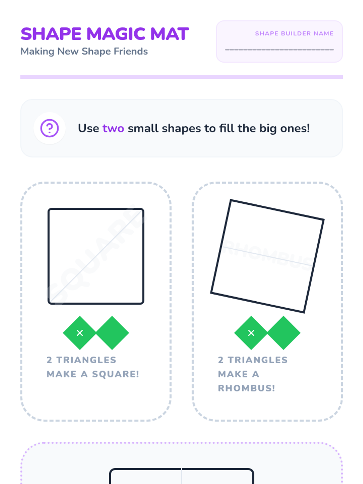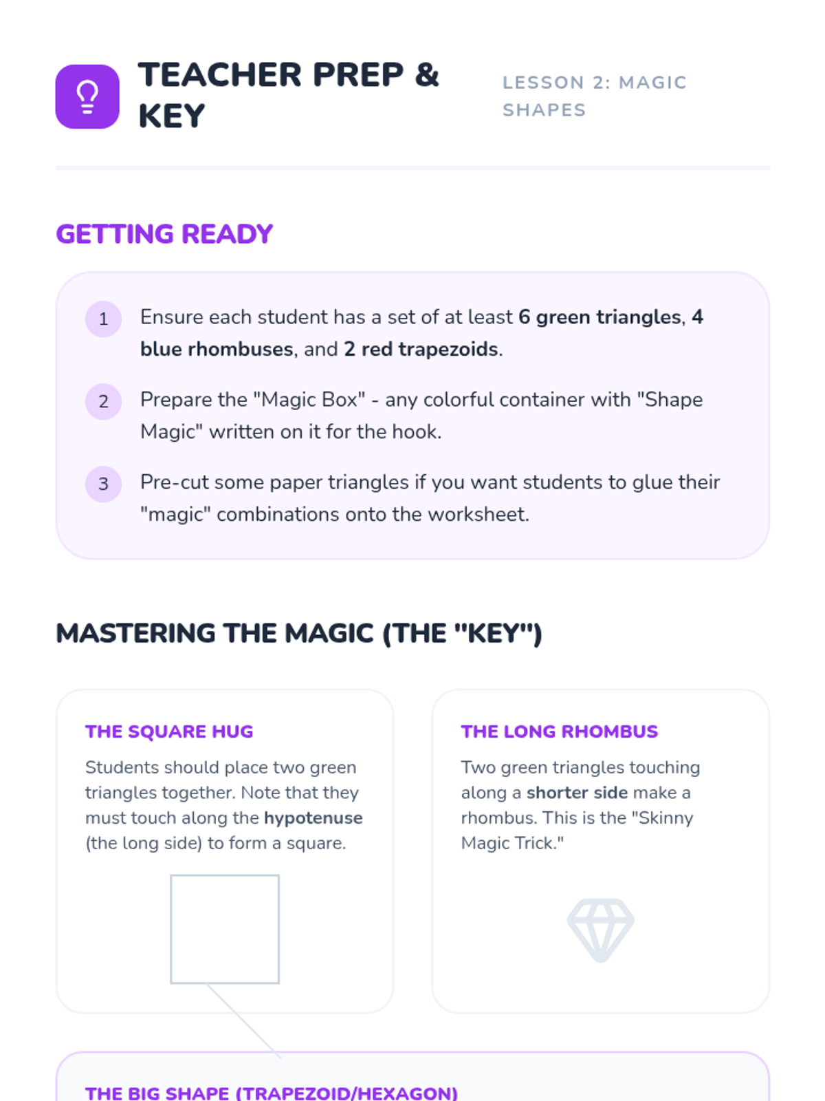 A hands-on geometry sequence for Pre-K students exploring how smaller shapes combine to form larger figures. Students use pattern blocks, tangrams, and paper cutouts to develop spatial awareness and creative construction skills.