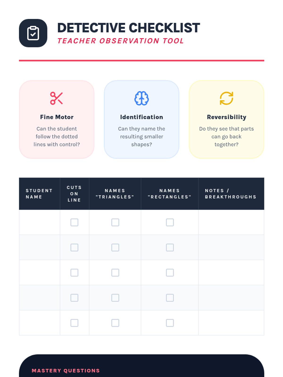 A kinesthetic Pre-K math sequence where students explore geometric attributes through whole-body movement, tactile construction with sticks and clay, and boundary-stretching activities. Students develop spatial awareness and fine motor skills while learning to identify and build circles, squares, and triangles.