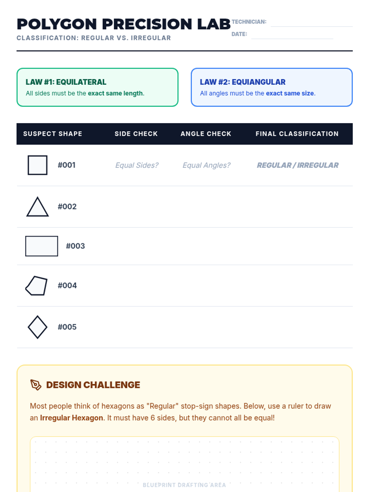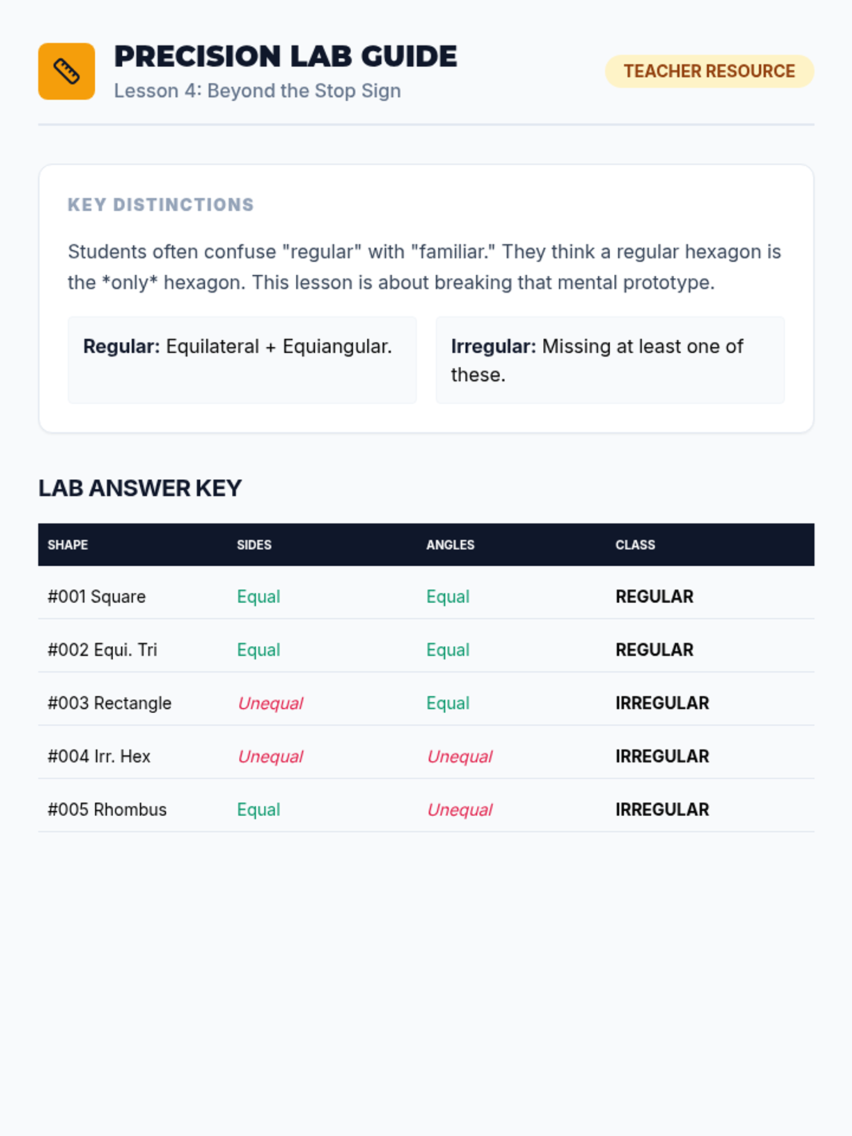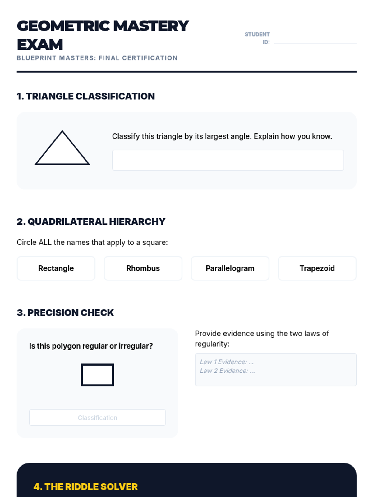 A comprehensive 4th-grade unit exploring the classification of 2D shapes based on angles, lines, and attributes, moving from basic triangles to complex quadrilateral hierarchies and regular polygons.
