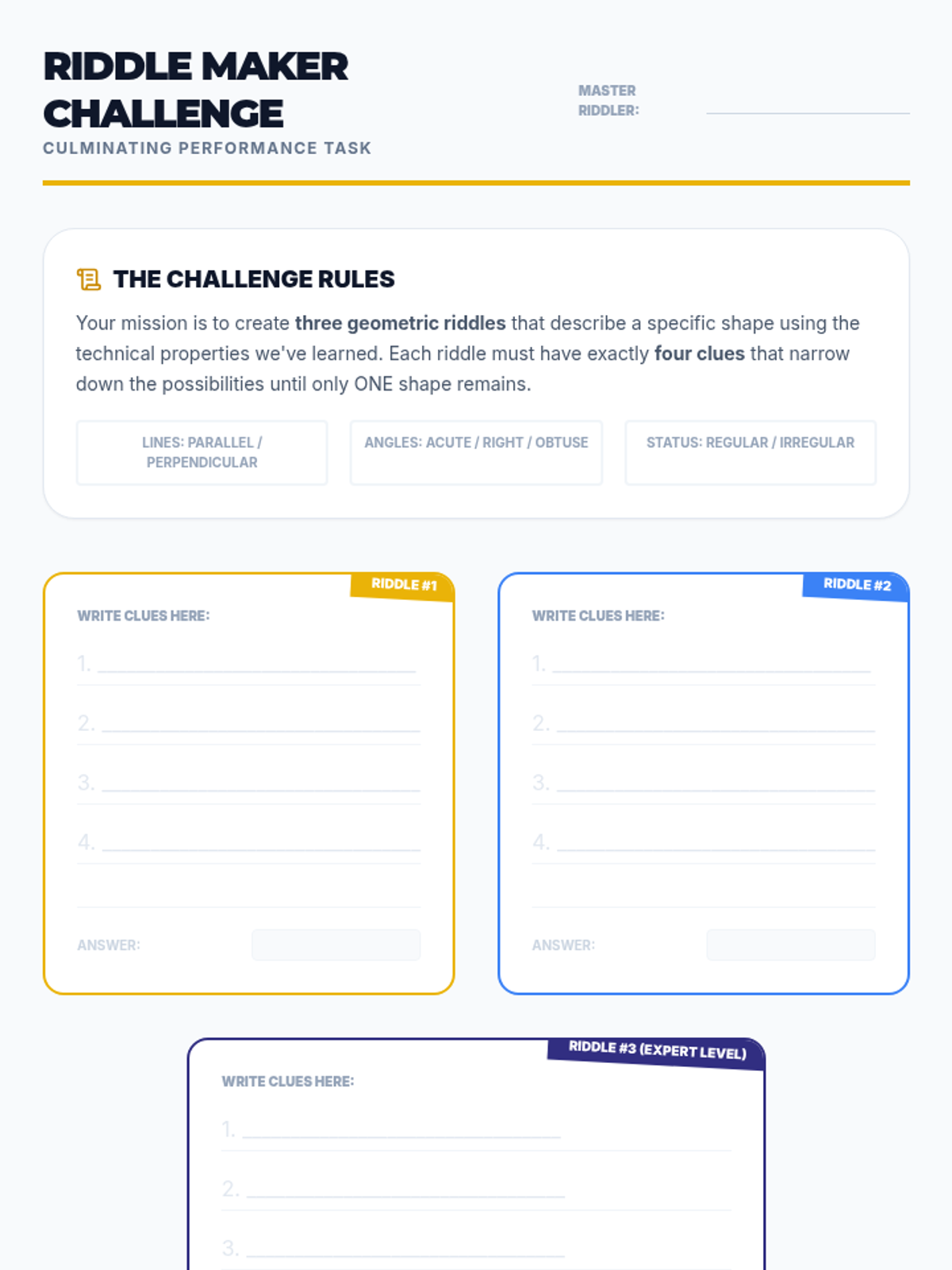 A two-week enrichment project where students act as architects to research, design, and calculate the geometry of a modern structure. The project covers points, lines, angles, and 2D shape classification through real-world application and creative design.