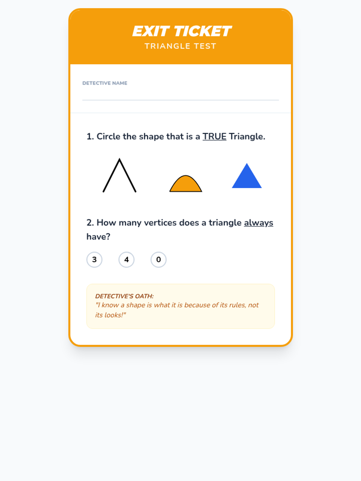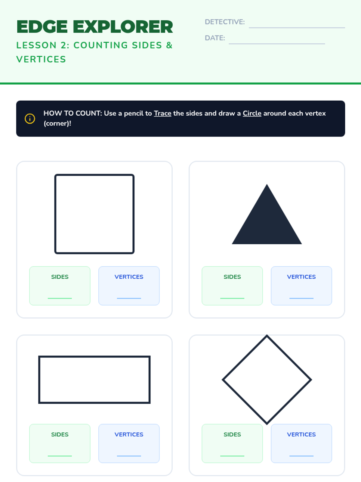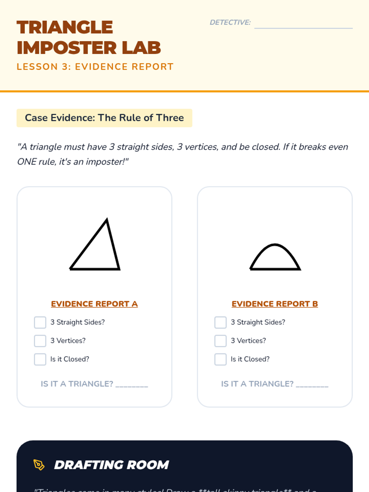 A 1st Grade geometry sequence focused on distinguishing between defining attributes (sides, vertices) and non-defining attributes (color, size, orientation) of 2D shapes. Students act as 'Shape Detectives' to classify triangles, rectangles, and squares.
