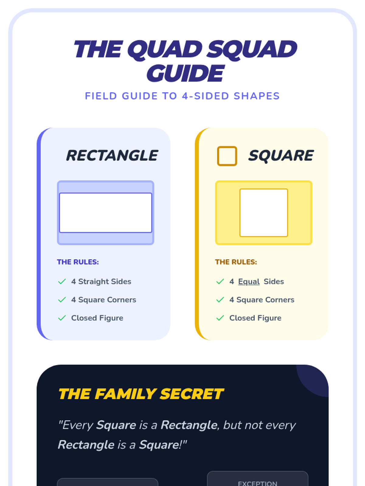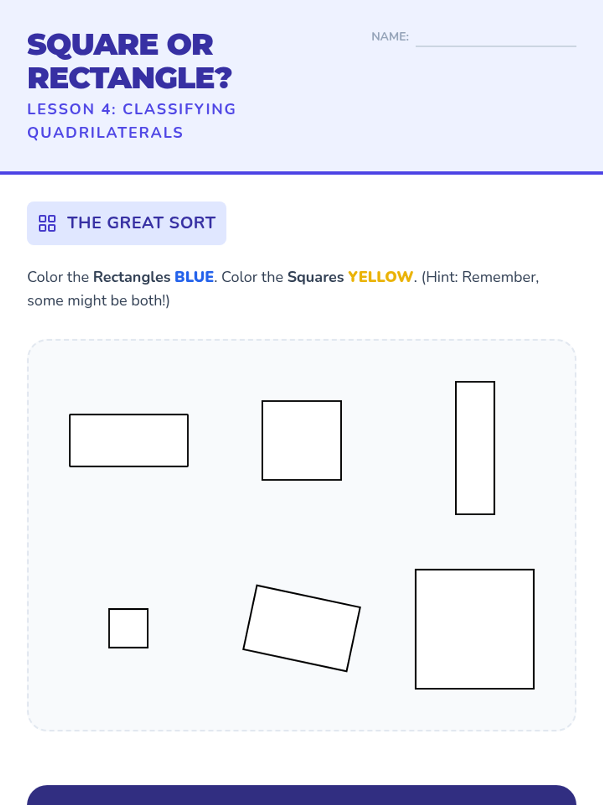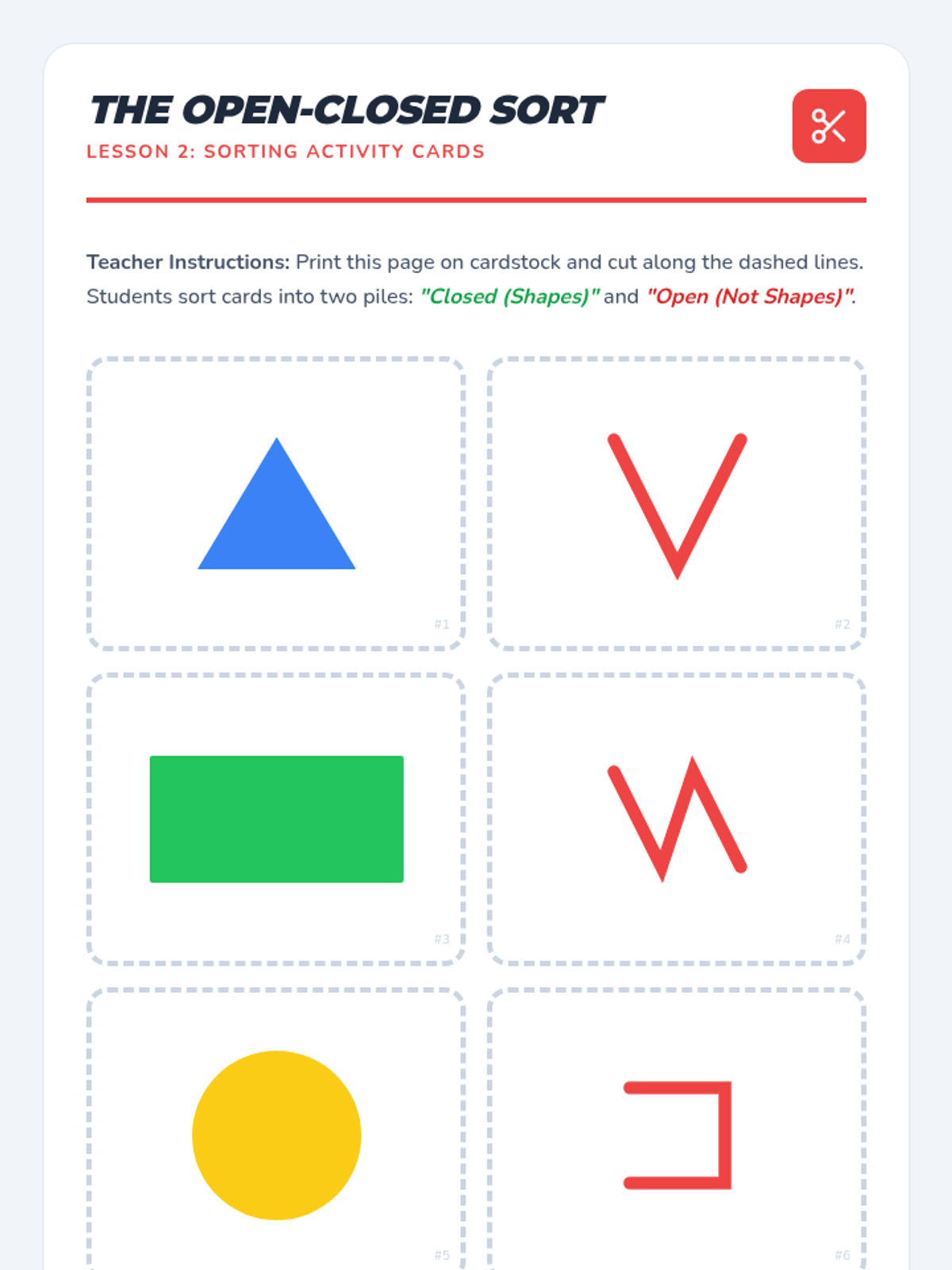 A 1st Grade geometry sequence focused on distinguishing between defining attributes (sides, vertices) and non-defining attributes (color, size, orientation) of 2D shapes. Students act as 'Shape Detectives' to classify triangles, rectangles, and squares.