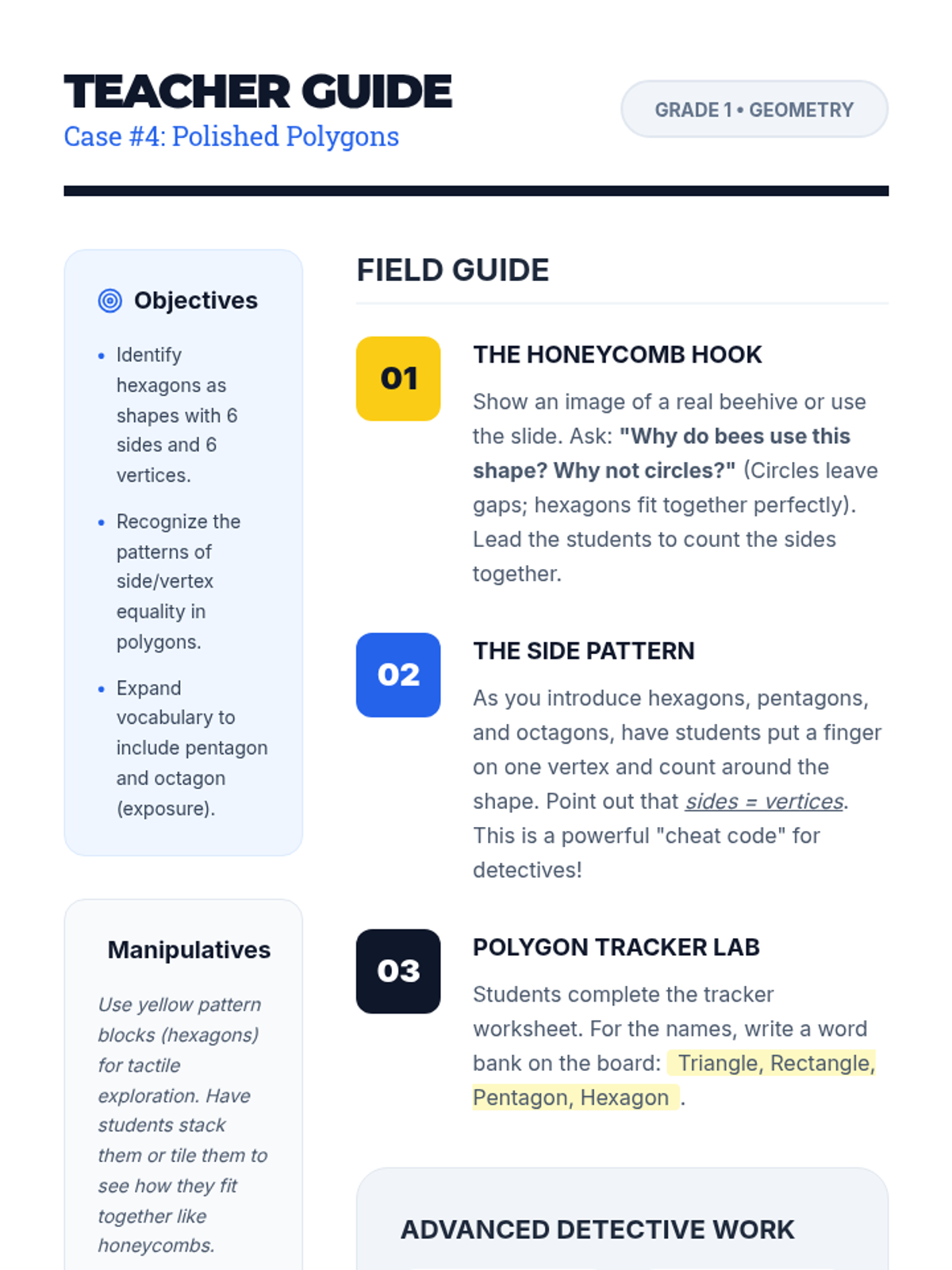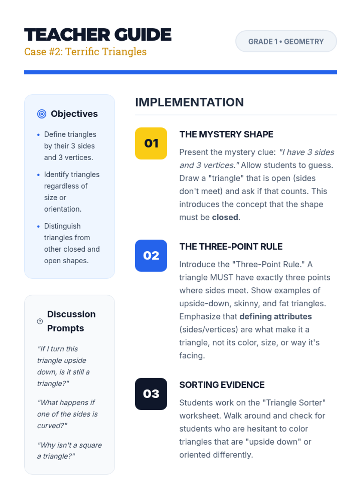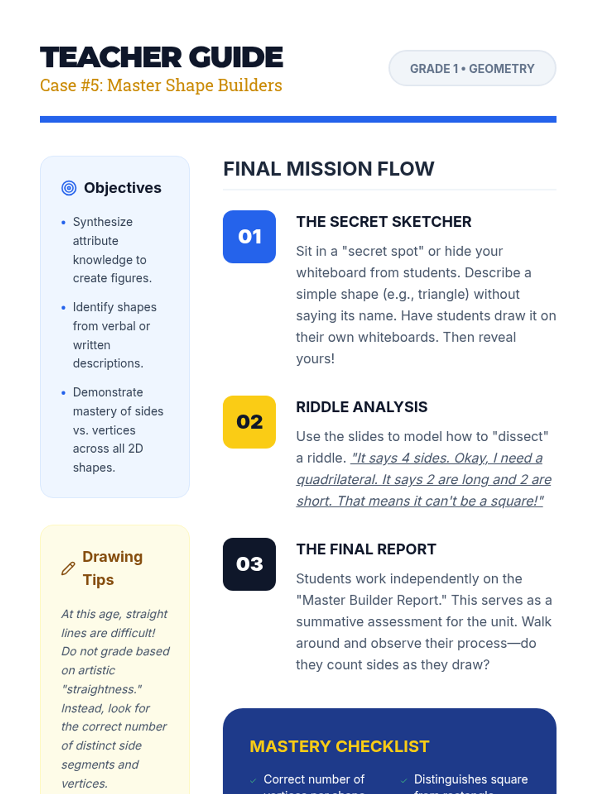 A comprehensive first-grade geometry unit focused on identifying and describing two-dimensional shapes based on their defining attributes like sides and vertices. Students progress from basic recognition to synthesizing attribute knowledge through drawing.