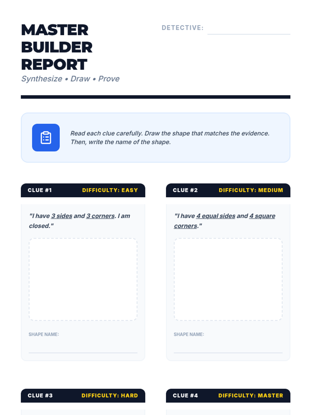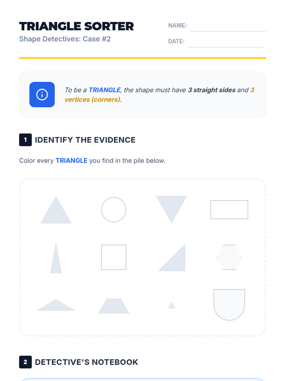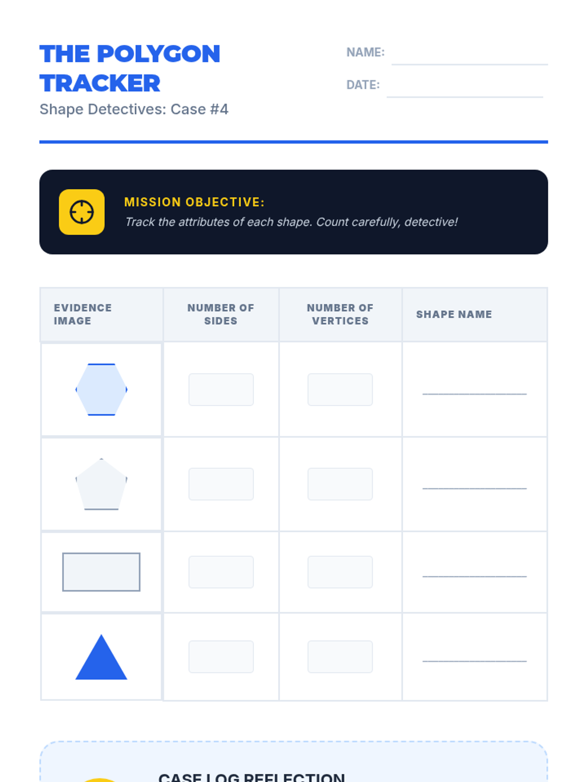 A comprehensive first-grade geometry unit focused on identifying and describing two-dimensional shapes based on their defining attributes like sides and vertices. Students progress from basic recognition to synthesizing attribute knowledge through drawing.