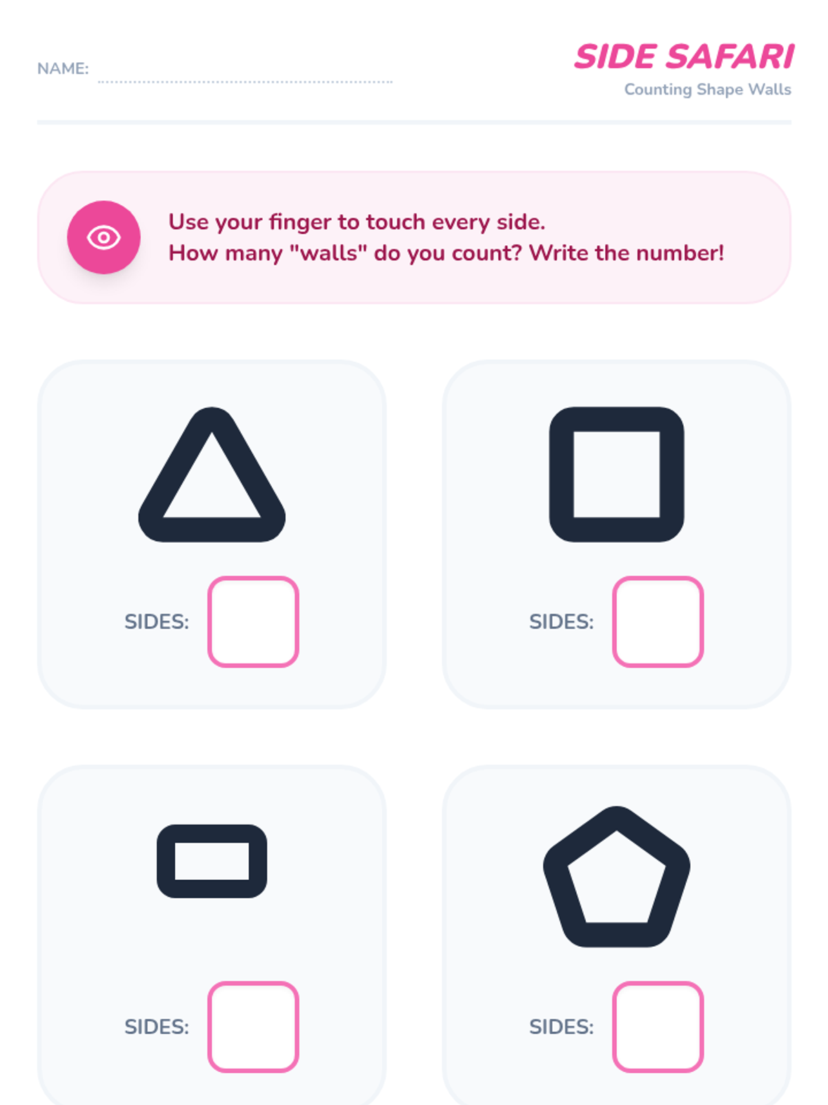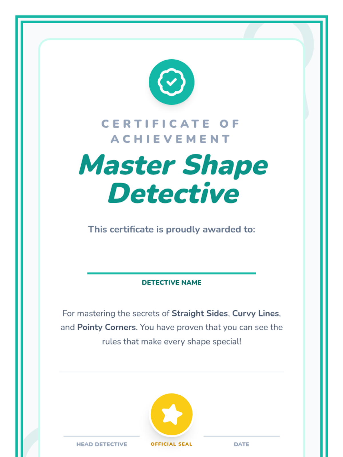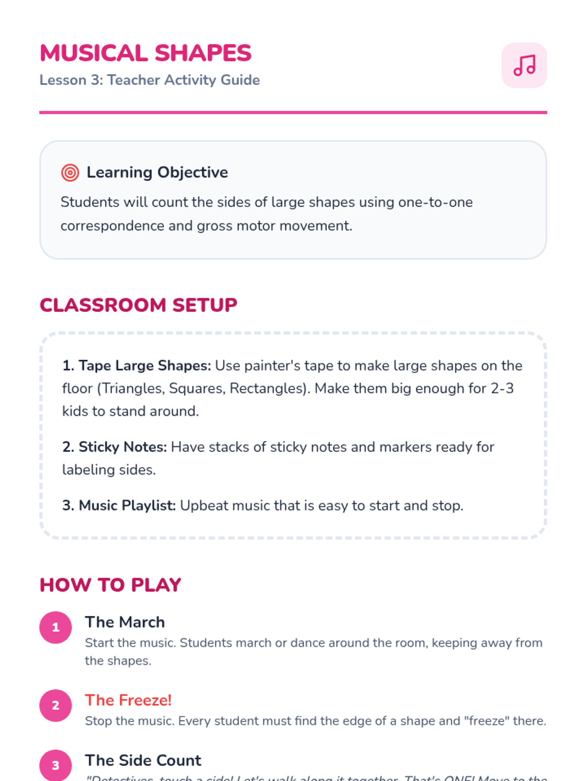 A comprehensive geometry sequence for Pre-K students focusing on identifying, describing, and analyzing shapes by their attributes (sides, corners, curves). Through tactile activities and games, students move from simple recognition to articulating why a shape belongs to a specific category.