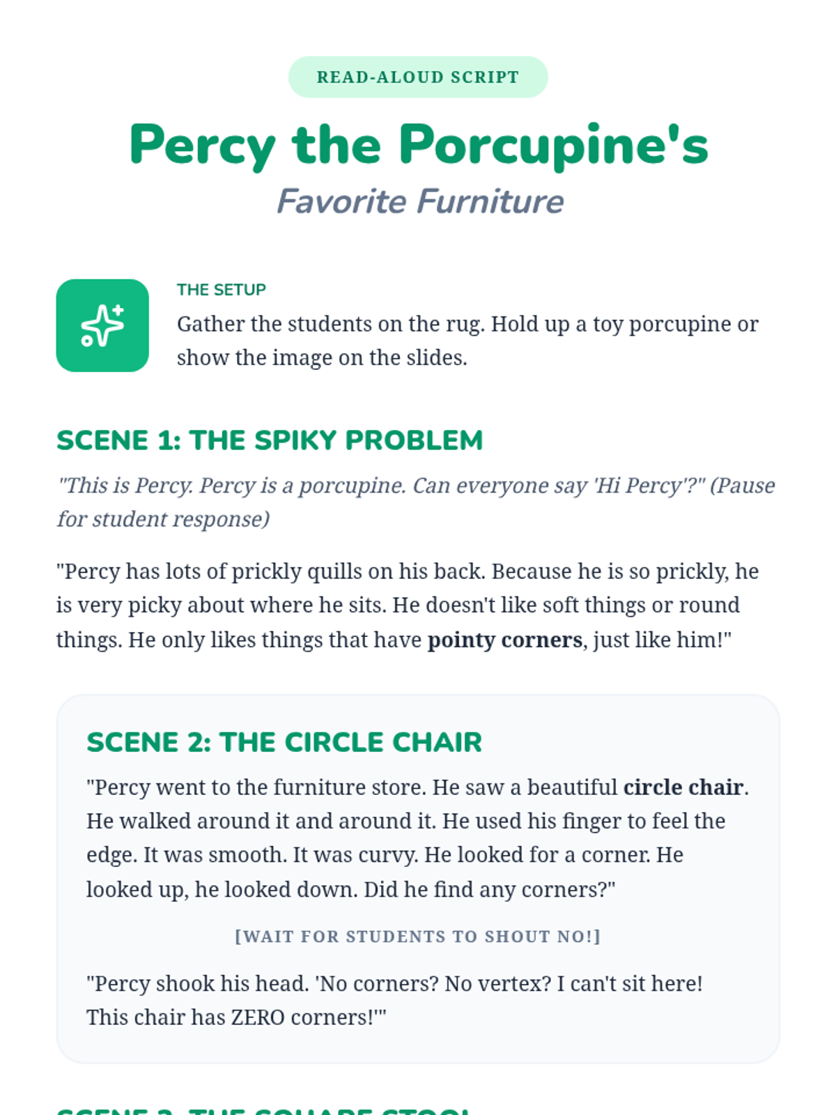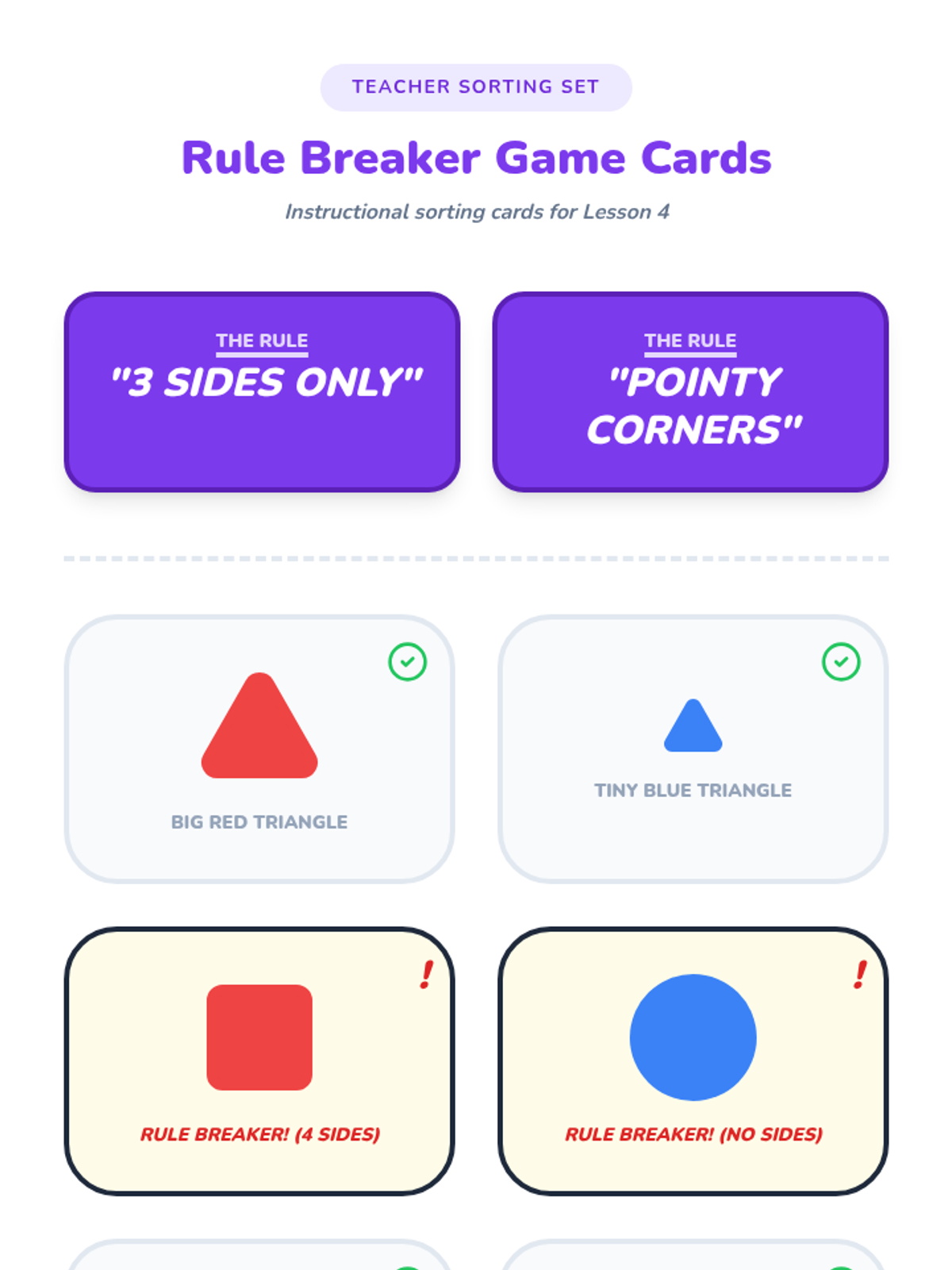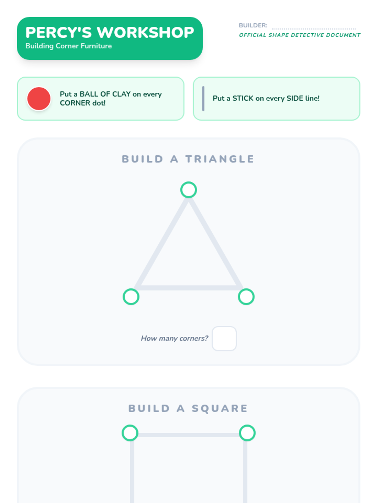 A comprehensive geometry sequence for Pre-K students focusing on identifying, describing, and analyzing shapes by their attributes (sides, corners, curves). Through tactile activities and games, students move from simple recognition to articulating why a shape belongs to a specific category.