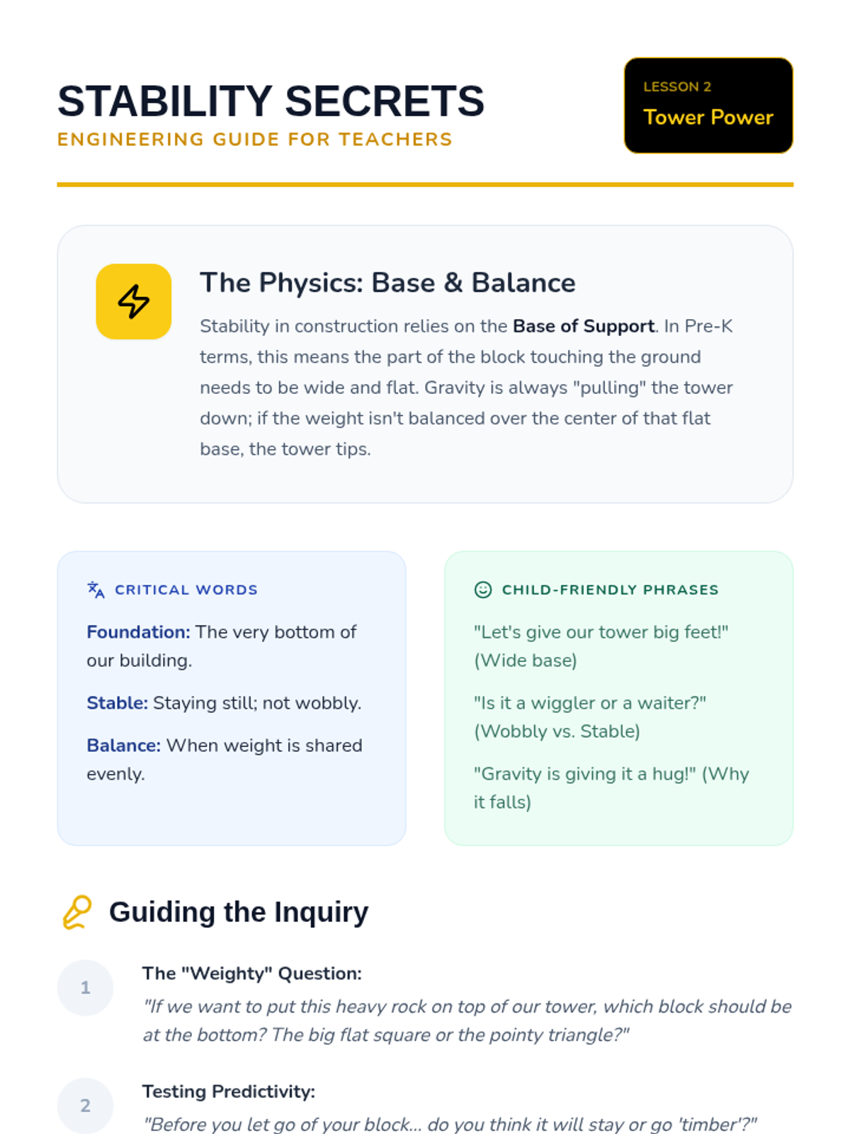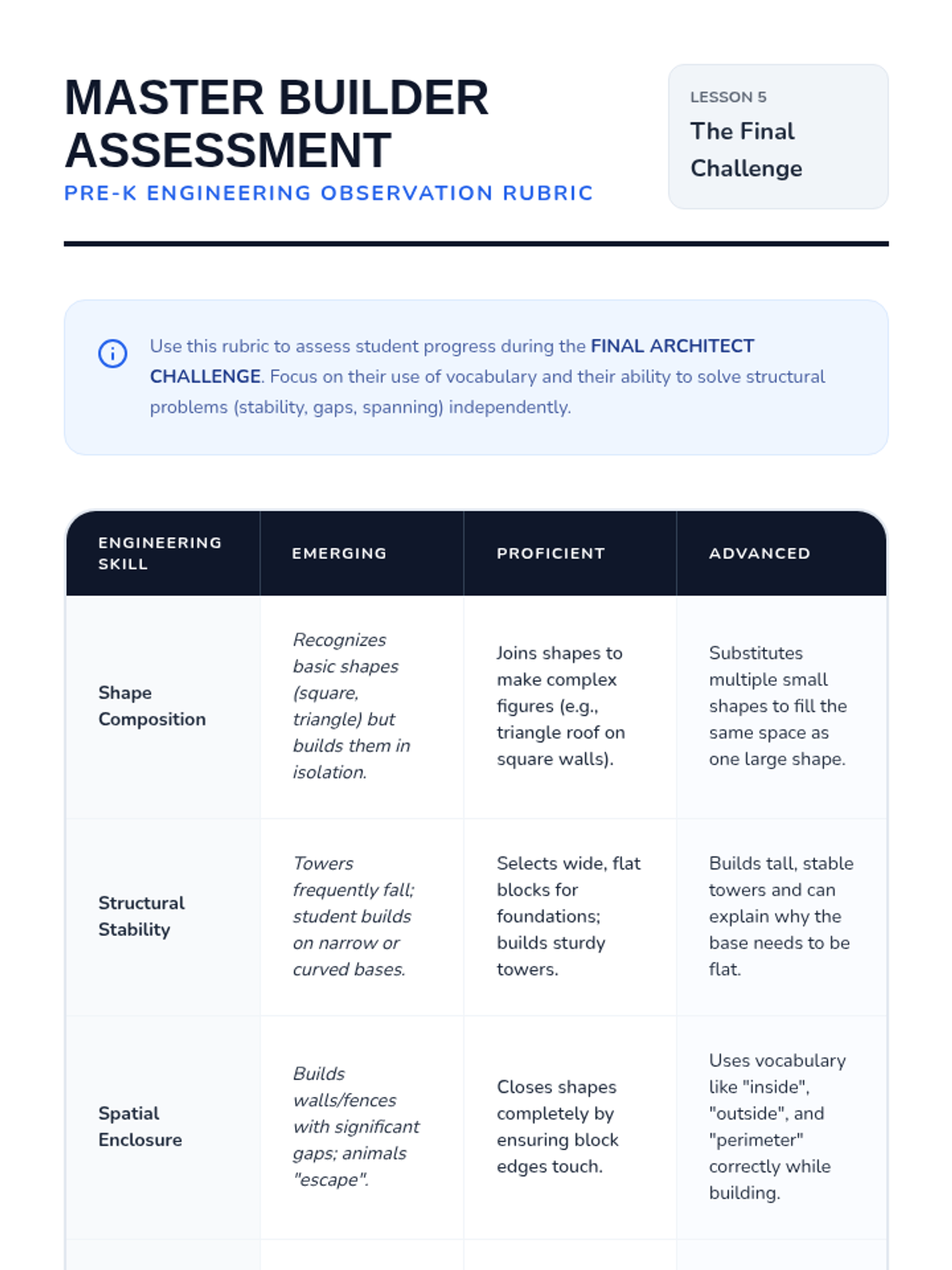 A Pre-K engineering sequence exploring shape composition, stability, and structural design through hands-on block play and spatial reasoning challenges.