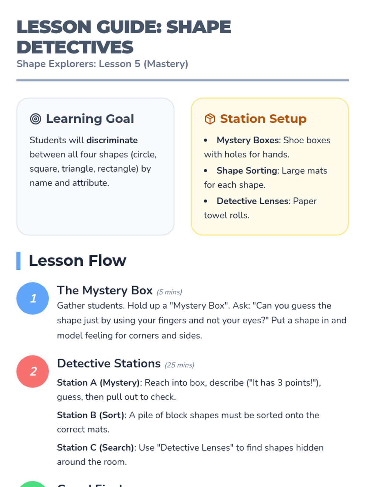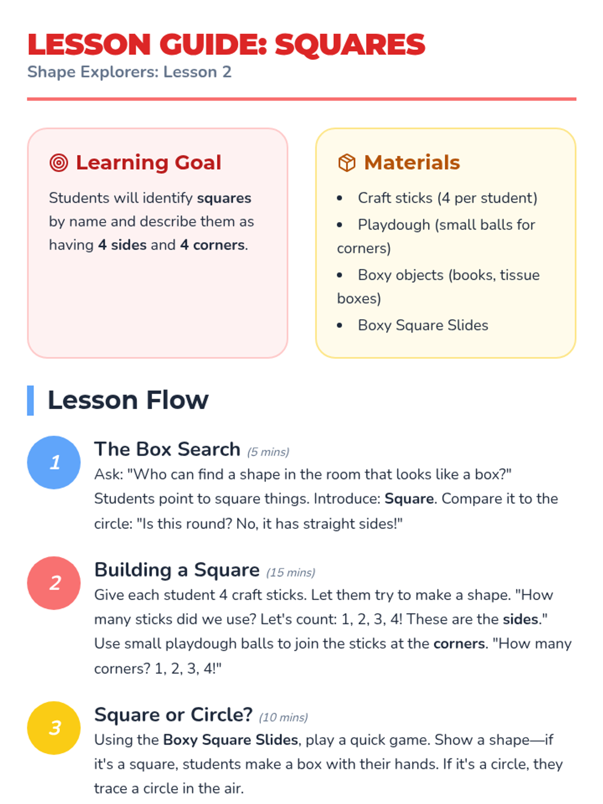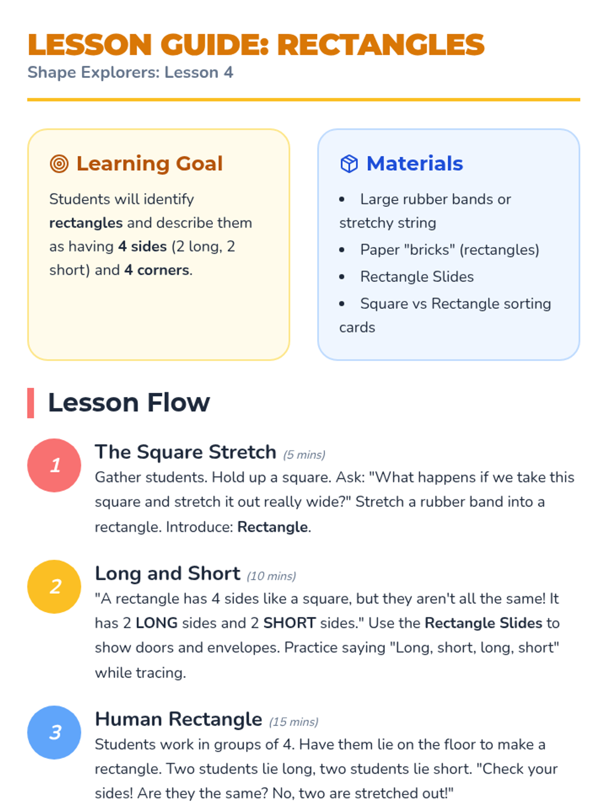 A foundational geometry unit for Pre-K students exploring circles, squares, triangles, and rectangles through hands-on play, visual recognition, and physical movement. Students develop vocabulary for attributes like 'round', 'side', and 'corner' while learning to distinguish between common 2D shapes.