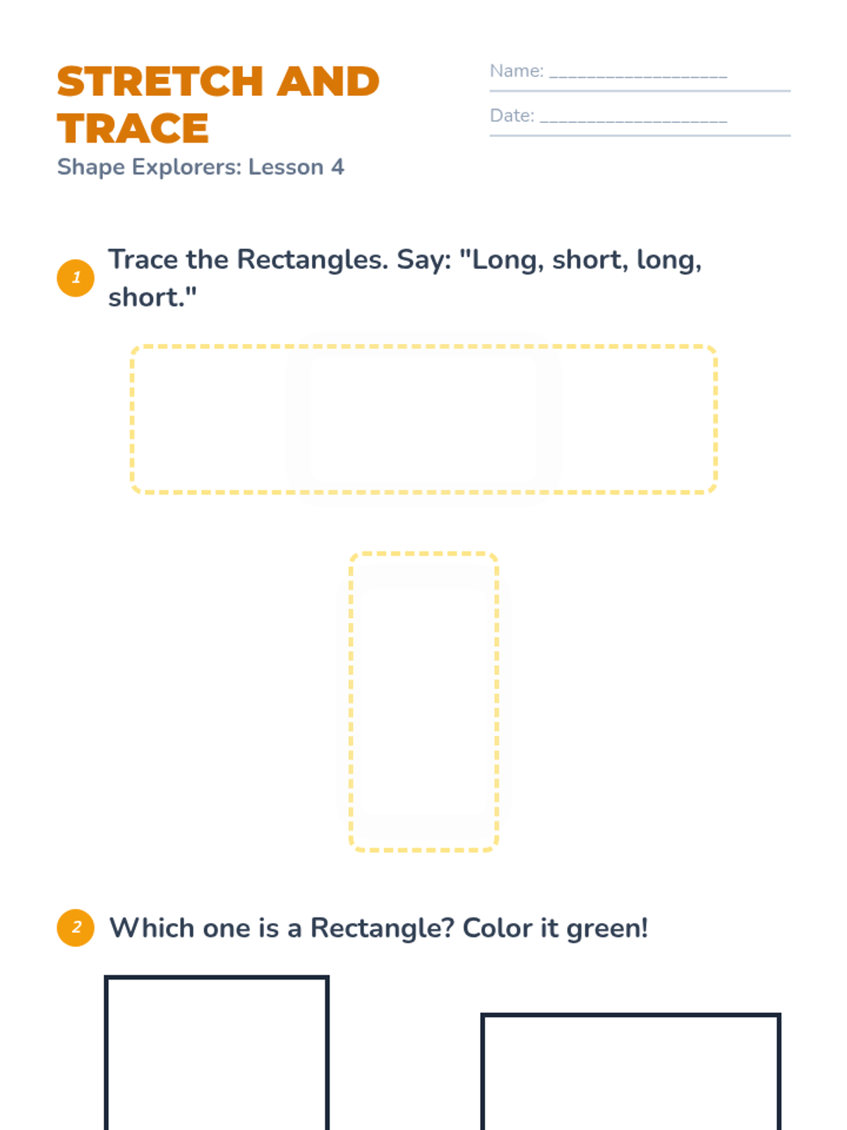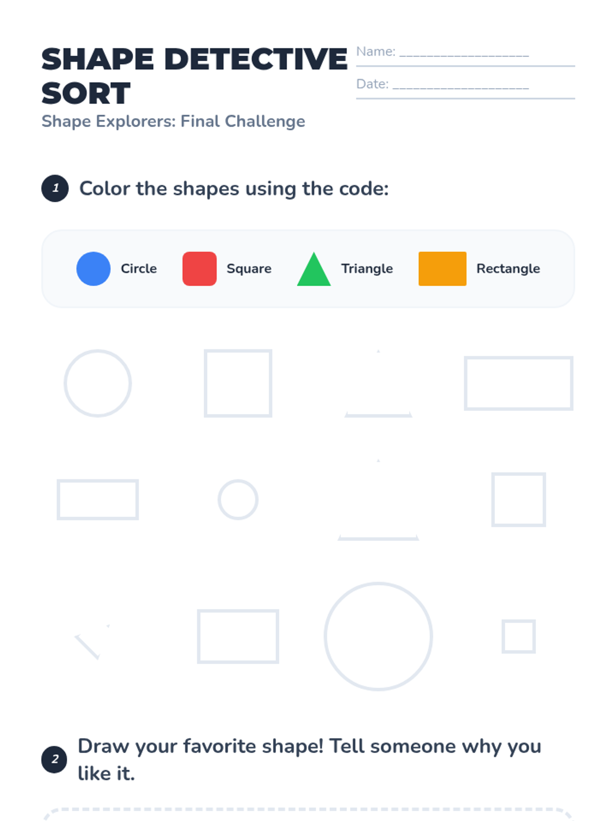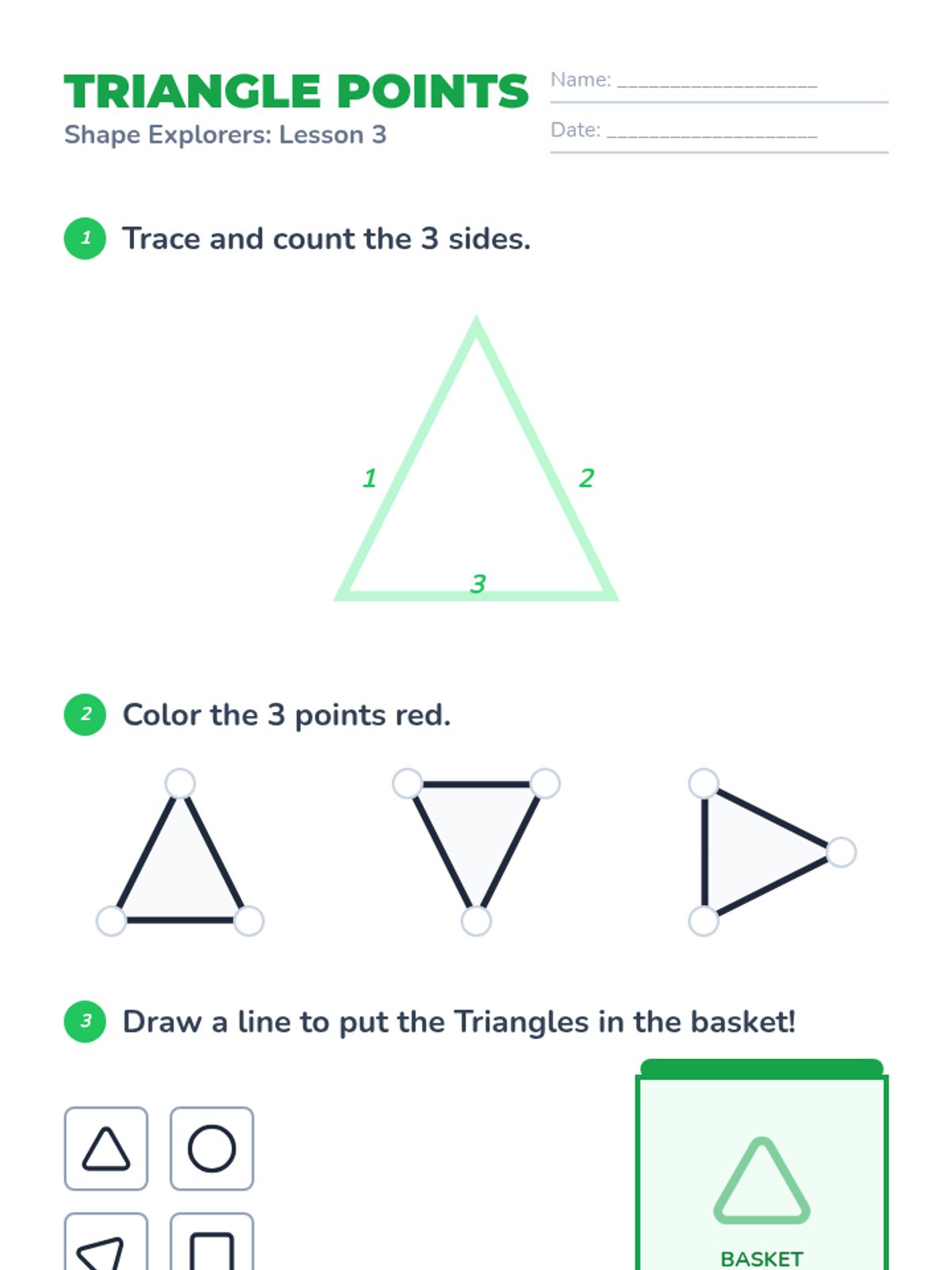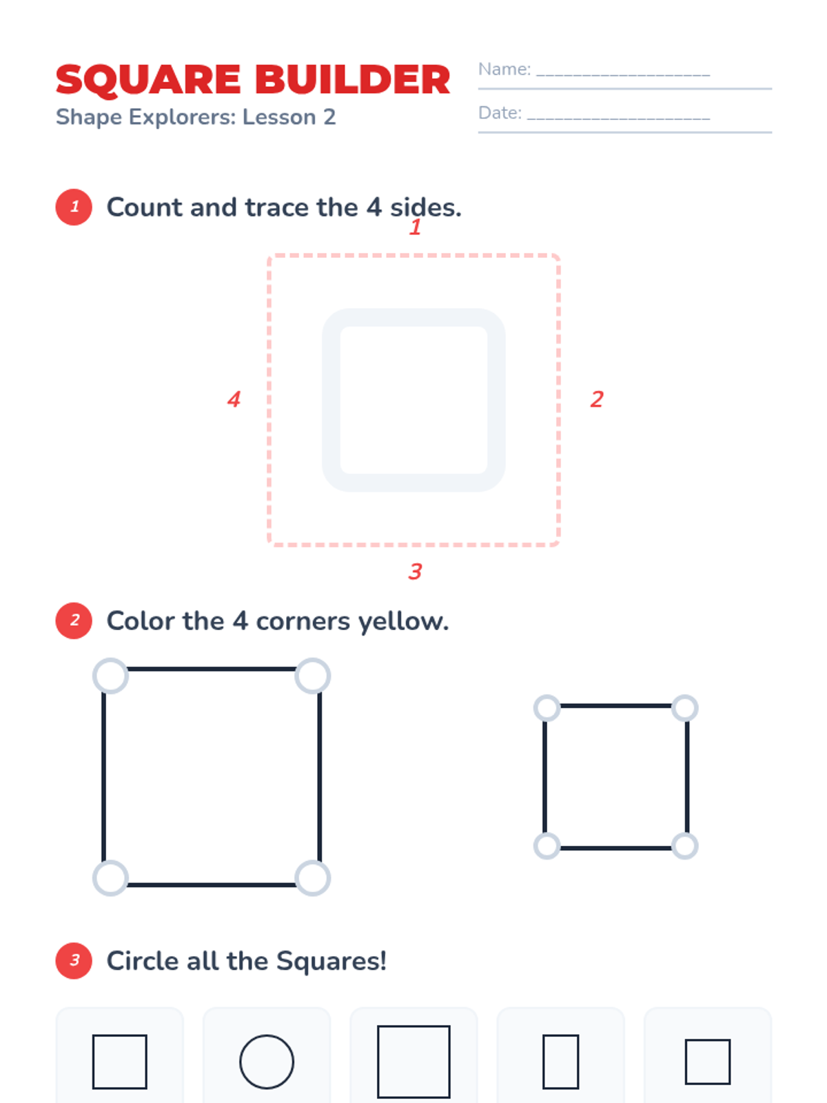 A foundational geometry unit for Pre-K students exploring circles, squares, triangles, and rectangles through hands-on play, visual recognition, and physical movement. Students develop vocabulary for attributes like 'round', 'side', and 'corner' while learning to distinguish between common 2D shapes.