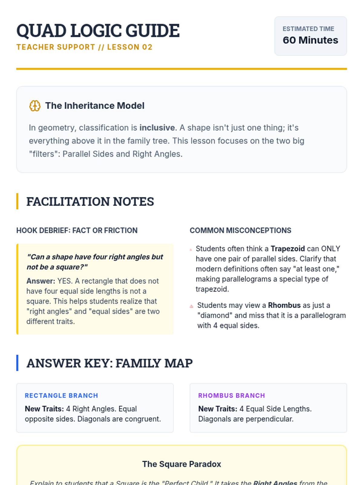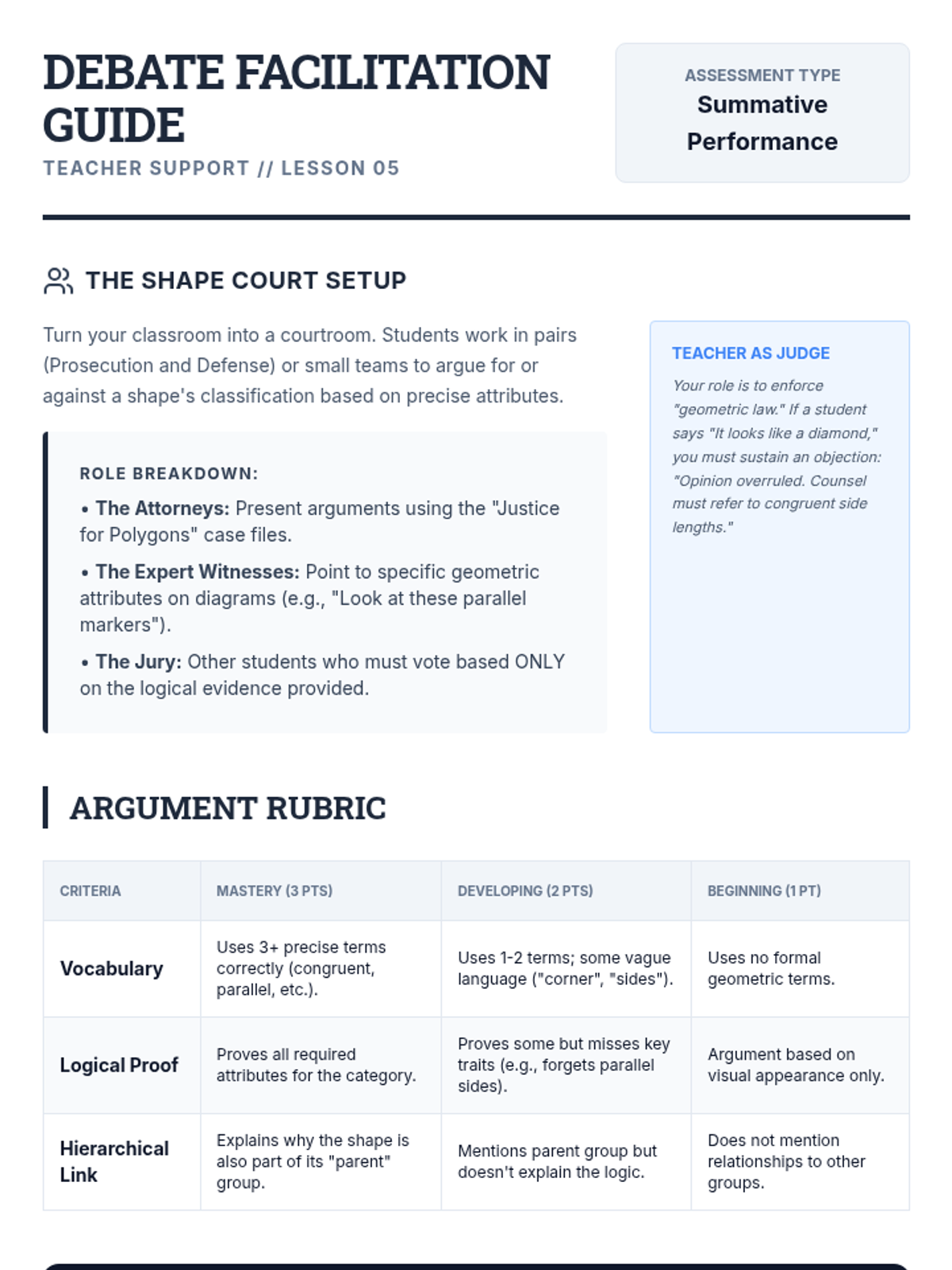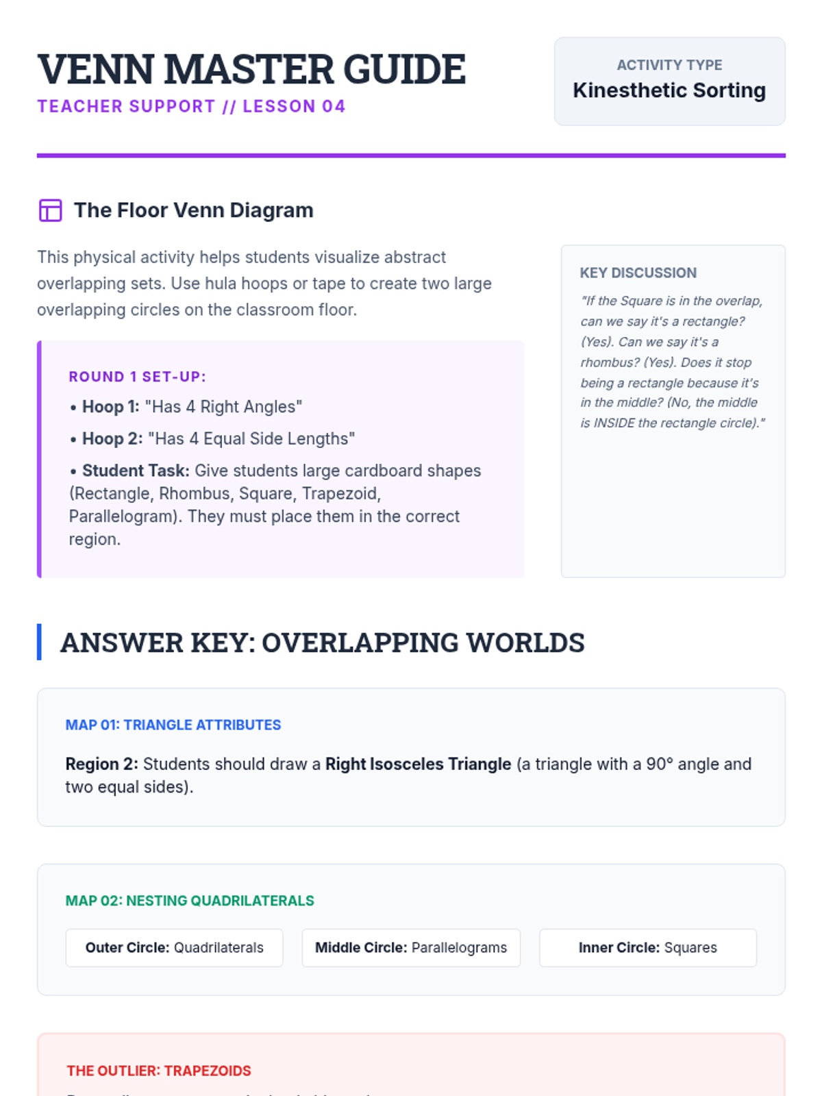This inquiry-driven sequence guides 5th-grade students through the logical hierarchy of two-dimensional figures, focusing on triangles and quadrilaterals. Students investigate properties, construct Venn diagrams, and defend geometric definitions through argumentation and debate.