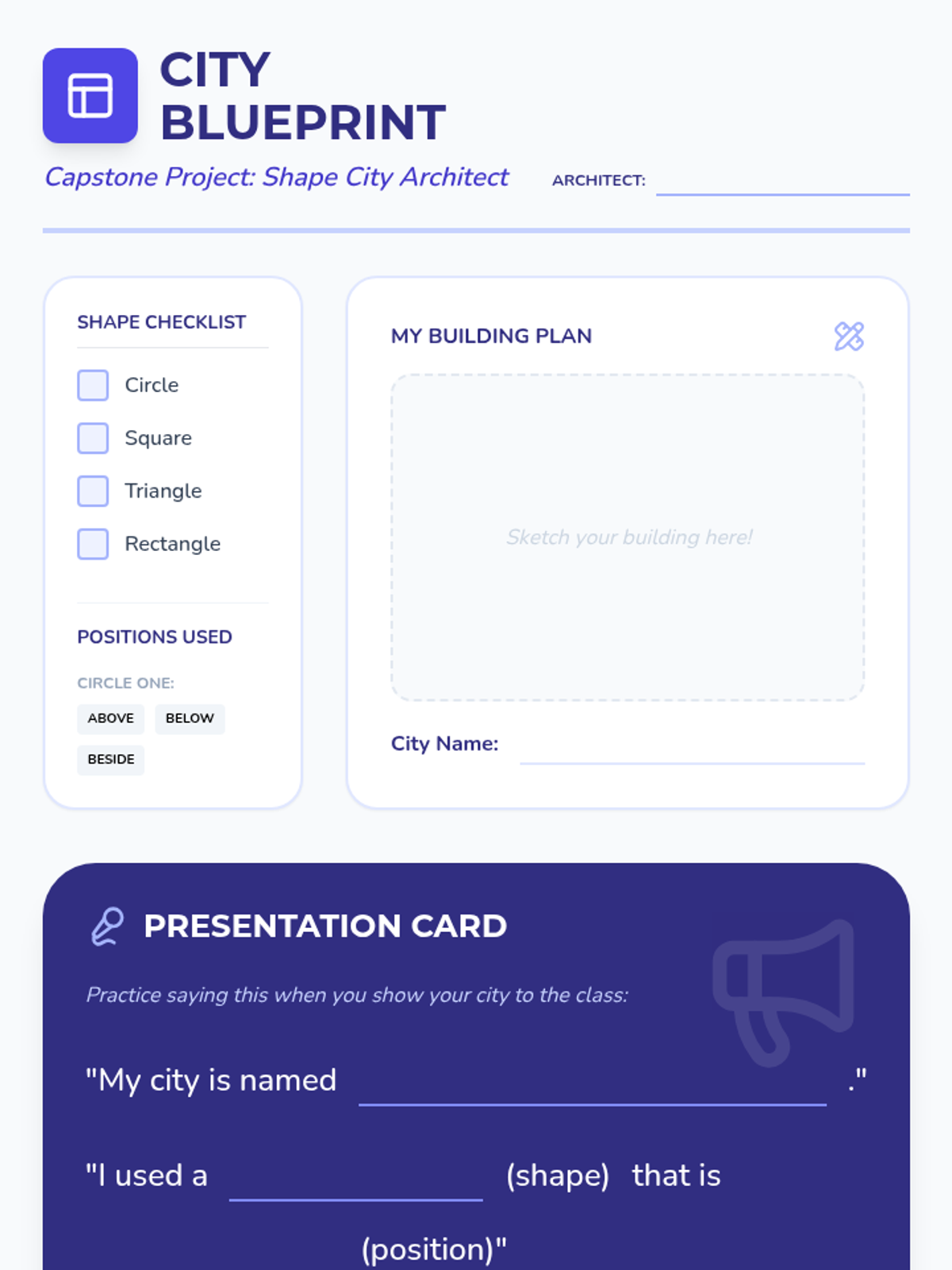 A Kindergarten geometry project where students transition from classroom observation to identifying shapes in nature and the real world, culminating in building a geometric city. Students learn to identify 2D and 3D shapes and use positional language to describe their locations.