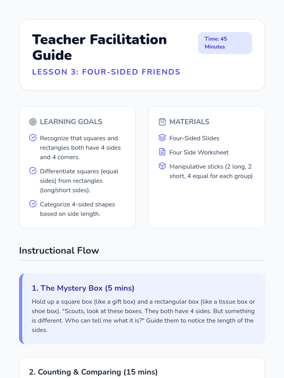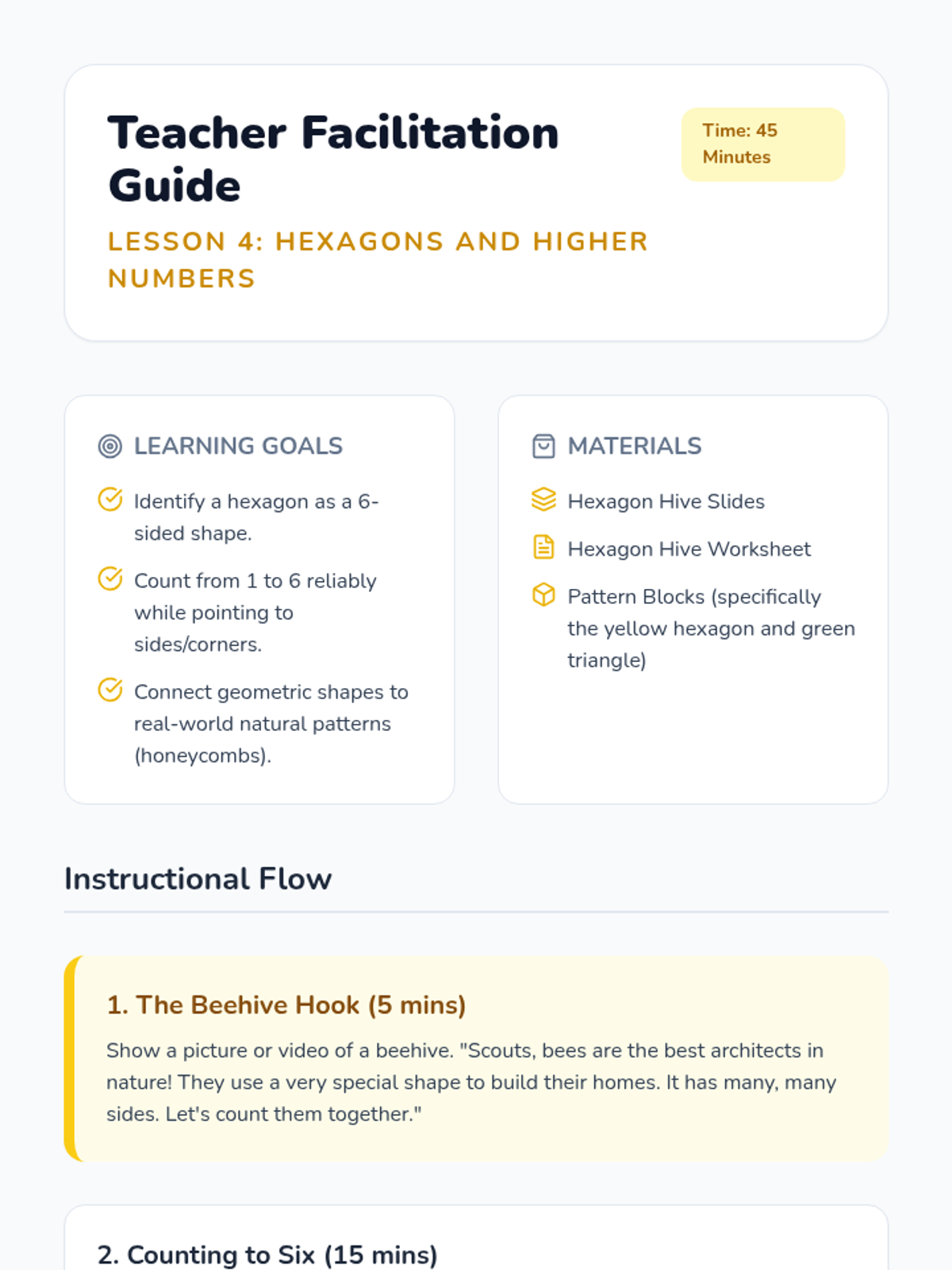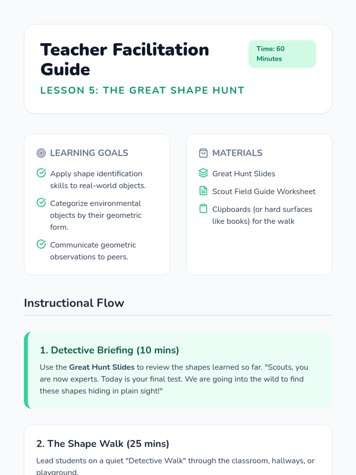 A foundational geometry sequence for Kindergarteners focused on identifying and naming 2D shapes (circles, triangles, squares, rectangles, hexagons) through tactile exploration and real-world application.