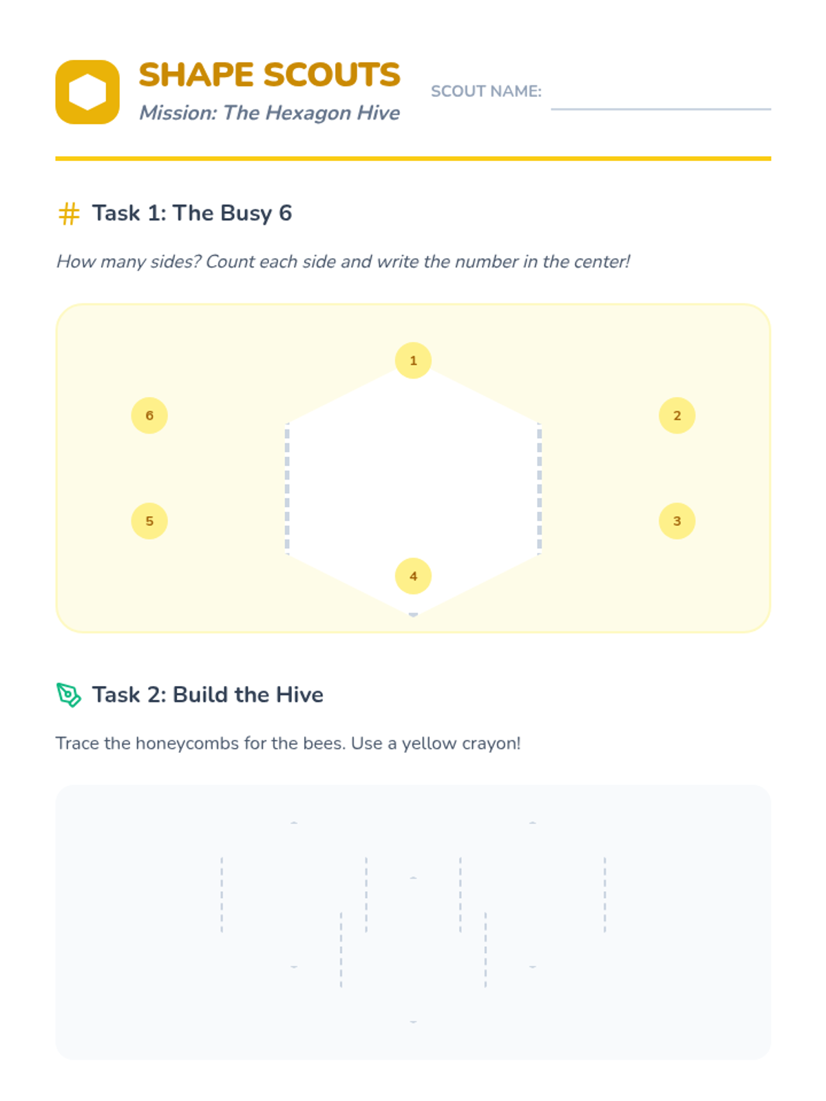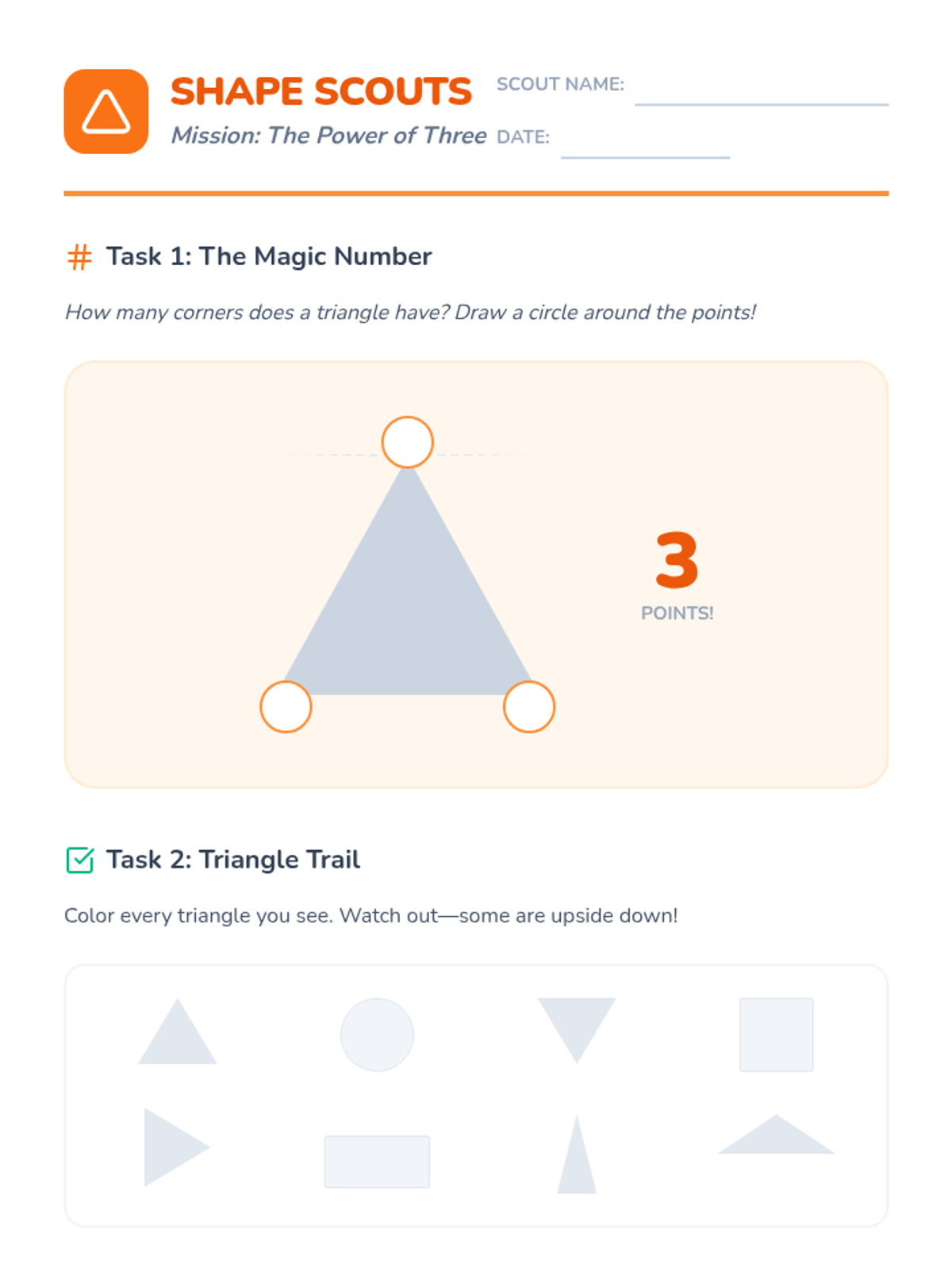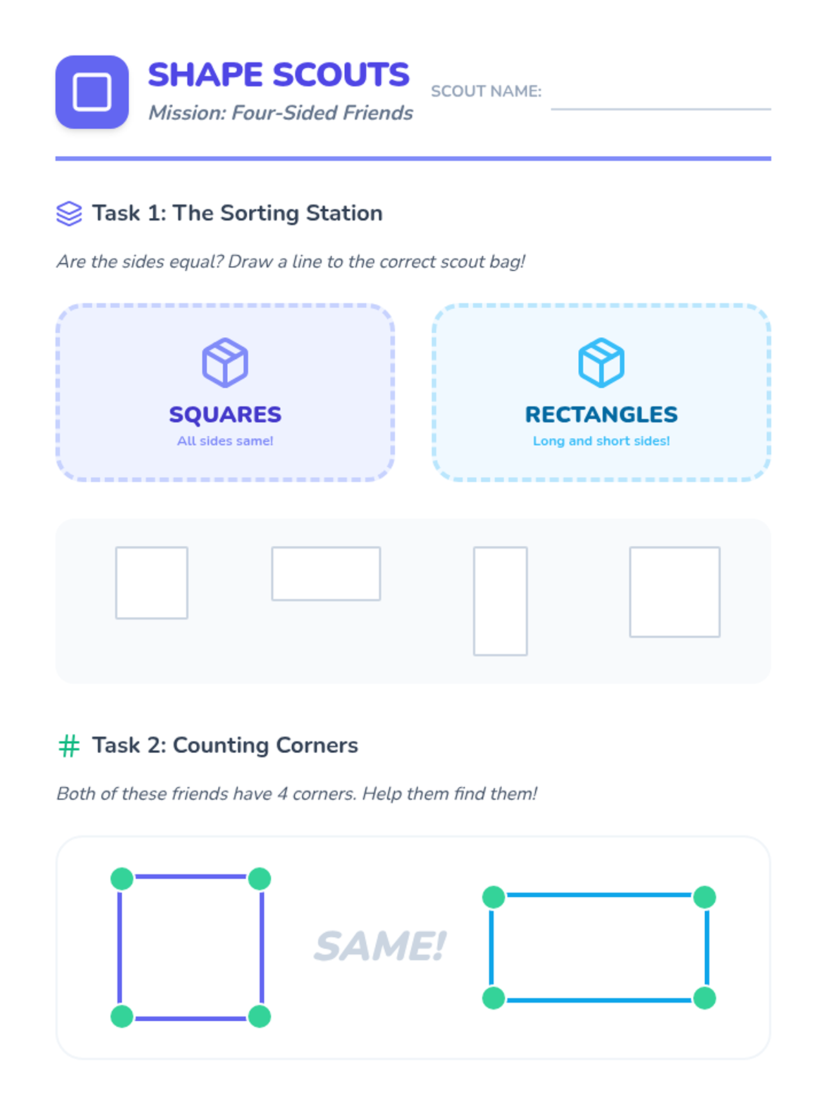 A foundational geometry sequence for Kindergarteners focused on identifying and naming 2D shapes (circles, triangles, squares, rectangles, hexagons) through tactile exploration and real-world application.