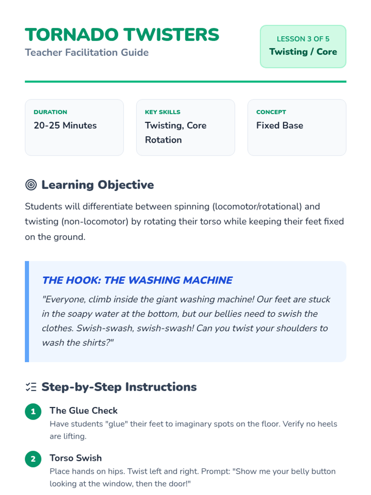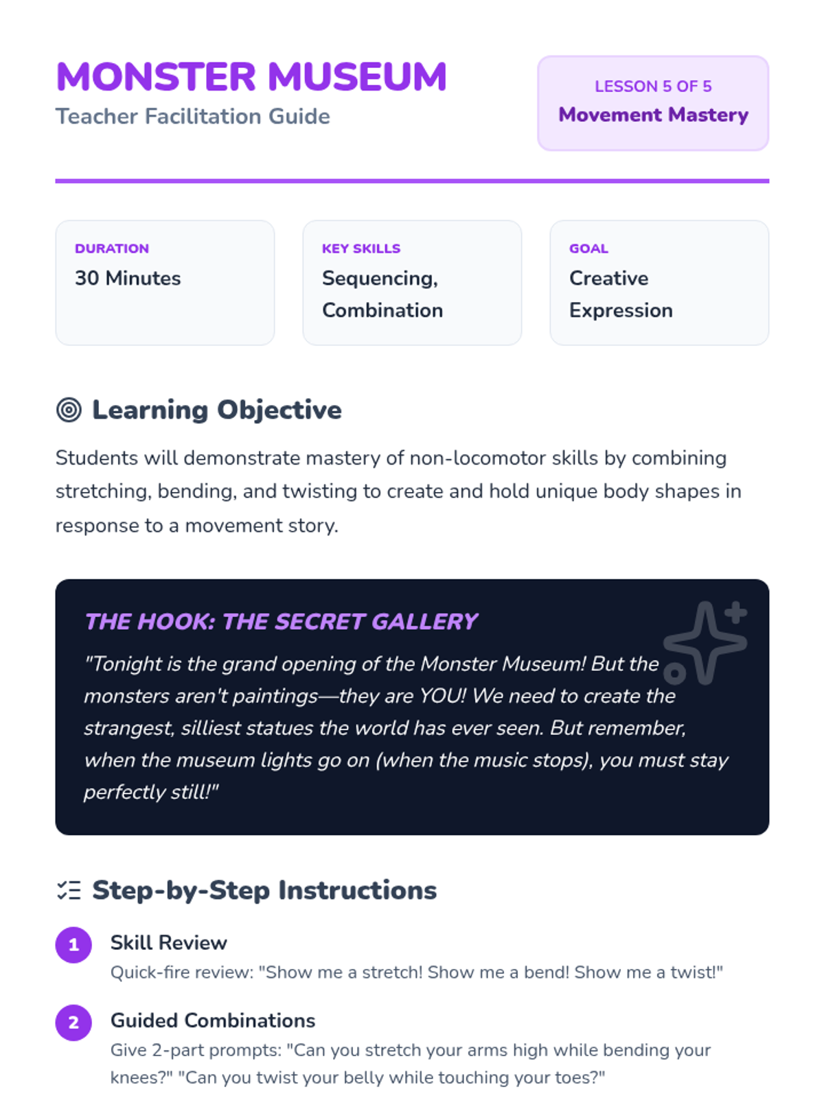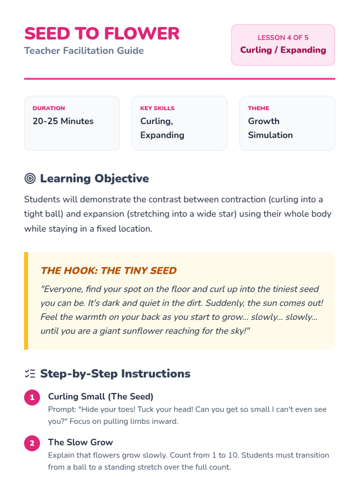 This sequence introduces Pre-K students to non-locomotor skills, focusing on flexibility and body shapes. Students explore stretching, bending, twisting, and curling through imaginative play and movement exercises.